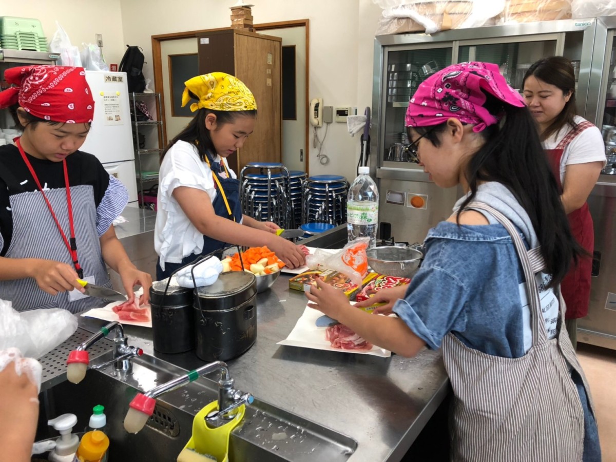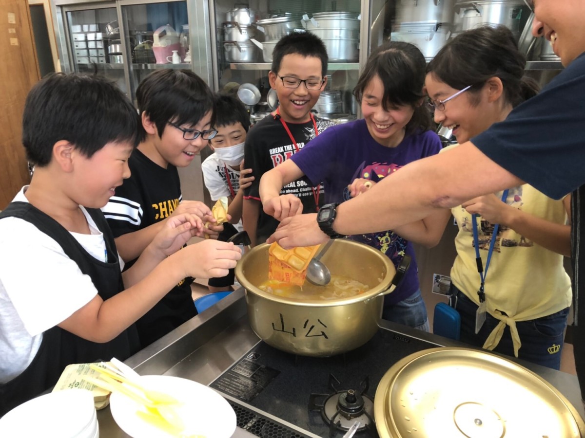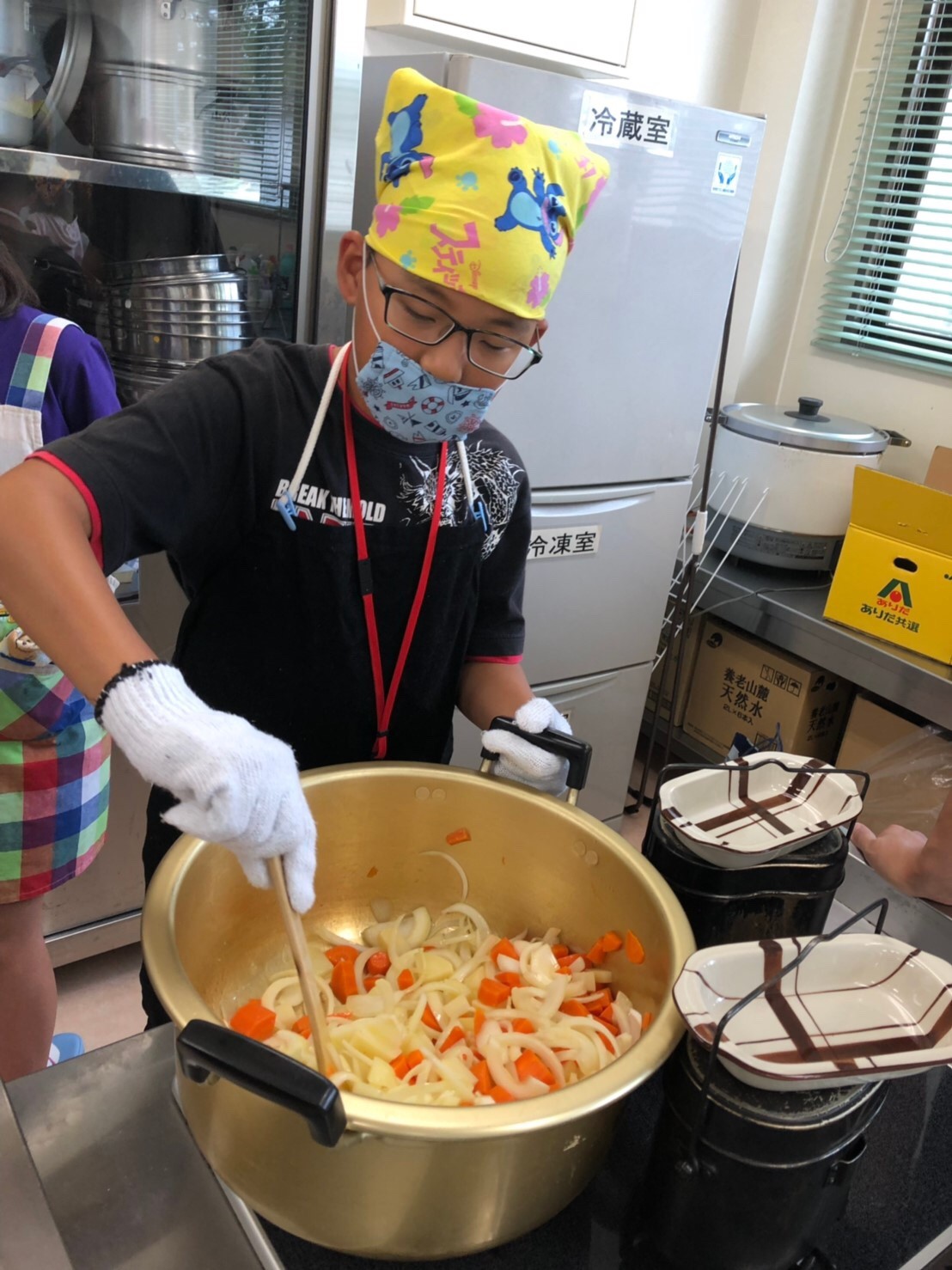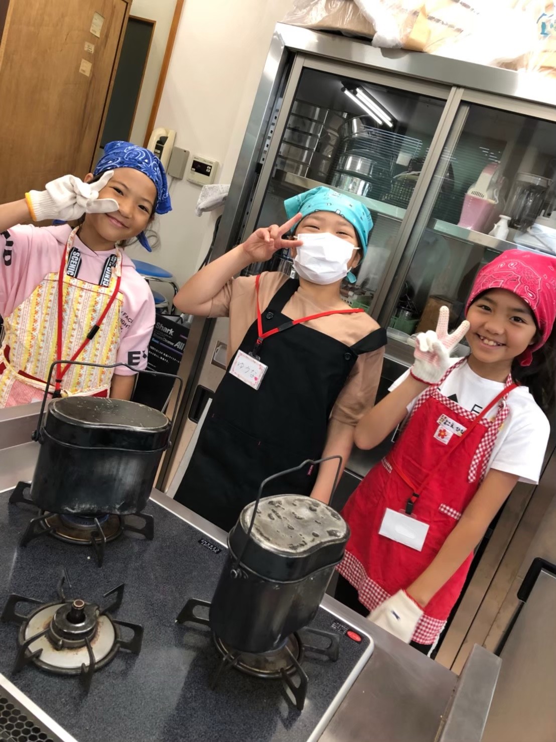 さすが高学年の子どもたち!第1回の養成講座での学習を生かし、自分たちで考えて順序良く飯ごう炊飯ができました。カレー作りでは、野菜をどの順番に炒め煮ていくか、また班ごとに選んだ好みのルーをどんな分量で作るか、子どもたちで相談しながら考え、実践できていた事に少しずつリーダーらしく成長している姿がみられました。昼食後は、今話題のタピオカドリンク作りをみんなで楽しみ、その後、子どもと大人全員参加でゲームをし、コミュニケーションを図りました。