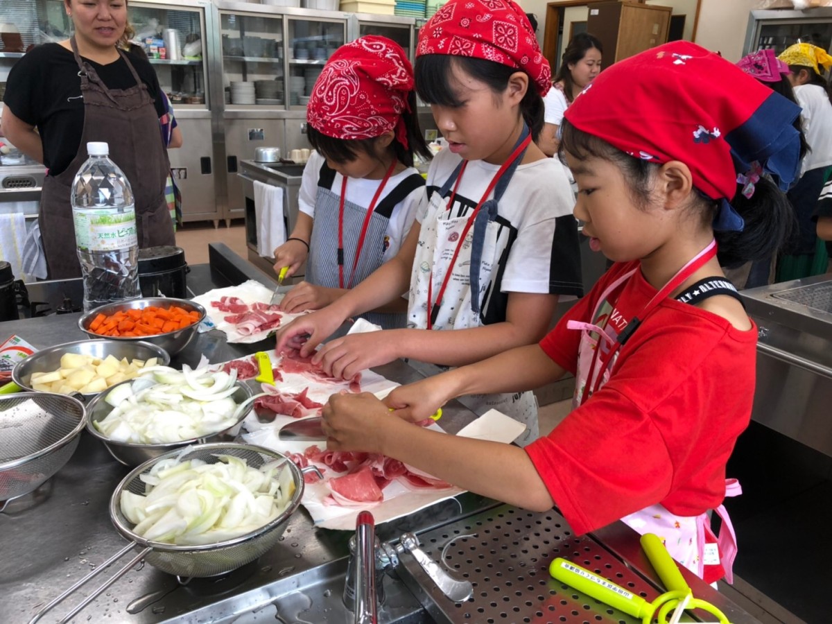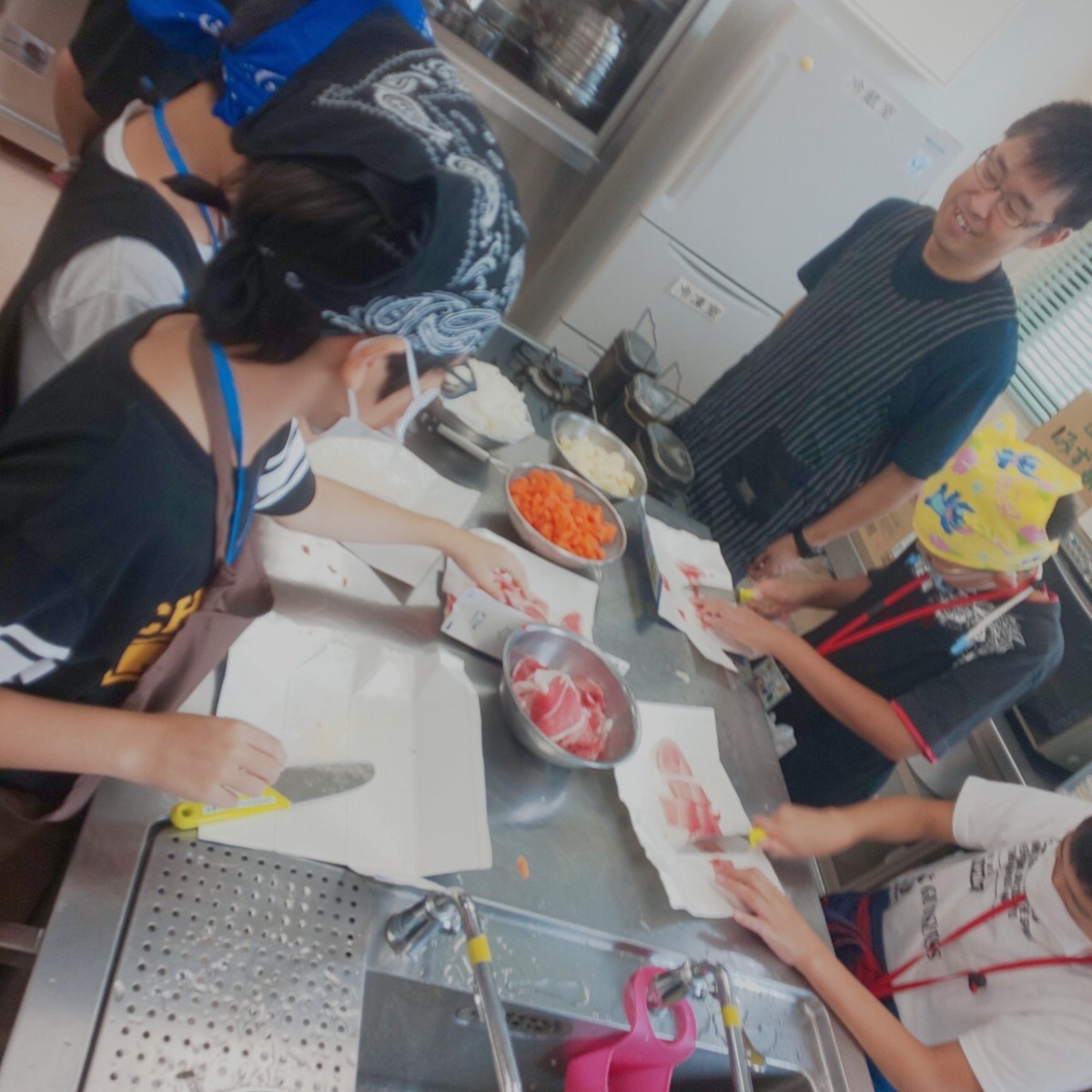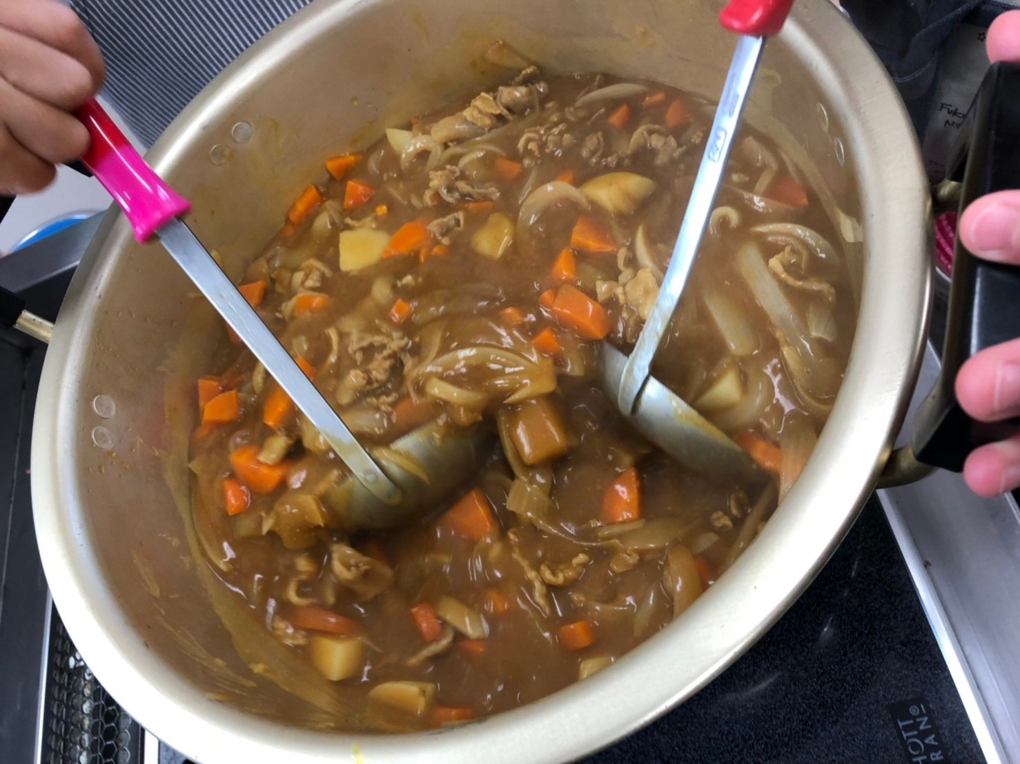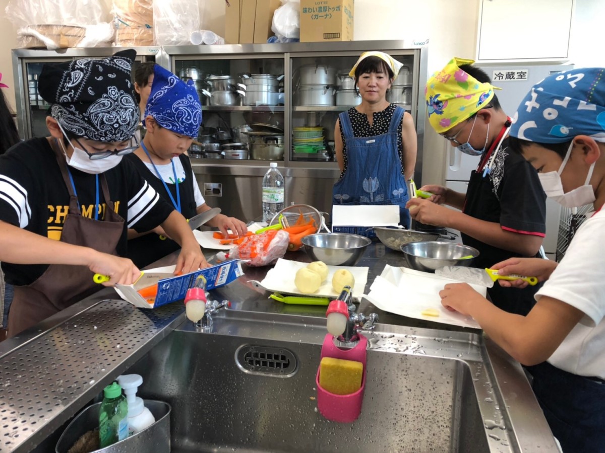 さすが高学年の子どもたち!第1回の養成講座での学習を生かし、自分たちで考えて順序良く飯ごう炊飯ができました。カレー作りでは、野菜をどの順番に炒め煮ていくか、また班ごとに選んだ好みのルーをどんな分量で作るか、子どもたちで相談しながら考え、実践できていた事に少しずつリーダーらしく成長している姿がみられました。昼食後は、今話題のタピオカドリンク作りをみんなで楽しみ、その後、子どもと大人全員参加でゲームをし、コミュニケーションを図りました。