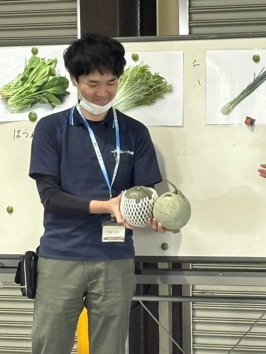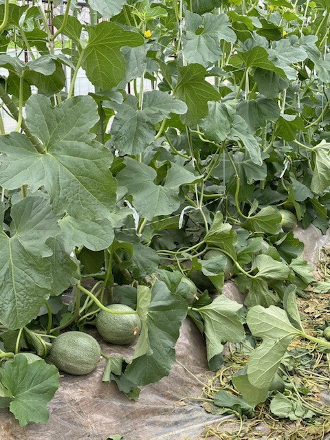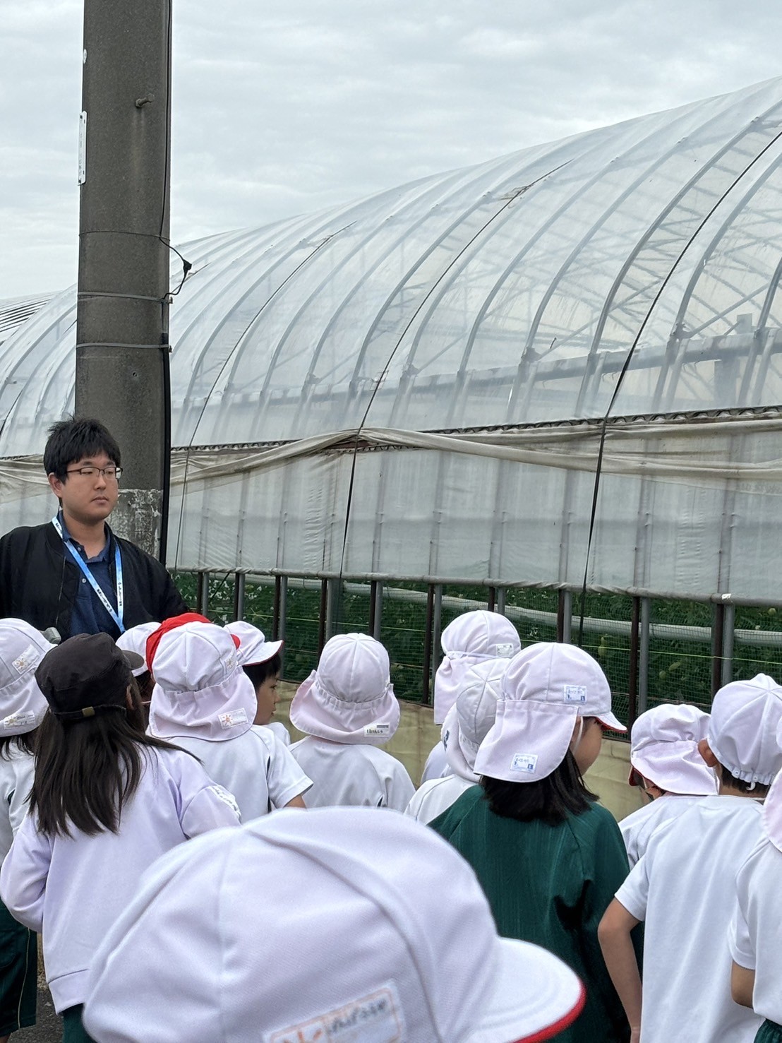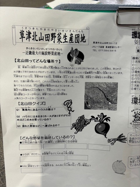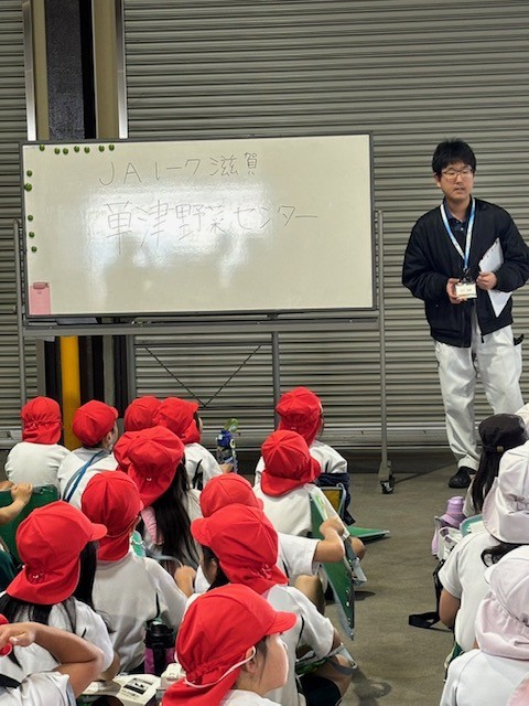 5月15日(水)3年生が北山田町にある野菜センターを見学しました。初めにセンター近くのハウスの中を見せてもらいました。ハウスの中ではトマトや水菜などの野菜がスクスク育っていて野菜のパワーが伝わってきそうでした。中でも草津メロンがゴロゴロ実っていて子ども達の目もキラキラ輝いてました。メロンハウスの中には受粉のためミツバチが入れられていることも知りました。ハウス見学の後はセンターの方々からお話を聞いて、北山田には約2000棟のハウスがあり、琵琶湖からの水で野菜が育てられ、収穫した野菜を市場に運んで小売店に出されるそうです。最後にはセンターにある大きな大きな冷蔵庫にみんなで入りました。