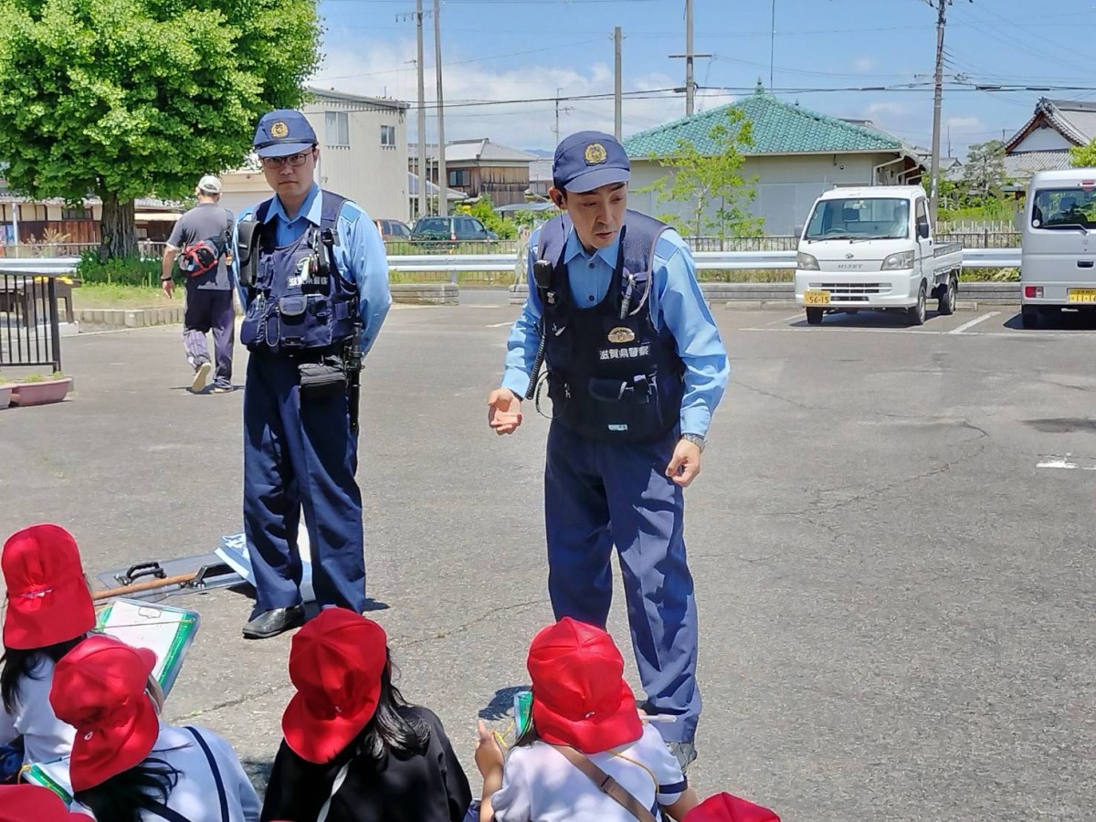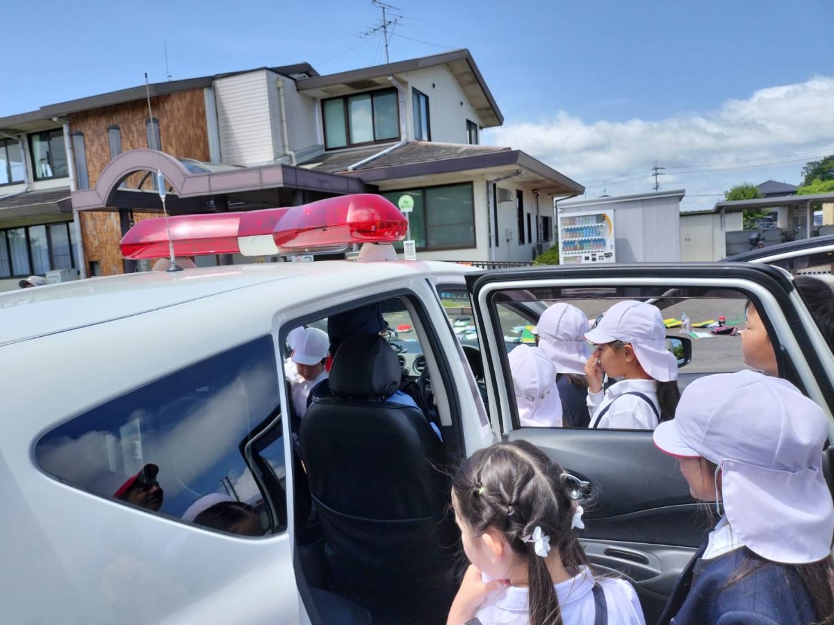 5月20日(月)、2年生が【町たんけん】の活動として、山田交番と山田まちづくりセンターを訪れ、見学させていただきました。初めに交番の中に入らせてもらった後、センター前の駐車場で山田交番のお巡りさん(玉川さん、大杉さん)から交番の仕事についてお話を聞きました。地域をパトカーでパトロールすることや、老人家庭の訪問、事件や困っている人の対応など、地域の安全のために仕事をしていることを知りました。実際にパトカーや警察手帳や手錠、警棒などを見せてもらい、子ども達は興味津々の様子でした