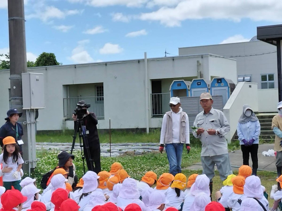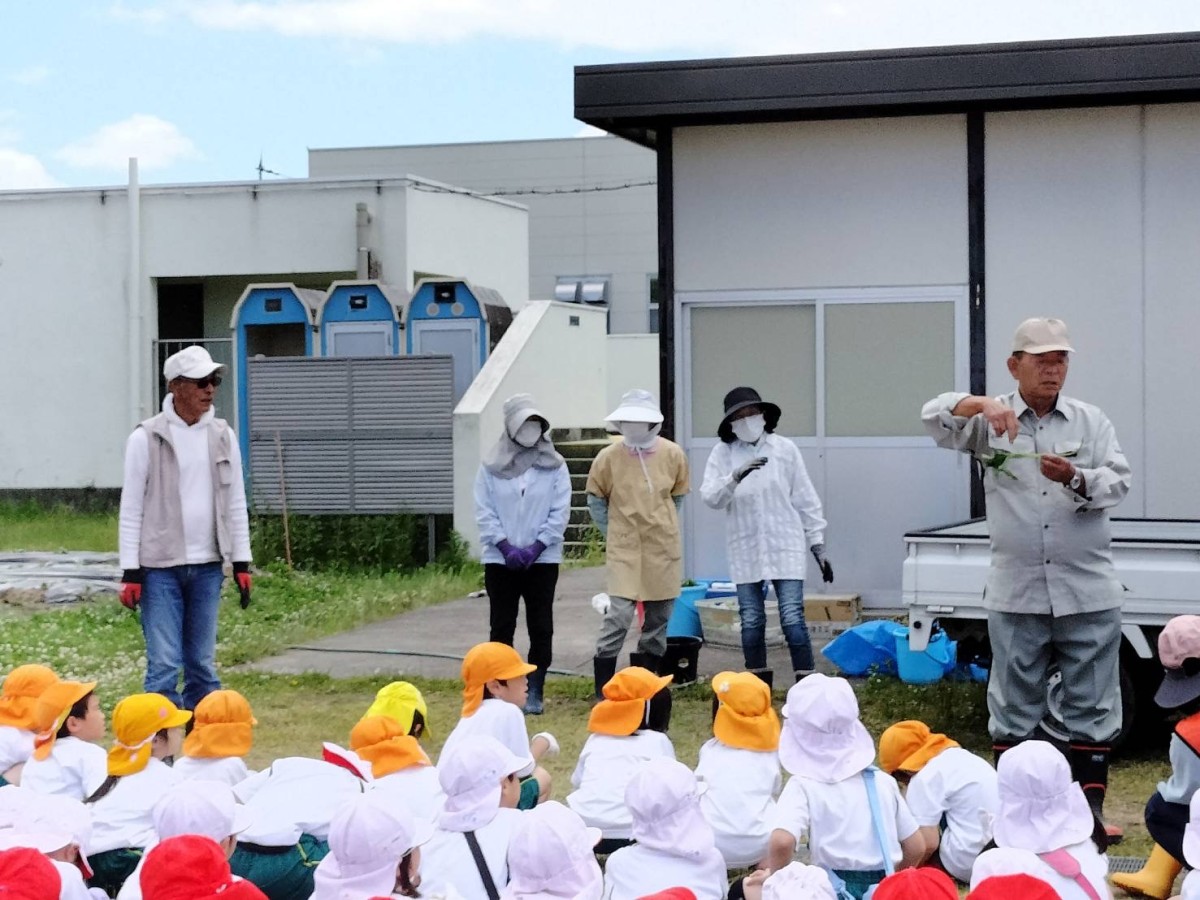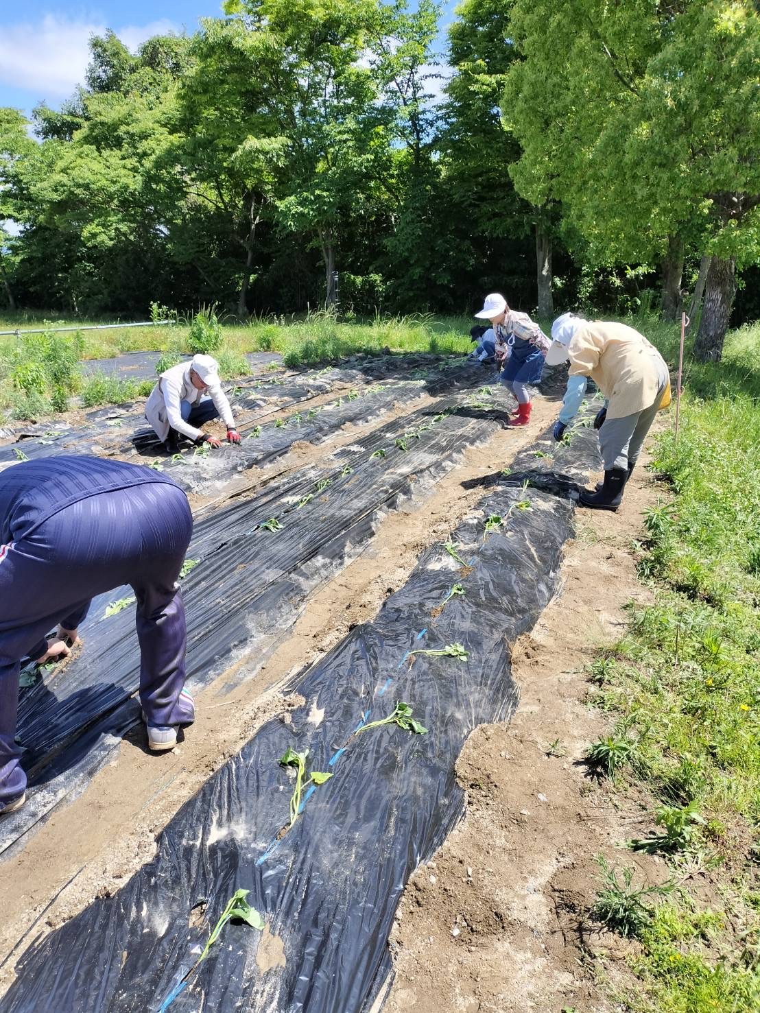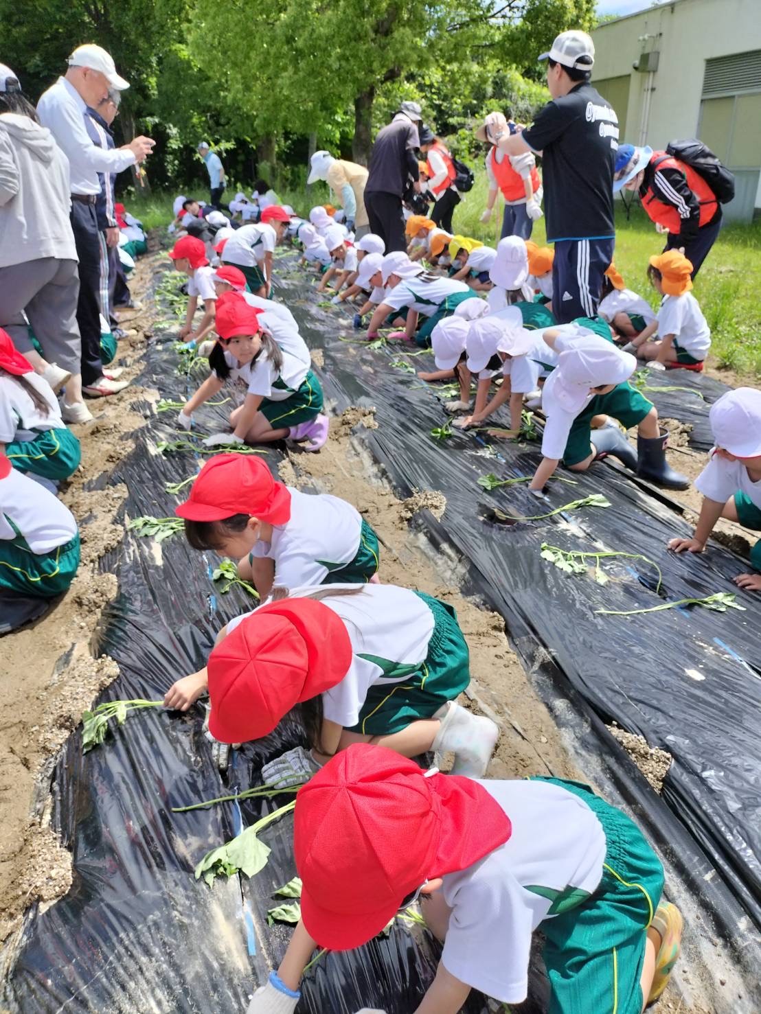 山田園小教育後援会の久泉会長さんから「土を掘り、苗を寝かせて、その上に土をかぶせる」ということを教えていただき、慣れない手付きで植えていました。植え終わった後は、少しずつ手直しが必要でしたが、4人のボランティアさんが手伝ってくださって、無事に植え終わりました。