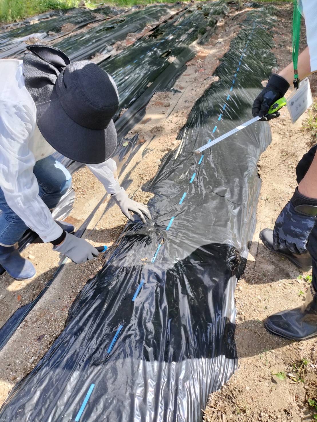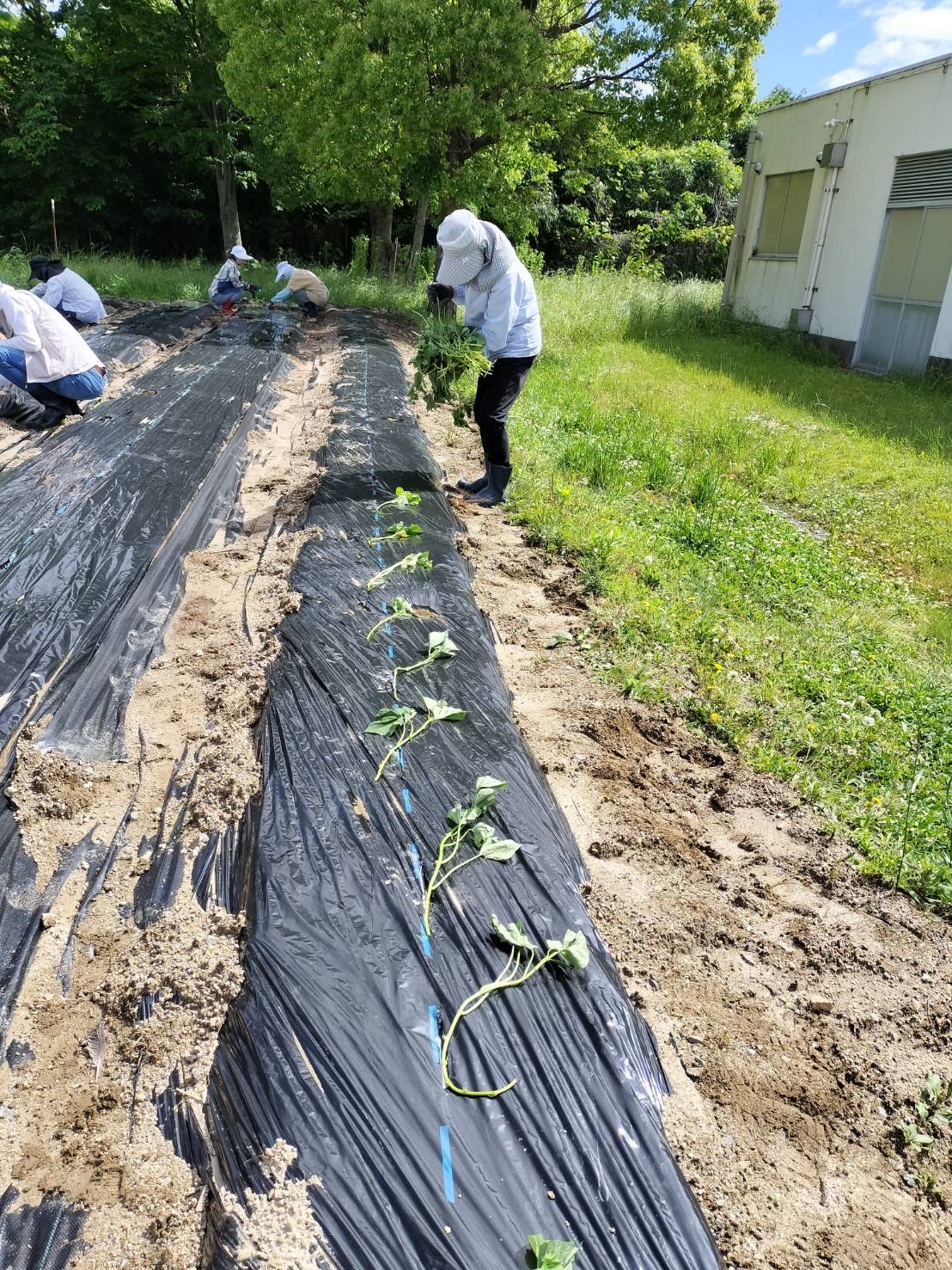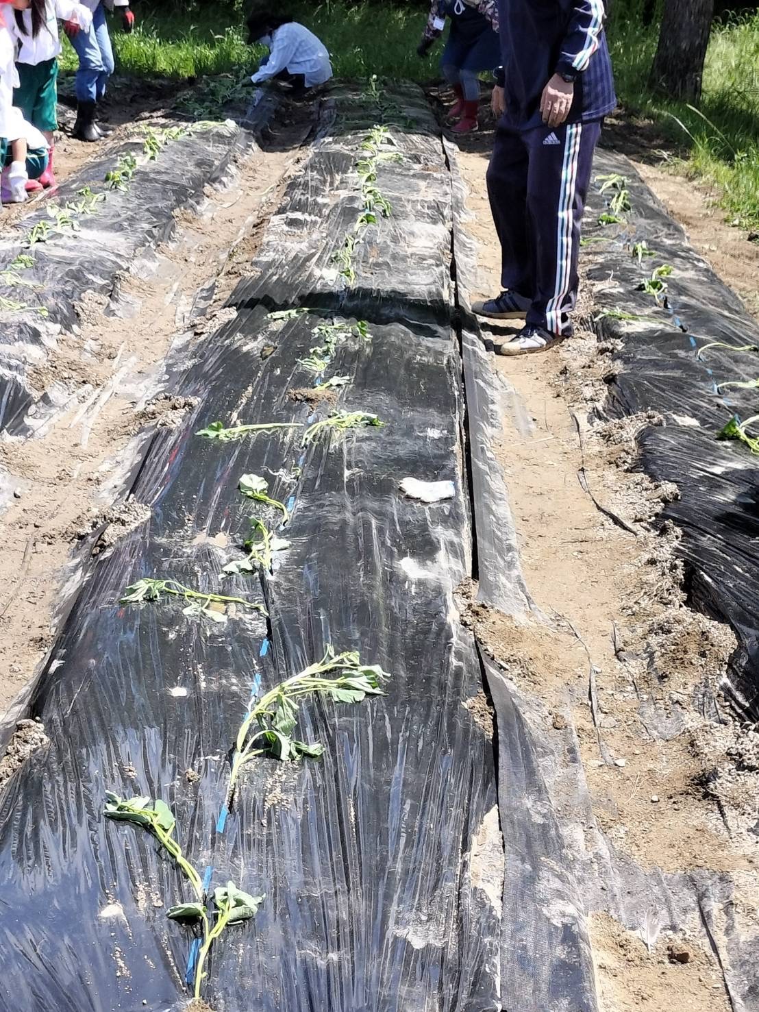 今日までに、草刈りをして、トラクターと耕うん機で2回耕し、畝作りとマルチ掛け、そして30センチ間隔で穴の印を付けるという大変な準備作業をしてくださったそうです。植えた後も水やりや草引きなどお世話して下さることを忘れず、これからの生長を楽しみにしてほしいと思います。休み時間にグラウンドに出たときなど、ちょこっと見に行ってくれる子がひとりでもたくさんいることを願っています。保護者の皆様も、運動会などで畑をご覧になる機会があれば、お子さんと一緒にサツマイモの生長を見守ってくださると嬉しいです。天候の不順な昨今ですが、順調に生長してくれることを祈るばかりです。