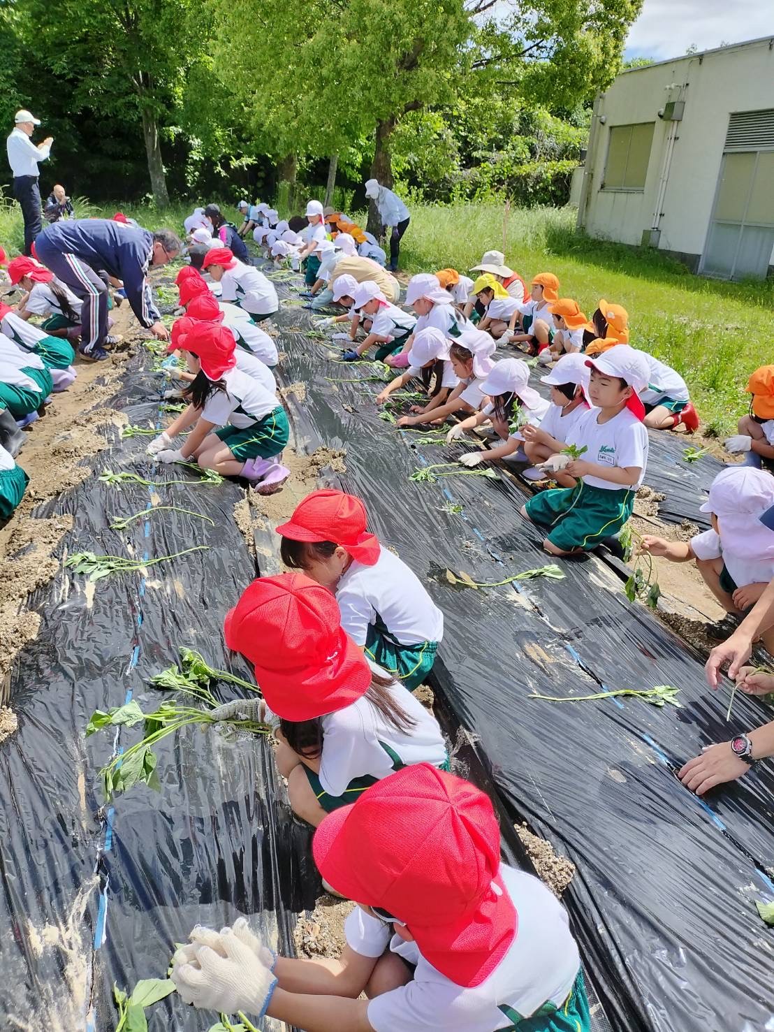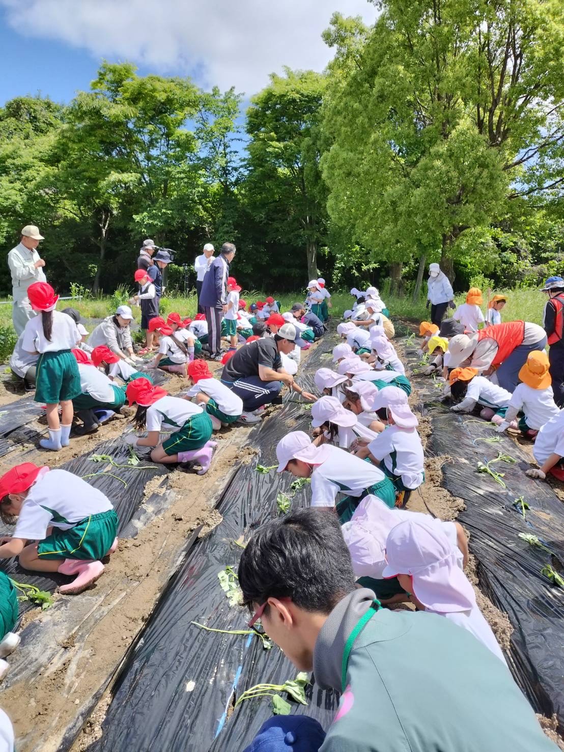 5月29日(水)1年生が山田こども園の年長組さんとサツマイモの苗植えを体験しました。前日は大雨が降り、活動が危ぶまれましたが、山々が美しく見える好天の下、みんなで200本の苗を植えることができました。