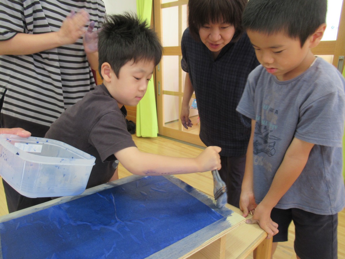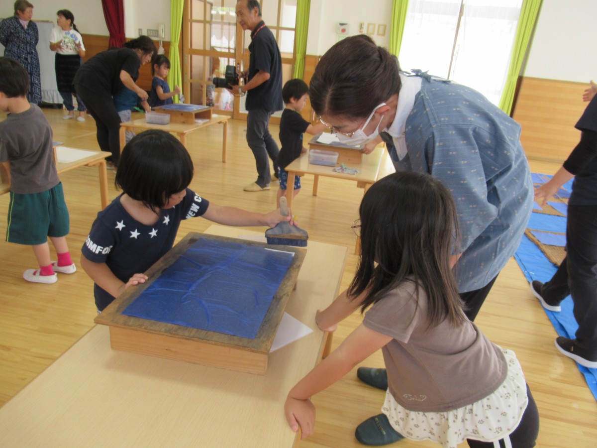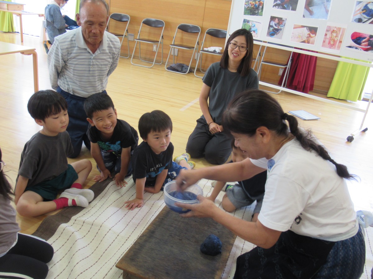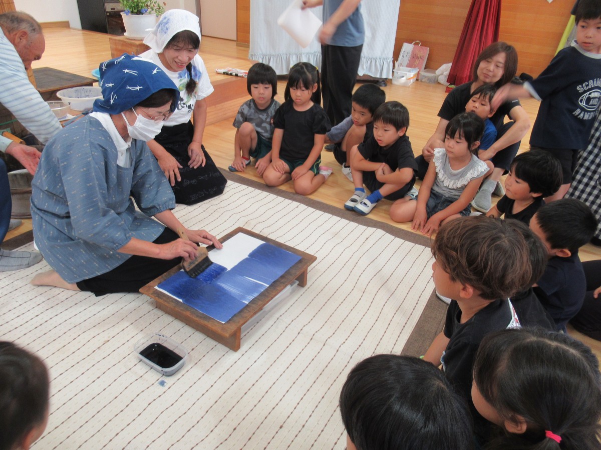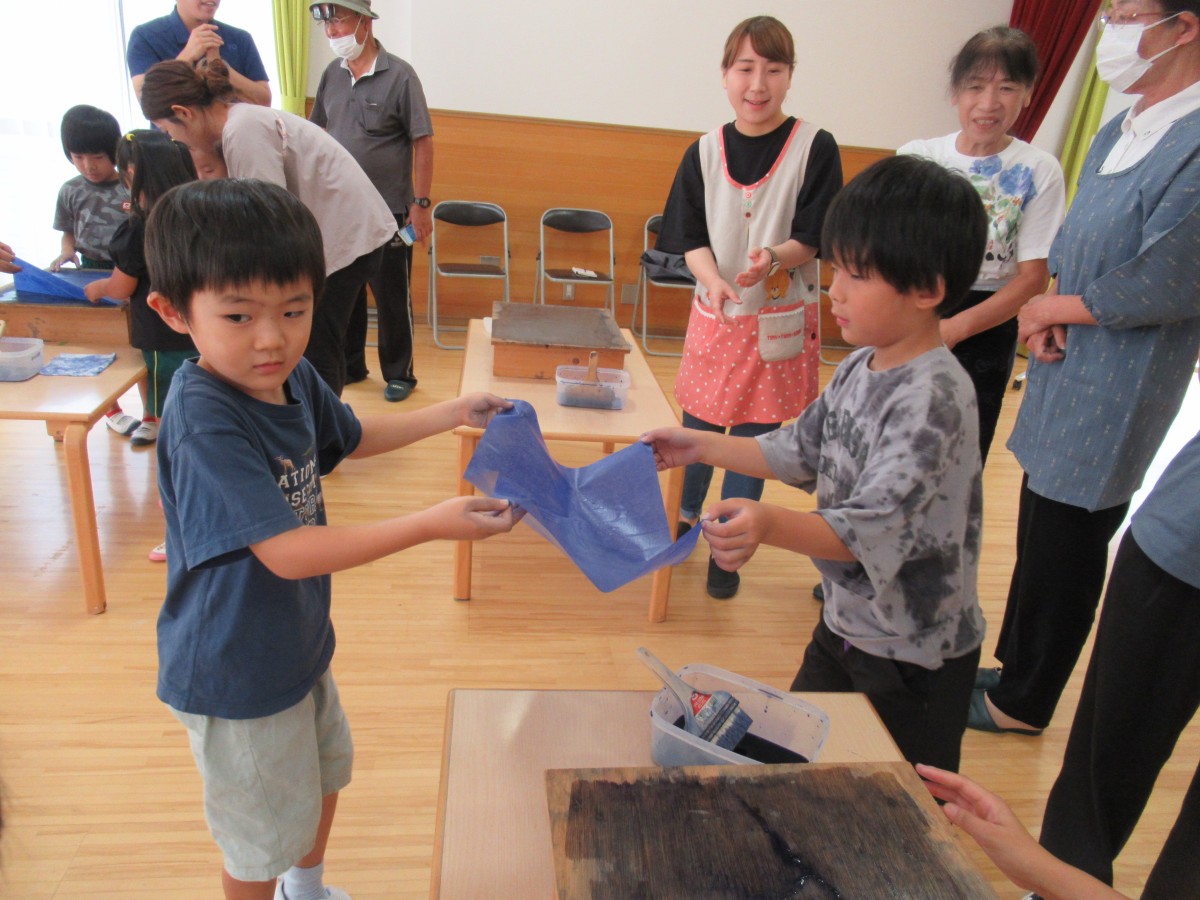 山田こども園では、ふるさとの伝統文化産業である『青花紙』の歴史を伝えていこうと、昭和62年より青花紙の染め体験に取り組み、アオバナの苗植えから栽培・花摘み・染め体験までを、「アオバナの体験活動」として、教育・保育課程に位置付けてきました。8月30日(金)には、子どもたちのアオバナ染め体験を支えてくださっている、“アオバナのおじいちゃん・おばあちゃん”をお招きし、青花紙の染め体験をしました。自分たちが育てた草津市の花“アオバナ”を使った染め体験を通して、ふるさとの良さに触れるだけでなく、伝統文化を教えてくださる地域の方への感謝の気持ちと、“ふるさとを愛する心”を育んだ子どもたち。山田こども園の伝統行事でもあるアオバナ染め体験から、五感を通してアオバナの魅力を存分に味わいました。