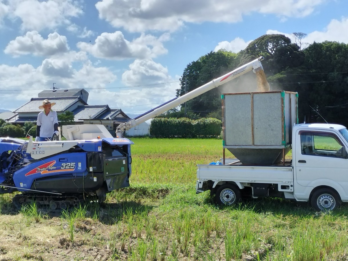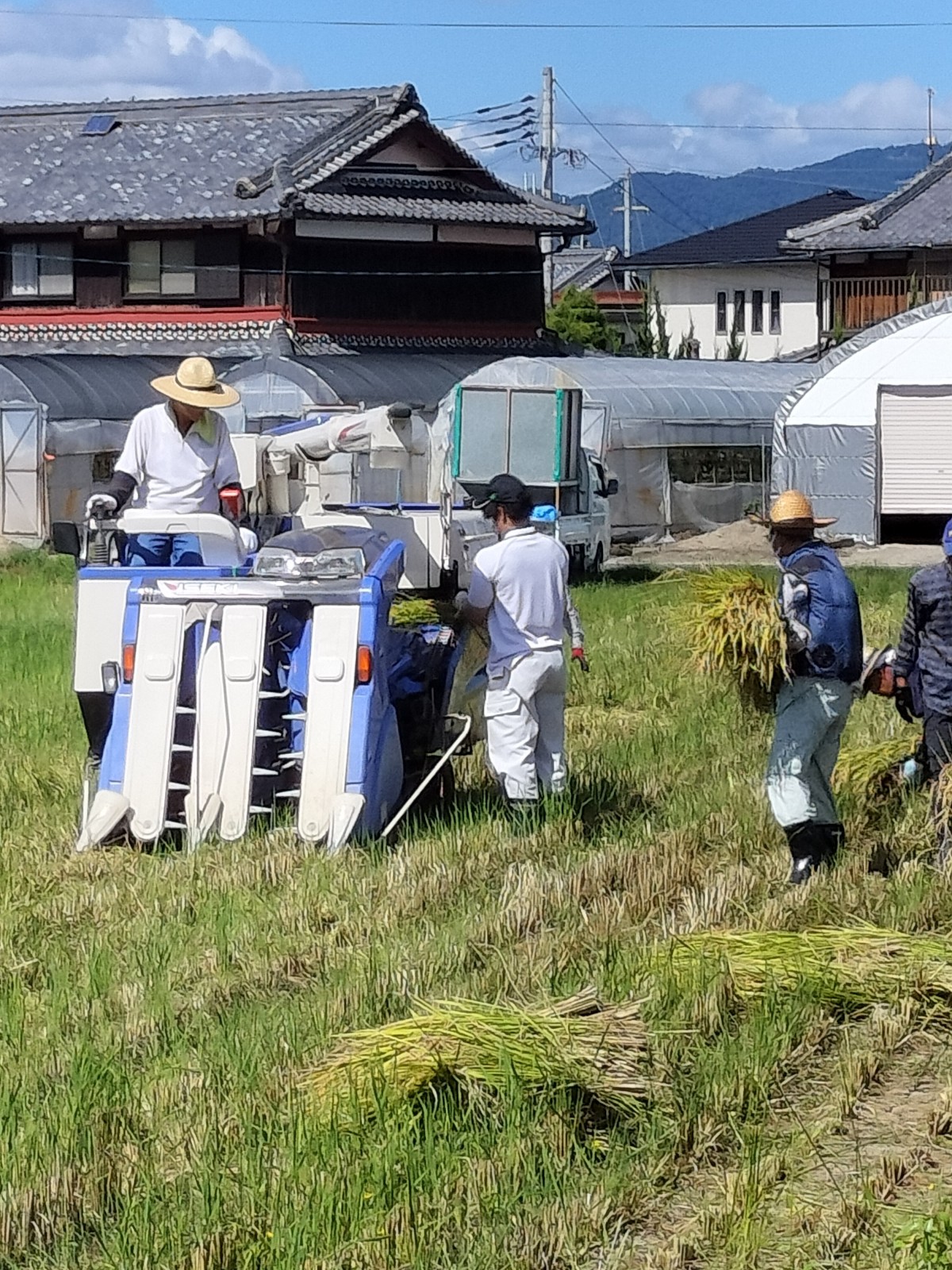 あまりの暑さに、途中でお茶休憩をしながらも、どんどんと刈り進んでいきました。ひと通り刈り取った後、残った部分はコンバインで刈り取り脱穀する様子を見せていただきました。途中で、担任の先生がコンバインでの刈り取りに挑戦するという〝サプライズ〟もあり、子どもたちにとっても記憶に残る稲刈りになったのではないかと思います。この先生の姿に触発されて、将来〝農業〟を目指す子も現れるかも知れませんね。