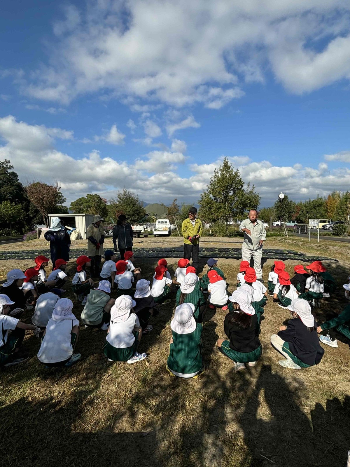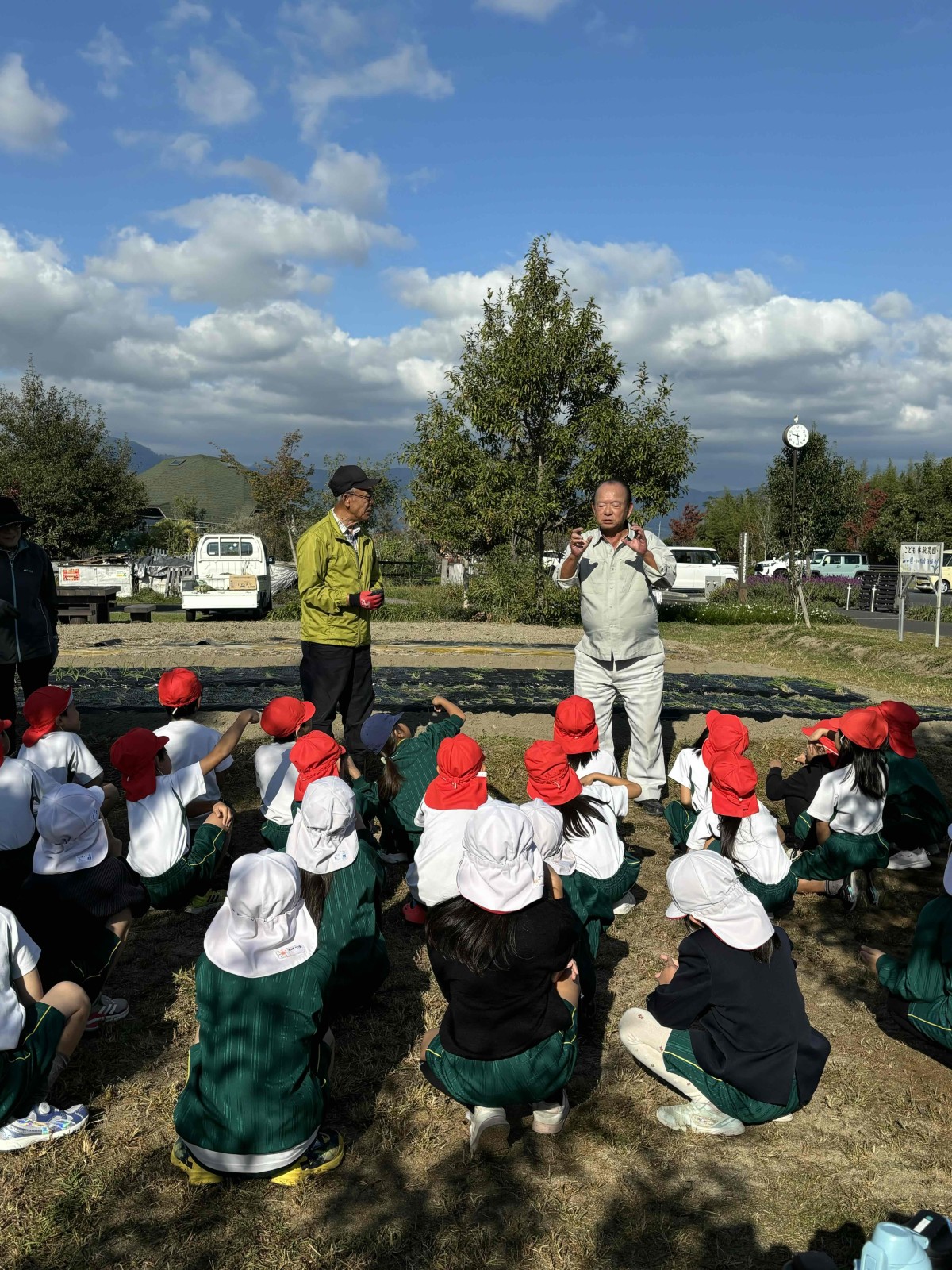 初めに教育後援会会長の久泉茂さんから植え方の説明がありました。苗は白い根が長くて指で掘った穴に入れ込むのがなかなか難しそうでしたが、たくさん植えることができました。作業が終わって久泉さんが感想を問われると「家ではできないことができて嬉しかった」とか「楽しかった」とかと子ども達は笑顔で話していました。収穫は3年生になってからですが、今から楽しみです。