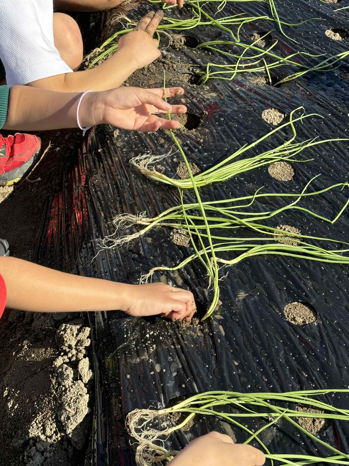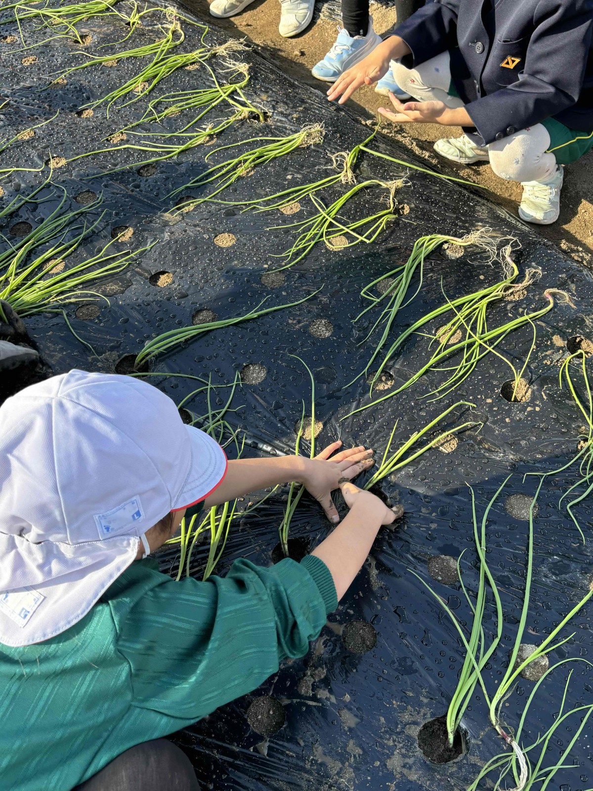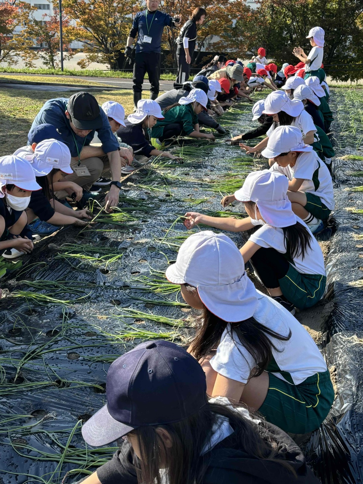 11月11日,澄み渡る青空の下、2年生の子ども達が玉ねぎの苗を植えました。この日までにai彩ひろばのスクールガーデンの畑はきれいに耕され、畝をつくり、玉ねぎ用のマルチをはり、子ども達がやってくる頃には玉ねぎ苗が準備されていました。