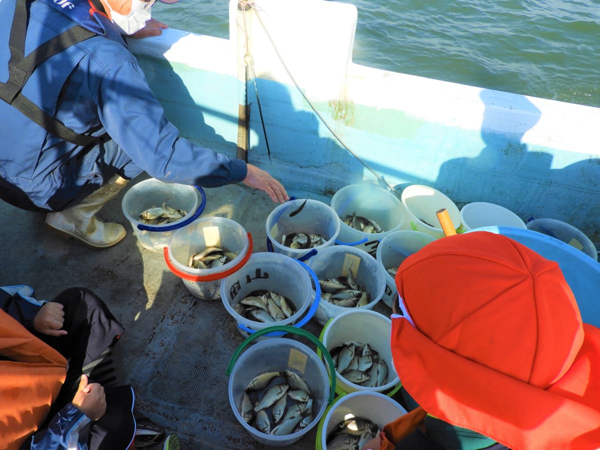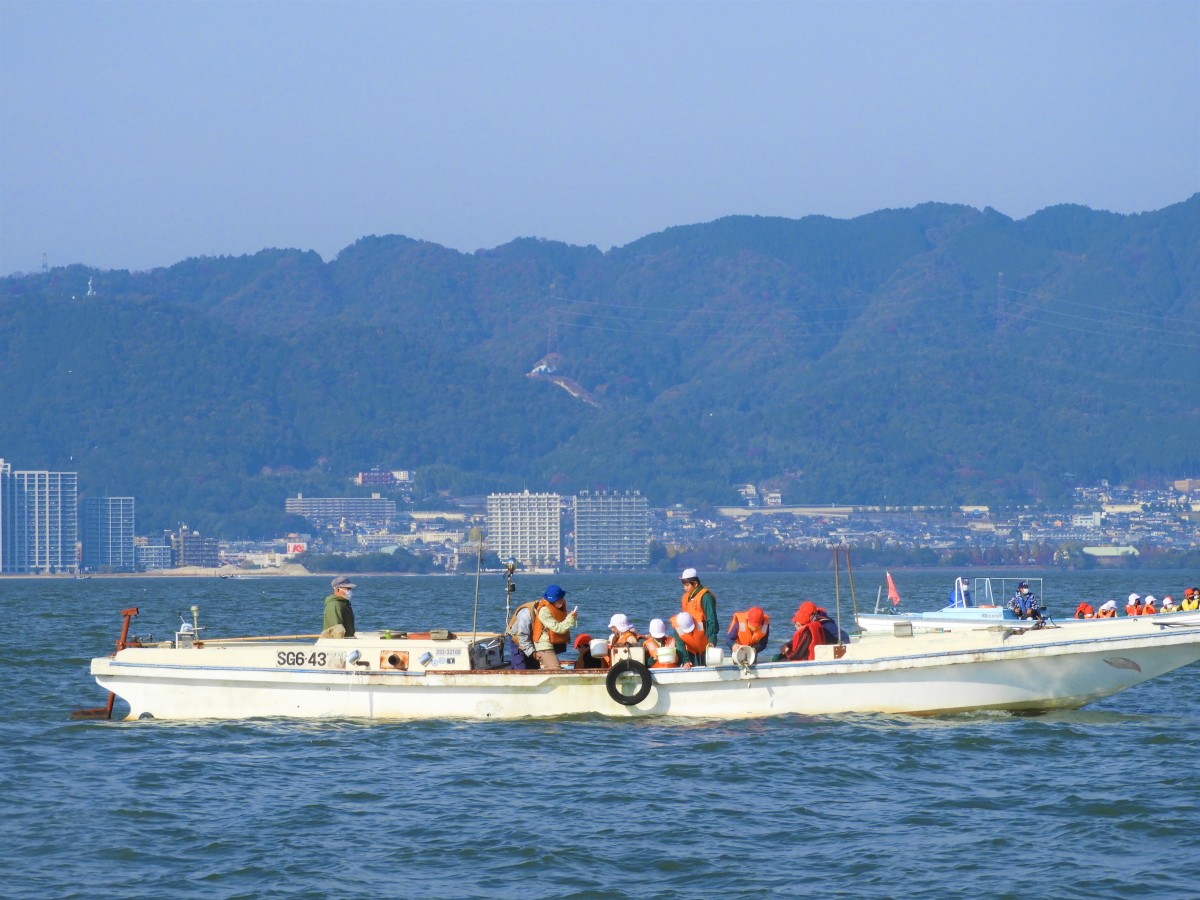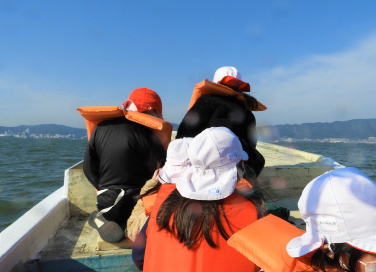 山田漁業共同組合の方が用意してくださったフナ約300kgを、子どもたちは「元気に泳いでいくんだよ~!」「ダンスしているみたいだね!」など声をかけながら、びわ湖に放流していました。船に乗るまでは心配そうにしていた子も乗ってみるととても楽しかったと話していました。