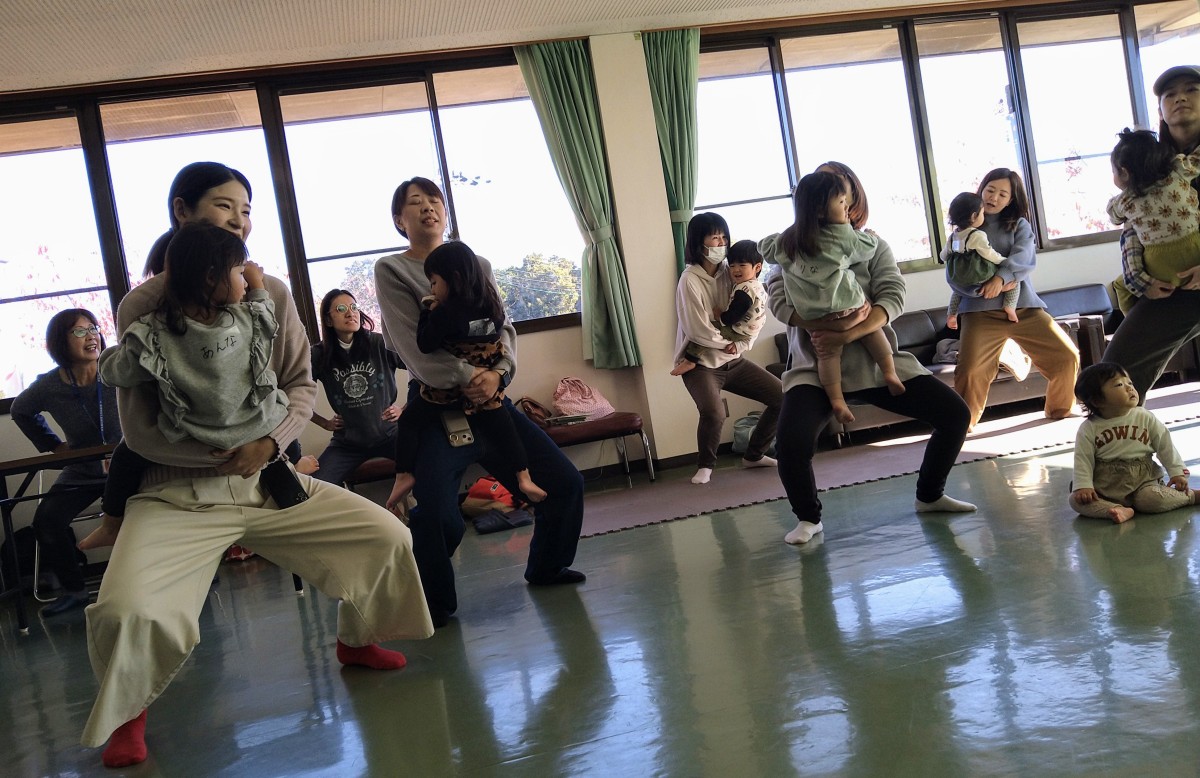 子どもを抱っこしてスクワットはちょっときつい?いえいえ子ども達の歓声にママもパパも大張り切りでした。最後はぎゅっと抱っこ!幸せ気分に浸れますね・・・