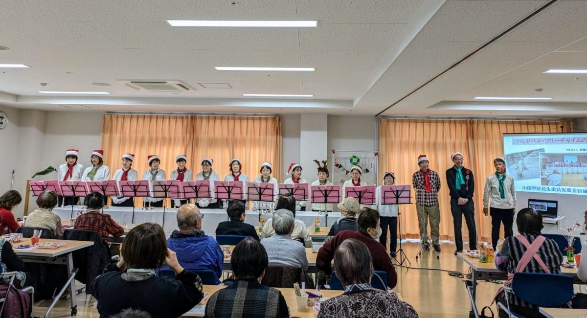 これまで様々な地域サロン、福祉施設、幼稚園等での演奏実績がありますが、コロナ禍では演奏は叶いませんでした。「やまだカフェ」には、今回で3回目の出演となり、多くの皆さんと触れ合いながらハンドベル演奏に耳を傾けていただくことができました![]()