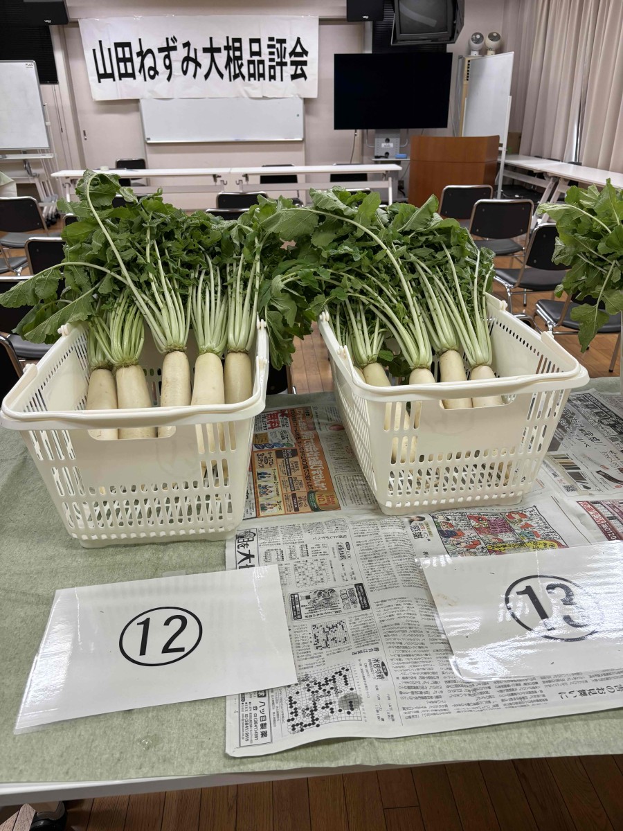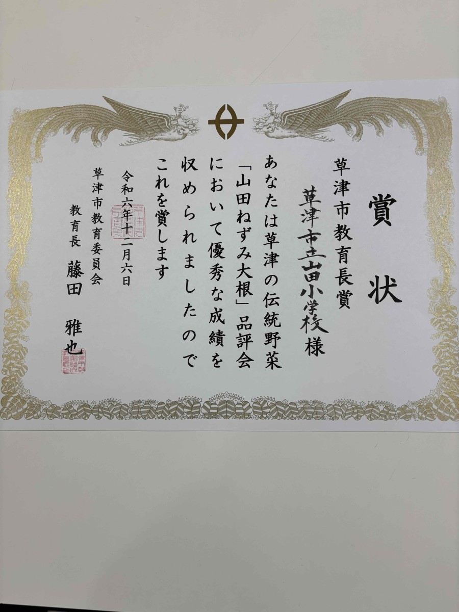 12月6日(金)湖南農業高等学校草津市の伝統野菜である「山田ねずみ大根」品評会が開催されました。この品評会は、栽培農家がたいへん少なくなり、現存している山田ねずみ大根を栽培することで栽培技術の向上および優良種子作出につなげ、草津市の伝統野菜を次世代に継承していくことを目的として実施されています。今年、山田小学校2年生が一生懸命育てた「山田ねずみ大根」が受賞できたことは、たいへん嬉しいことです。その名前にもあるように草津市でも「山田」の伝統野菜なのですから、私たち山田で守り続けたいと強く思いました。学校で受賞のニュースを知らされた時の子ども達の喜びの笑顔が見えてきそうです。関係のみなさまご指導、ご協力ありがとうございました。そして、2年生のみんなよく頑張りました。やったね!!