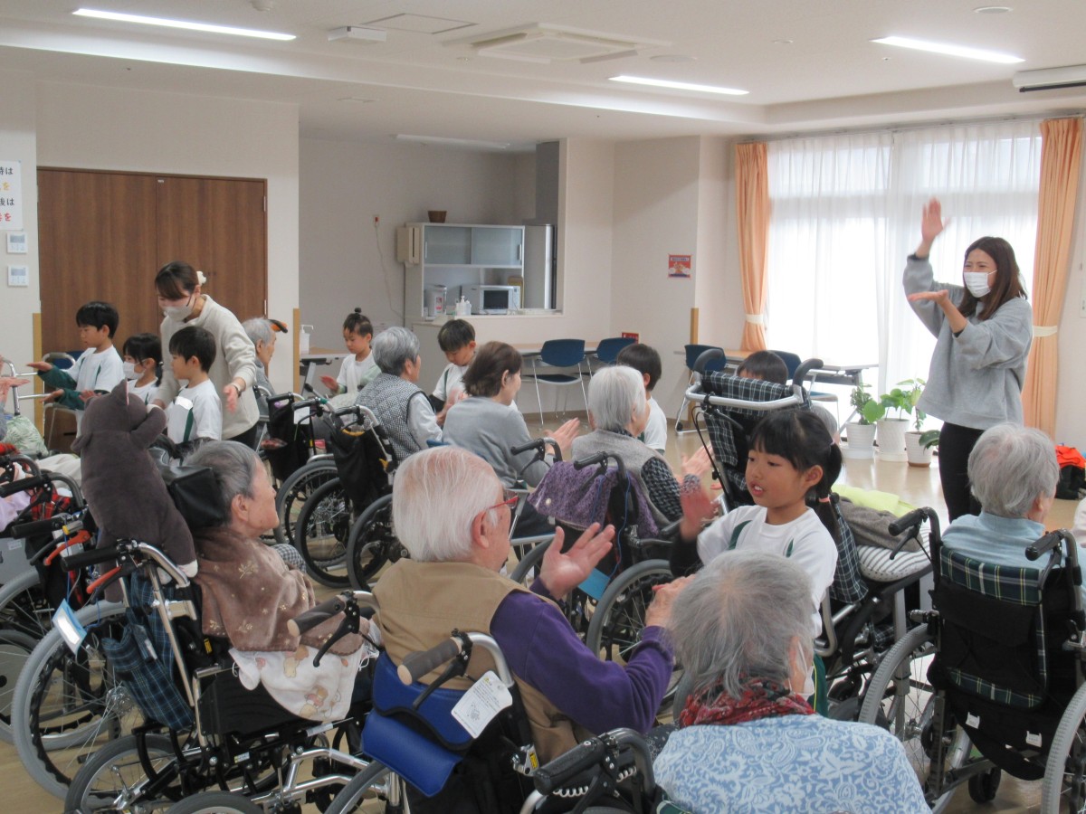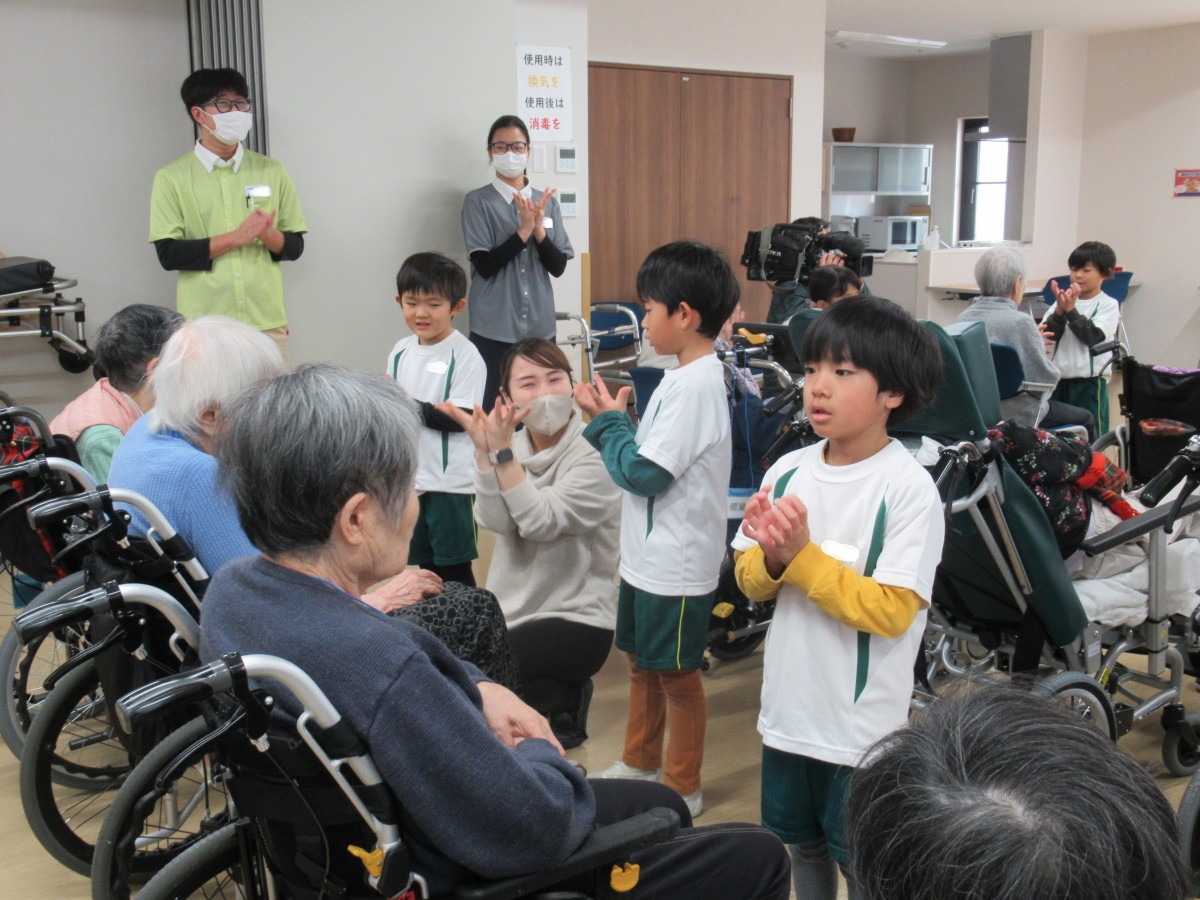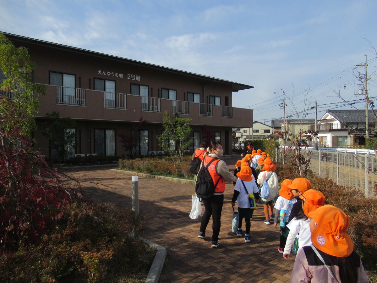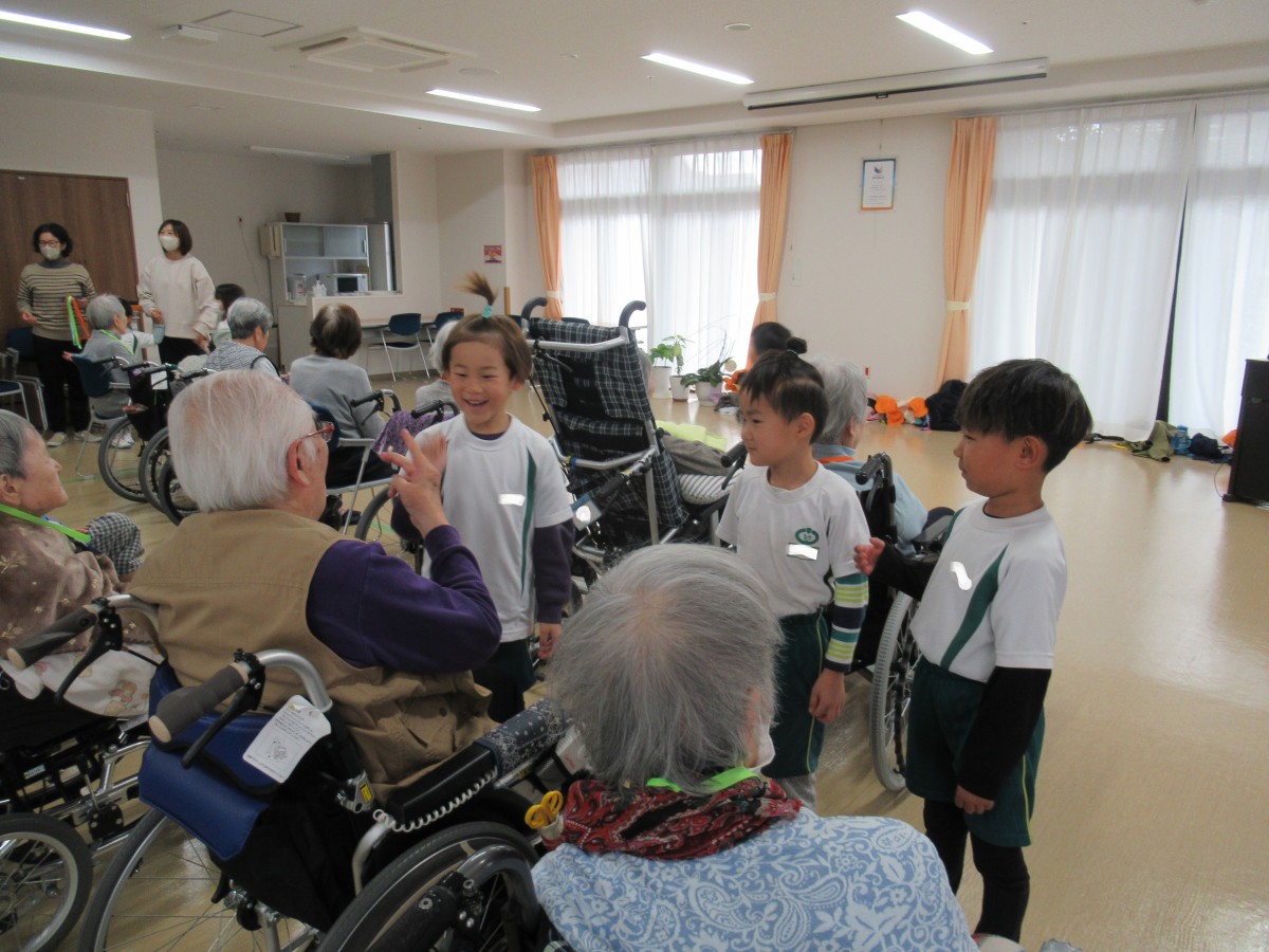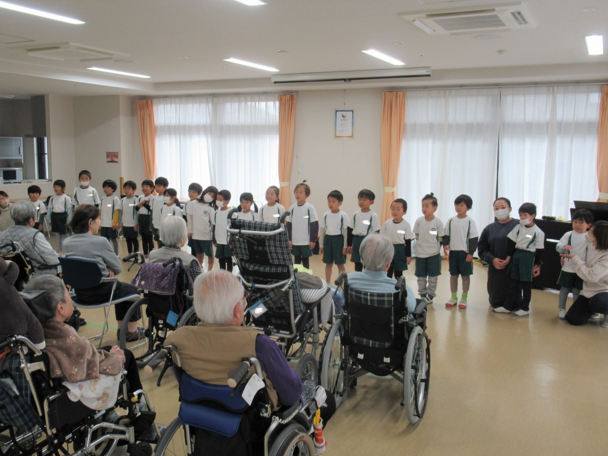 山田こども園では、平成30年より特別養護老人ホーム「えんゆうの郷」において、子どもたちと高齢者の方々との交流を実施してきました。コロナ禍により直接的交流を中断した期間もありましたが、昨年度から無事に再開することができ、今年も12月13日に5歳児が園の代表としてえんゆうの郷へ出かけました!