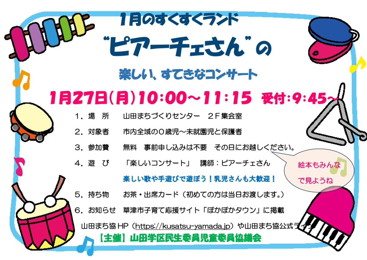 1月のすくすくランドは「ピアーチェさんの楽しい、すてきなコンサート」です![]()
