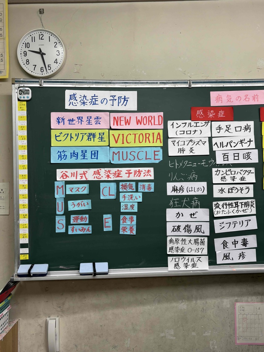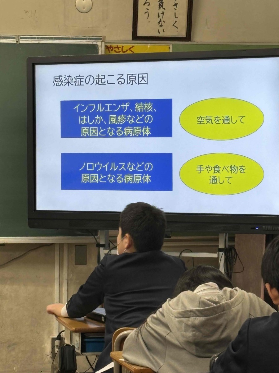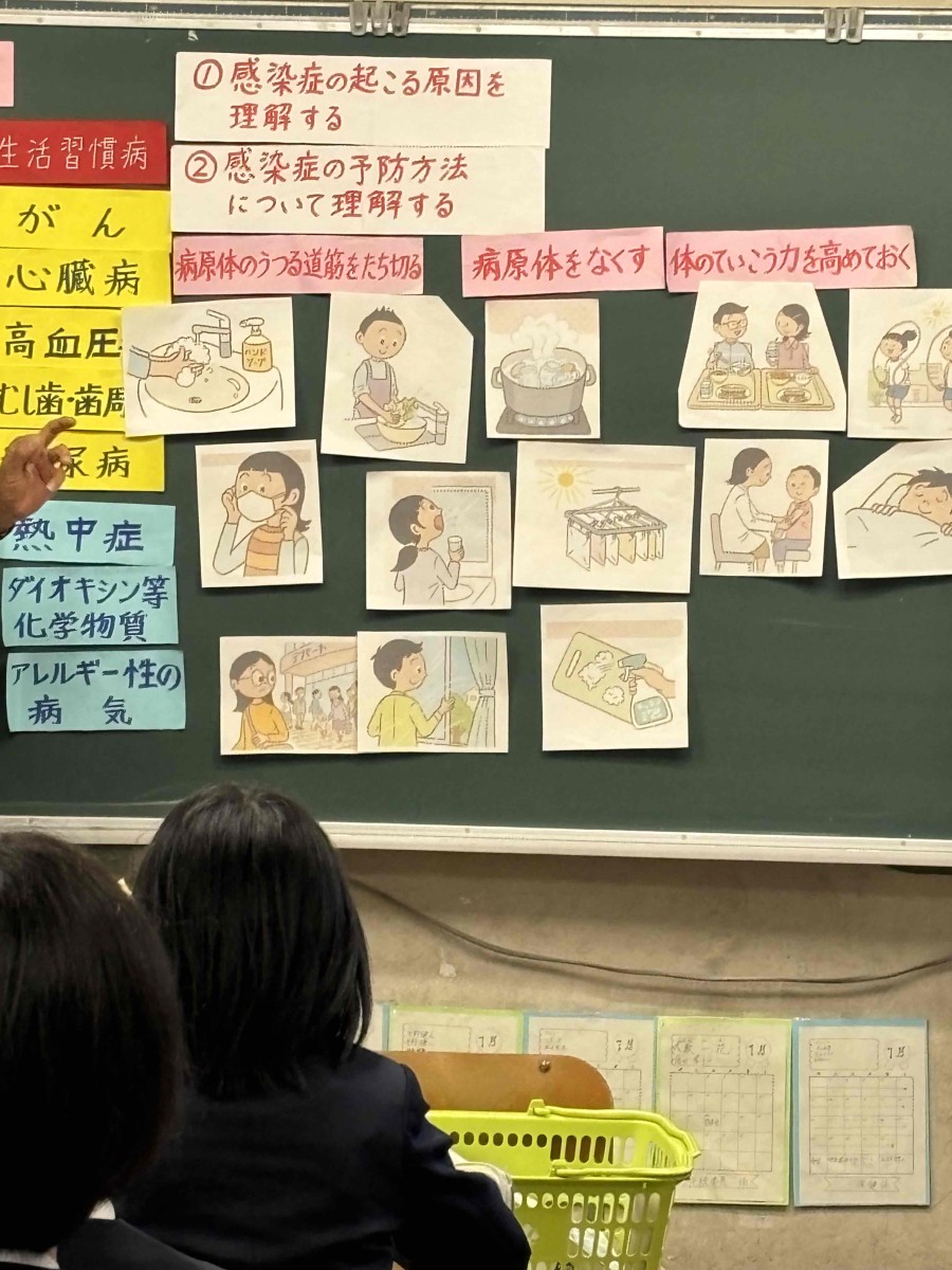 授業は、3種類のカードを使ってウイルス感染していく様子をゲームで知ることから始まりました。そして、知っている病気をあげていくと、「感染症」と「生活習慣病」に分けることができました。さらに、感染症が起こる原因や感染症の予防方法について教えていただきました。私達が咳をするとウイルスは2-3m飛び散るらしいですが、実際に3メートルというとかなり広い範囲であることもわかりました。栄養や睡眠をとって体の抵抗力を高め、手洗いやうがい、マスクをして病原体の経路を断ち切る、また煮沸や日光消毒などにより病原体をなくすことが予防になるということです。