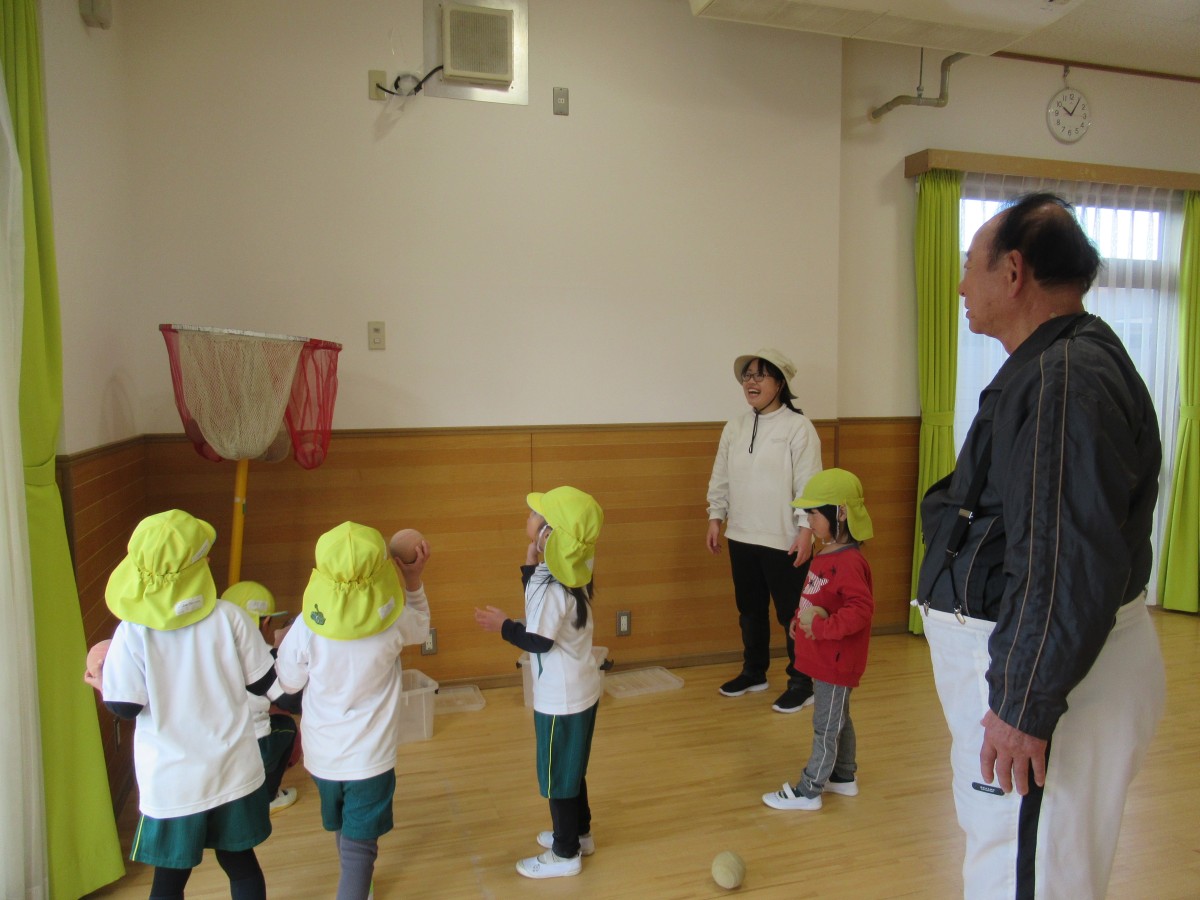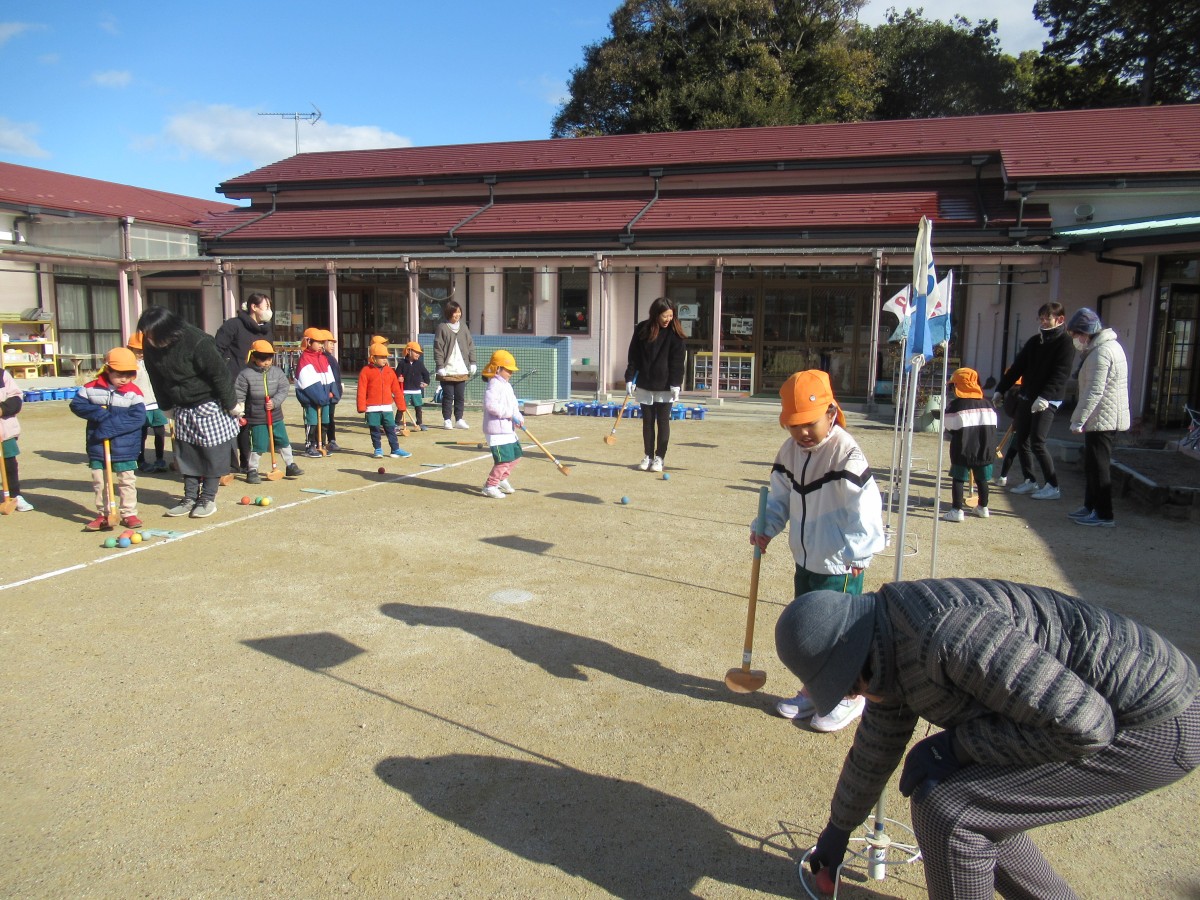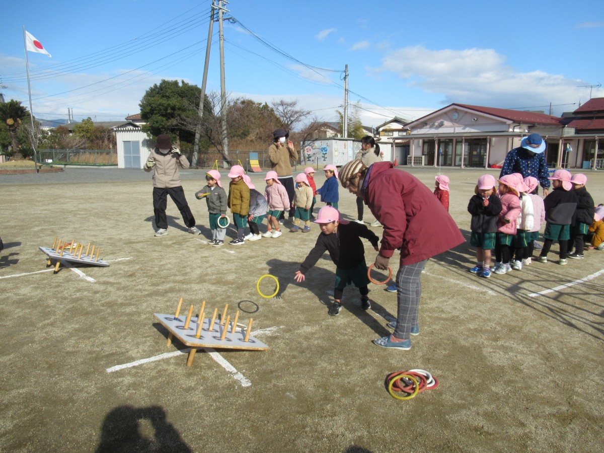 山田こども園は、長年に渡って「山田園小教育後援会」の方々から、山田小学校1年生との栽培活動交流やニュースポーツ交流など、様々な体験活動への支援をいただいています。2月10日(月)は、山田園小教育後援会の方々との『ニュースポーツ交流』を楽しみました。3歳児は輪投げやキンボール(大玉転がし)を、4歳児はビーン・ボーリングとワン・ツー・シュート(玉入れ)を、そして5歳児はグランドゴルフと、なかなか経験することがない遊びを体験した子どもたち。寒さ厳しい中でしたが、体を存分に動かし、山田園小教育後援会の方々との触れ合いを通して、人と関わる喜びを味わうことができました。たくさんの地域の方の見守りやご協力を得て、温かな雰囲気の中で豊かな人間関係を築くことのできる園をめざし、これからも、地域に開かれた教育・保育内容の創造に努めていきたいと思います。