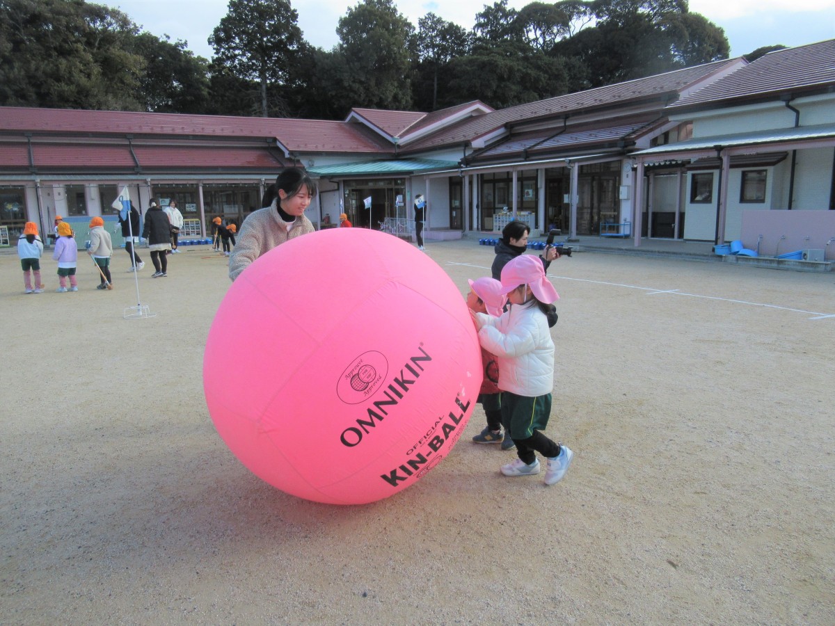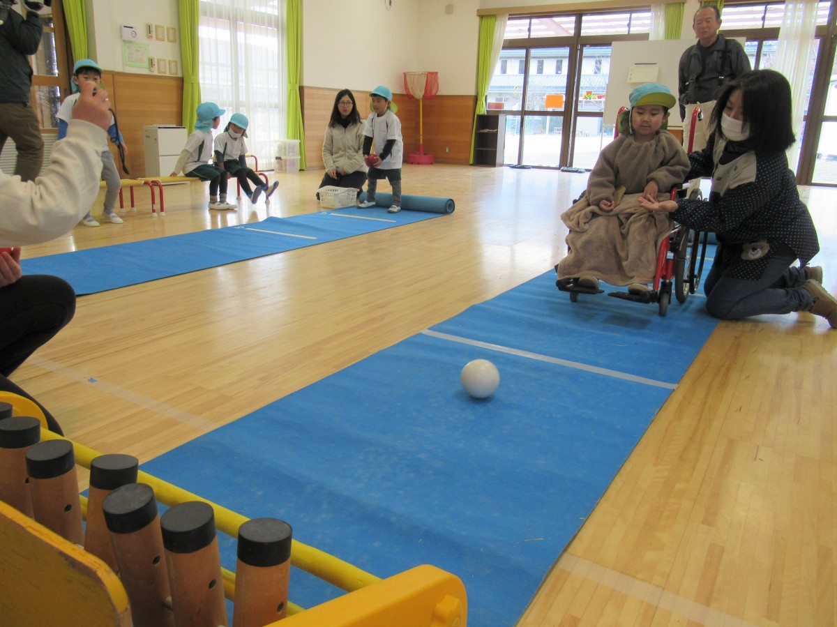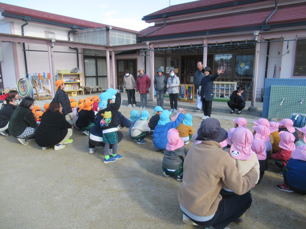 山田こども園は、長年に渡って「山田園小教育後援会」の方々から、山田小学校1年生との栽培活動交流やニュースポーツ交流など、様々な体験活動への支援をいただいています。2月10日(月)は、山田園小教育後援会の方々との『ニュースポーツ交流』を楽しみました。3歳児は輪投げやキンボール(大玉転がし)を、4歳児はビーン・ボーリングとワン・ツー・シュート(玉入れ)を、そして5歳児はグランドゴルフと、なかなか経験することがない遊びを体験した子どもたち。寒さ厳しい中でしたが、体を存分に動かし、山田園小教育後援会の方々との触れ合いを通して、人と関わる喜びを味わうことができました。たくさんの地域の方の見守りやご協力を得て、温かな雰囲気の中で豊かな人間関係を築くことのできる園をめざし、これからも、地域に開かれた教育・保育内容の創造に努めていきたいと思います。