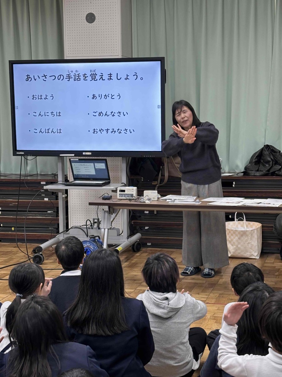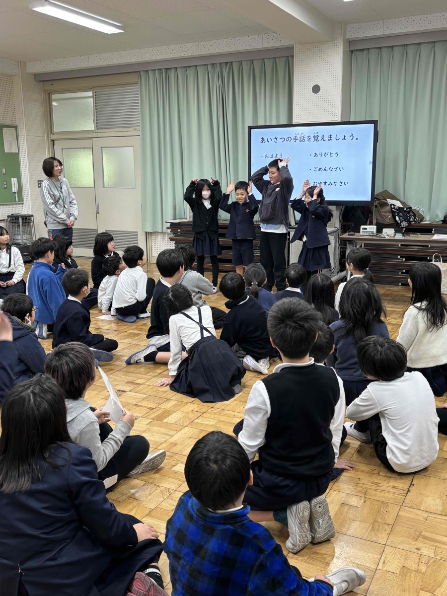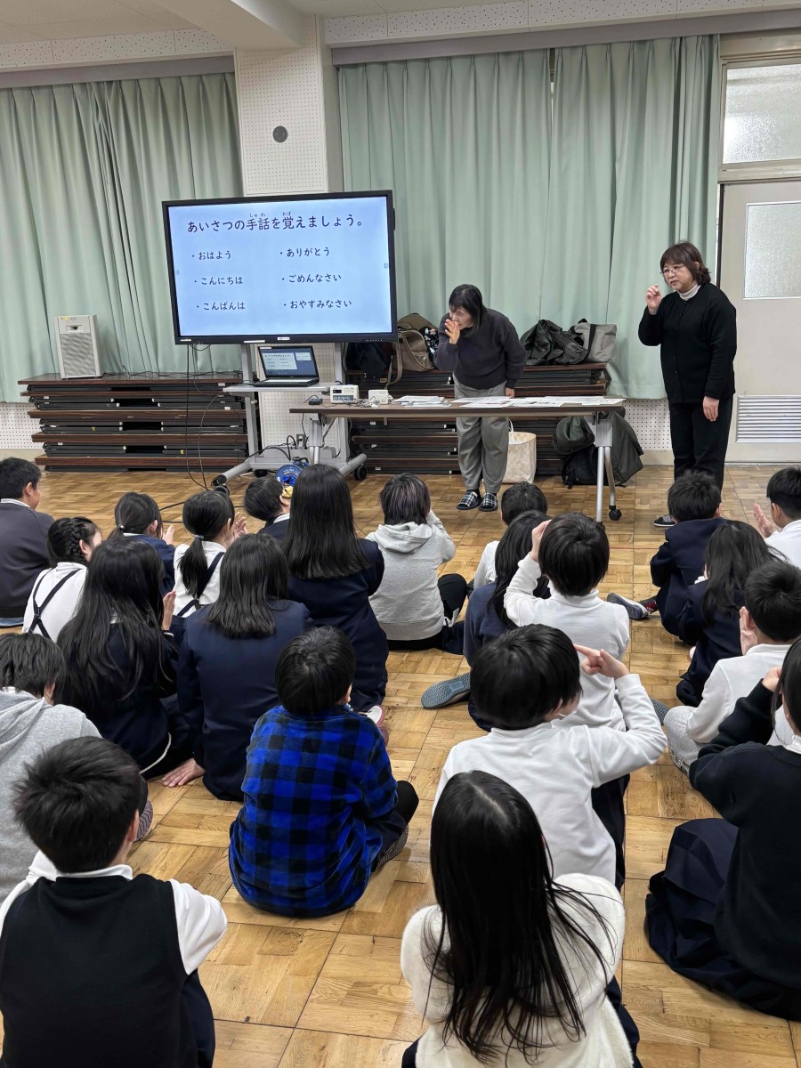 2月14日、草津市聴覚障害者協会や草津市障害福祉課より講師の方々をお招きし、3年生が「聞こえないってどんなことかな?」という事について考えてみたり、「聞こえない人はどんな生活をしているの?」という事についてお話を聞いたりしました。そして、手話によるあいさつ表現「おはよう」「こんにちは」などを教えていただき、みんなで手話表現してみました。また、配られたカードの絵をグループで相談して、手話表現でみんなに伝えてみました。手話は大切なコミュニケーションの手段で単に手振りだけでなく、その言葉に応じた表情や気持ちを込めて表現すると相手に伝わりやすいということを教えていただきました。