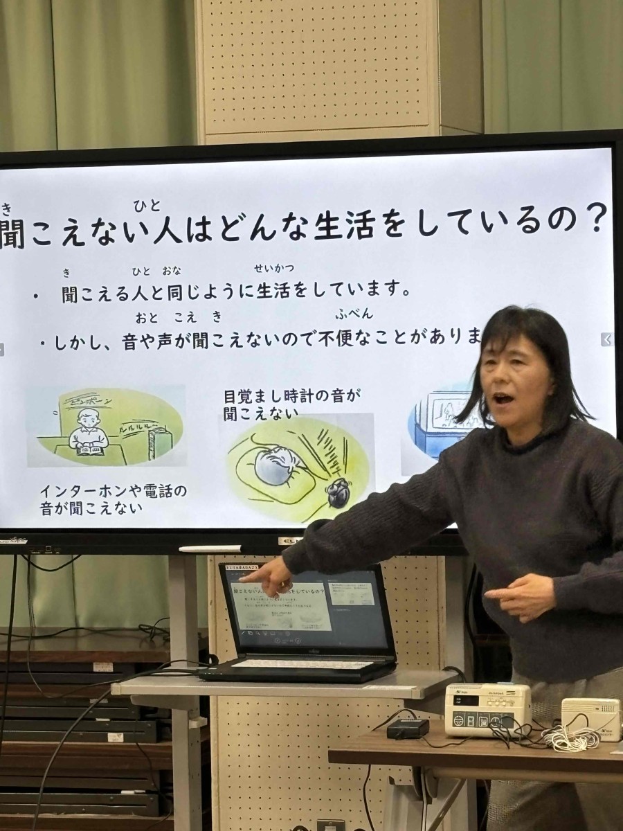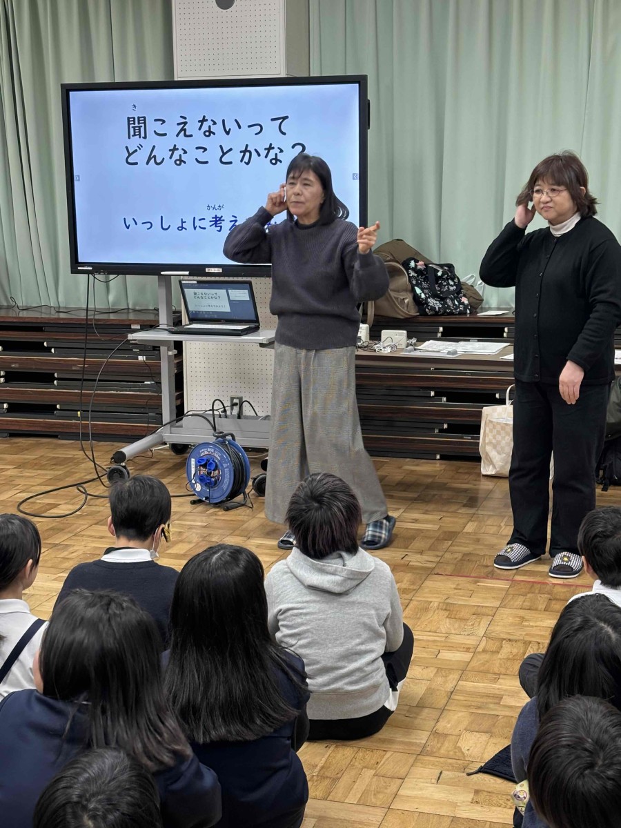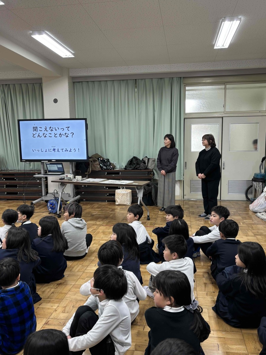 2月14日、草津市聴覚障害者協会や草津市障害福祉課より講師の方々をお招きし、3年生が「聞こえないってどんなことかな?」という事について考えてみたり、「聞こえない人はどんな生活をしているの?」という事についてお話を聞いたりしました。そして、手話によるあいさつ表現「おはよう」「こんにちは」などを教えていただき、みんなで手話表現してみました。また、配られたカードの絵をグループで相談して、手話表現でみんなに伝えてみました。手話は大切なコミュニケーションの手段で単に手振りだけでなく、その言葉に応じた表情や気持ちを込めて表現すると相手に伝わりやすいということを教えていただきました。