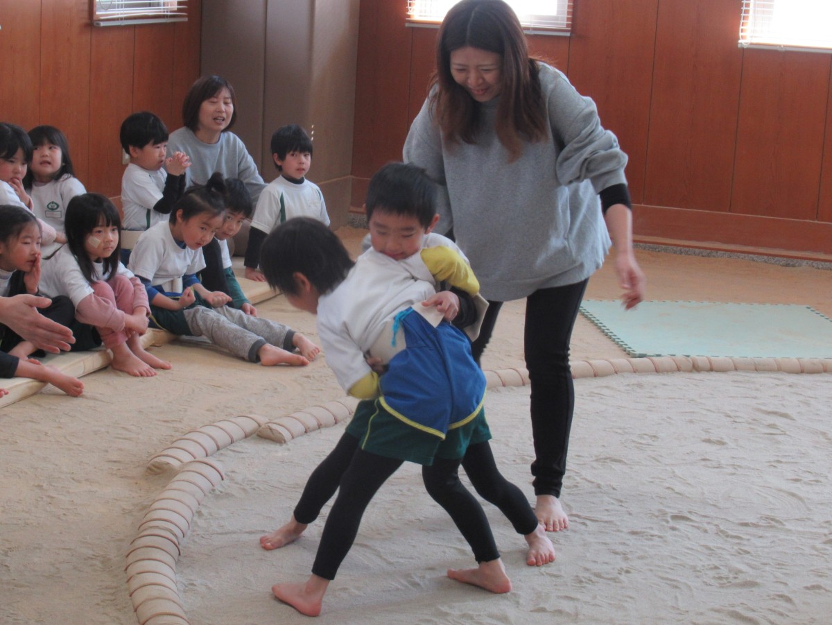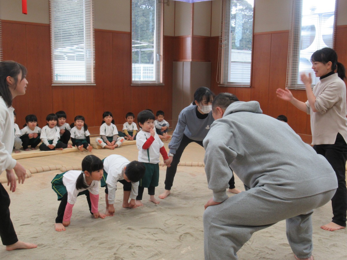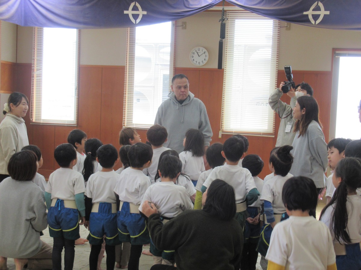 山田こども園では、「しなやかな心と体を育む」ことをねらいとして、今年度も元大相撲力士の方や大学相撲部の方を招いて様々な相撲体験を実施してきました。2月17日(月)は、年間通して指導いただいている元大相撲力士の横江英樹さんをお招きし、1年間取り組んできた相撲体験の成果を存分に発揮し、最後まであきらめずに相手と向き合う姿勢と、相撲ができることへの感謝の気持ちをもって、今年度最後となる相撲体験を締めくくりました。回を重ねるごとに、粘り強く諦めない力強さを見せてきた子どもたち。本日は、4歳児・5歳児は東西に分かれての取組で力強い相撲をとり、3歳児は待ちに待った相撲体験デビューを果たしました。「継続は力なり」の言葉通り、地域に根ざす山田ならではの相撲体験を通して、園の合言葉『○やさしい心 ○まけない強さ ○だれもが輝く 山田こども園』の神髄に迫る、子どもたちの勇姿をしっかり見守ることができました!