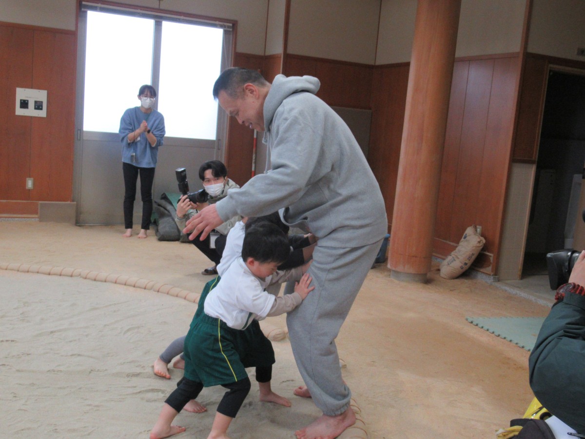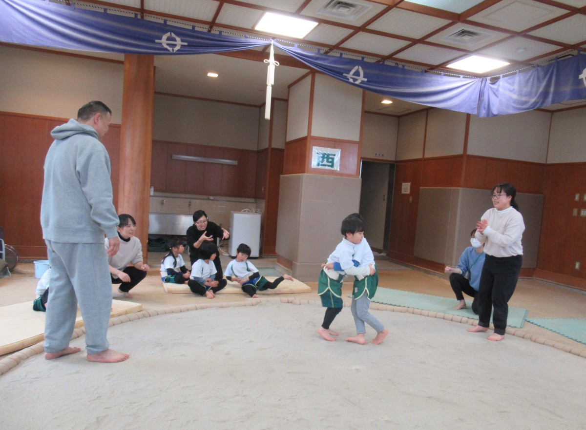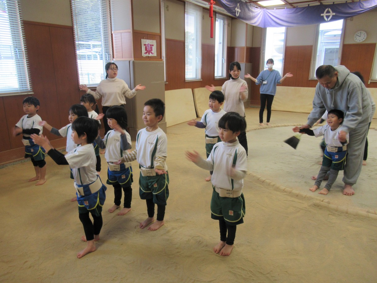山田こども園では、「しなやかな心と体を育む」ことをねらいとして、今年度も元大相撲力士の方や大学相撲部の方を招いて様々な相撲体験を実施してきました。2月17日(月)は、年間通して指導いただいている元大相撲力士の横江英樹さんをお招きし、1年間取り組んできた相撲体験の成果を存分に発揮し、最後まであきらめずに相手と向き合う姿勢と、相撲ができることへの感謝の気持ちをもって、今年度最後となる相撲体験を締めくくりました。回を重ねるごとに、粘り強く諦めない力強さを見せてきた子どもたち。本日は、4歳児・5歳児は東西に分かれての取組で力強い相撲をとり、3歳児は待ちに待った相撲体験デビューを果たしました。「継続は力なり」の言葉通り、地域に根ざす山田ならではの相撲体験を通して、園の合言葉『○やさしい心 ○まけない強さ ○だれもが輝く 山田こども園』の神髄に迫る、子どもたちの勇姿をしっかり見守ることができました!