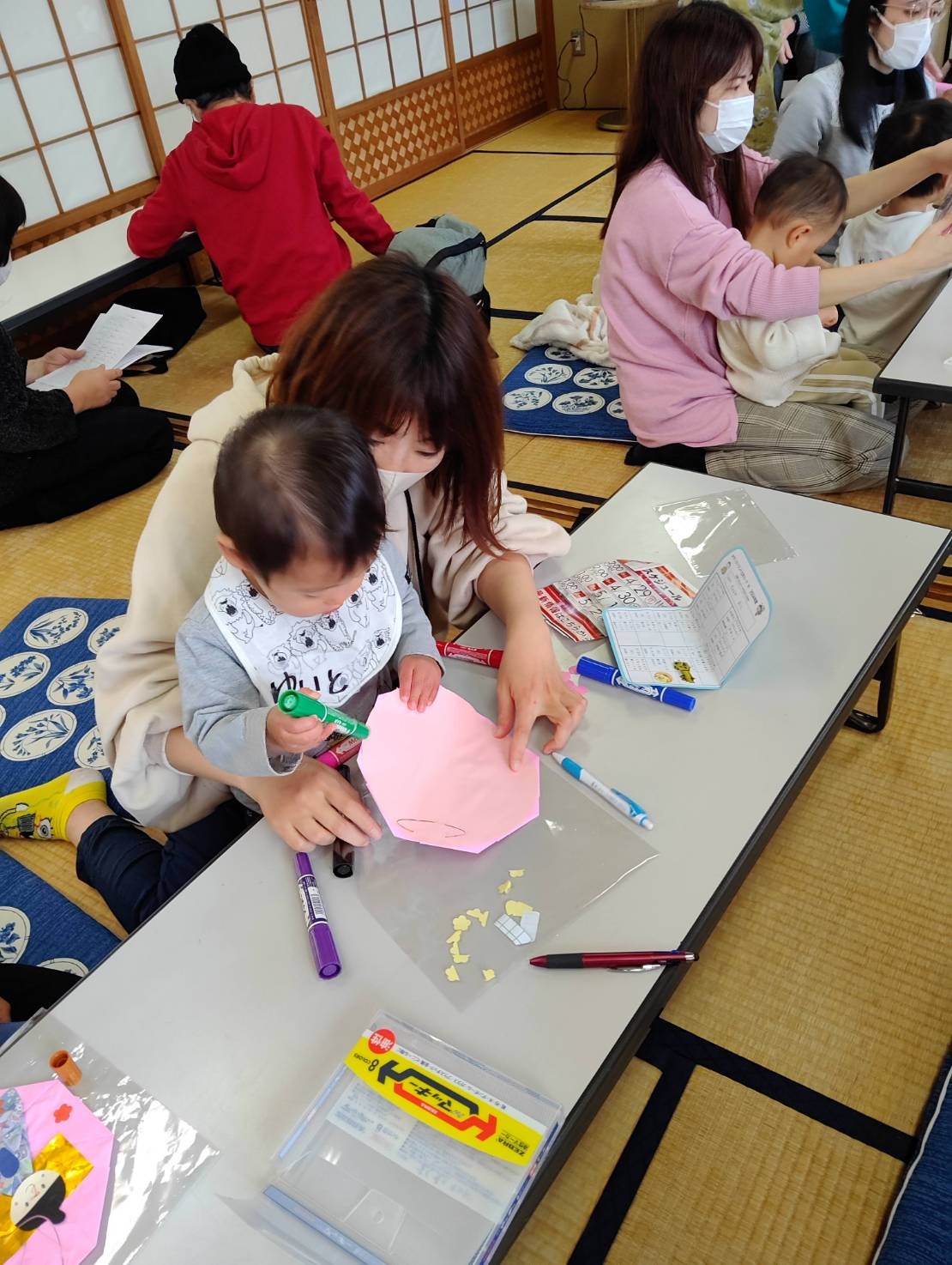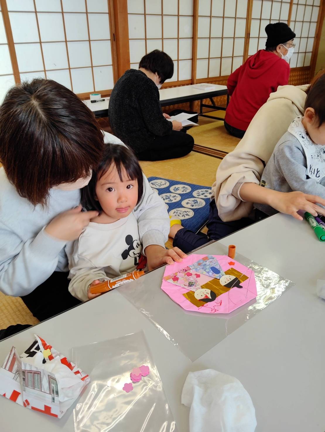 子ども達は、可愛い指でのり付けをしたり、顔をペンで描いたり、お母さんとの共同作業で素敵なひな飾りに仕上がりました。お家で飾ってね!