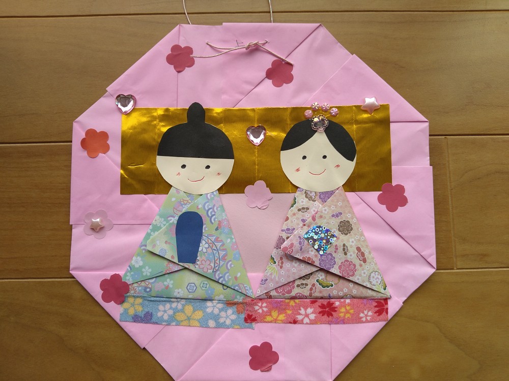 ひな祭りを前にひな飾りを作りました。八角形の桃色の台紙に金屏風を貼り、折り紙で折った着物にお顔を貼ると二人のおひな様が並びます。