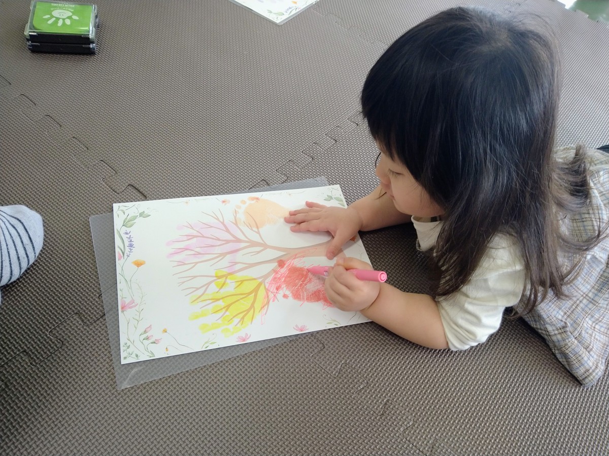 ペンを使って「なぐり書き」を楽しんだり、描けるようになったラインが嬉しくていっぱい書き込んだりと個性豊かなアート作品となりました。子ども達の成長の足跡、この時期にしか生まれない最高の1枚が出来上がりました。