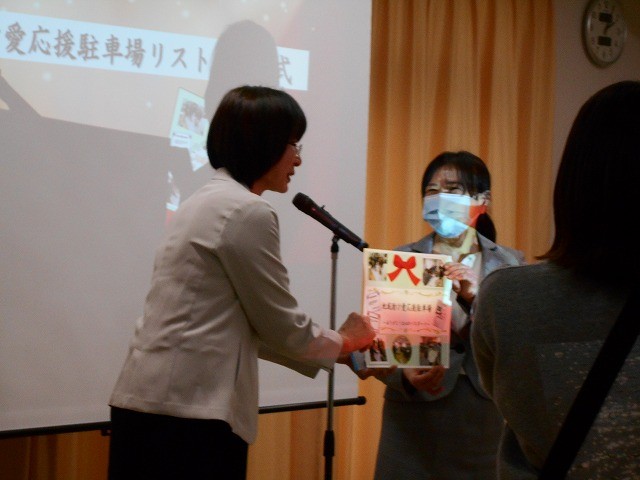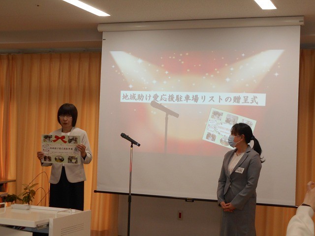 学区社協の中瀬清美会長から事業所を代表して居宅介護支援事業所きららの村瀬美貴さんにリストが贈呈されました。