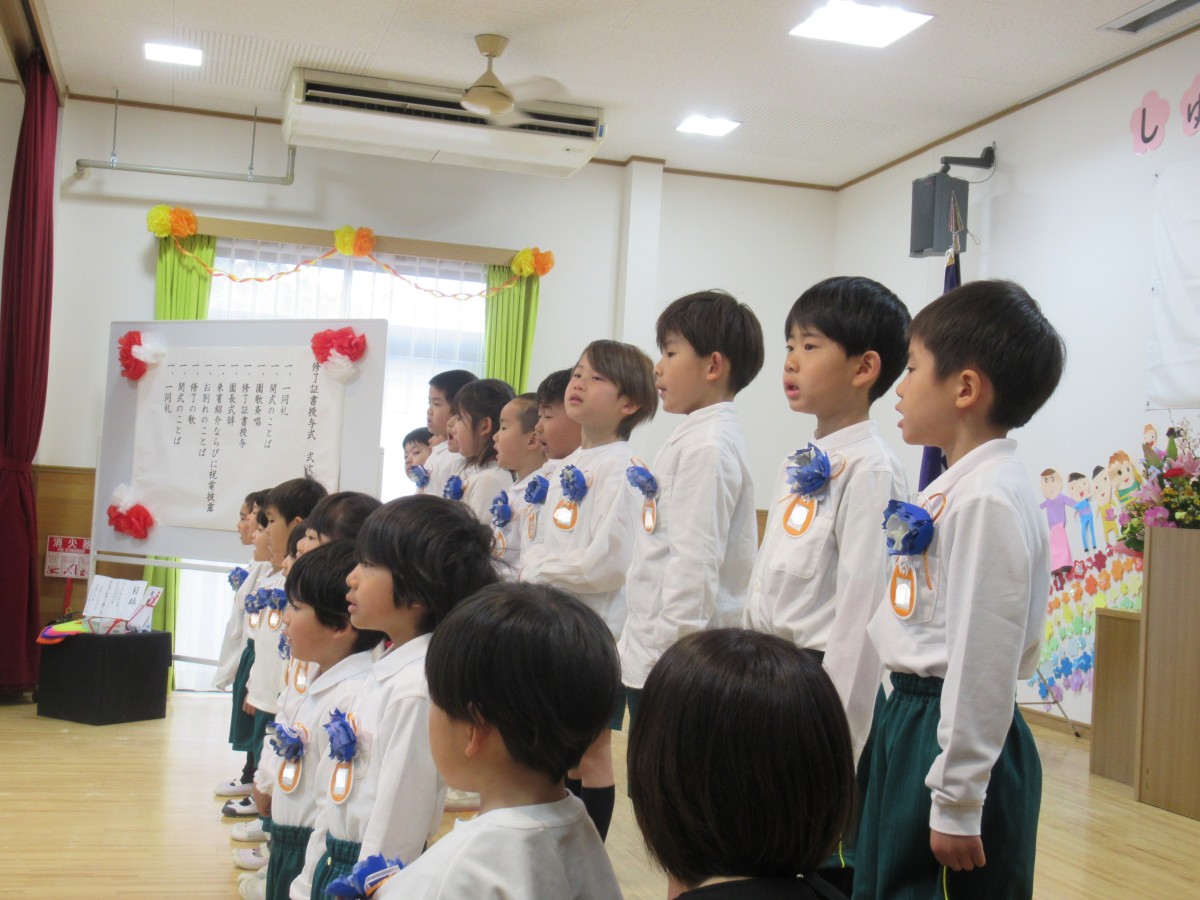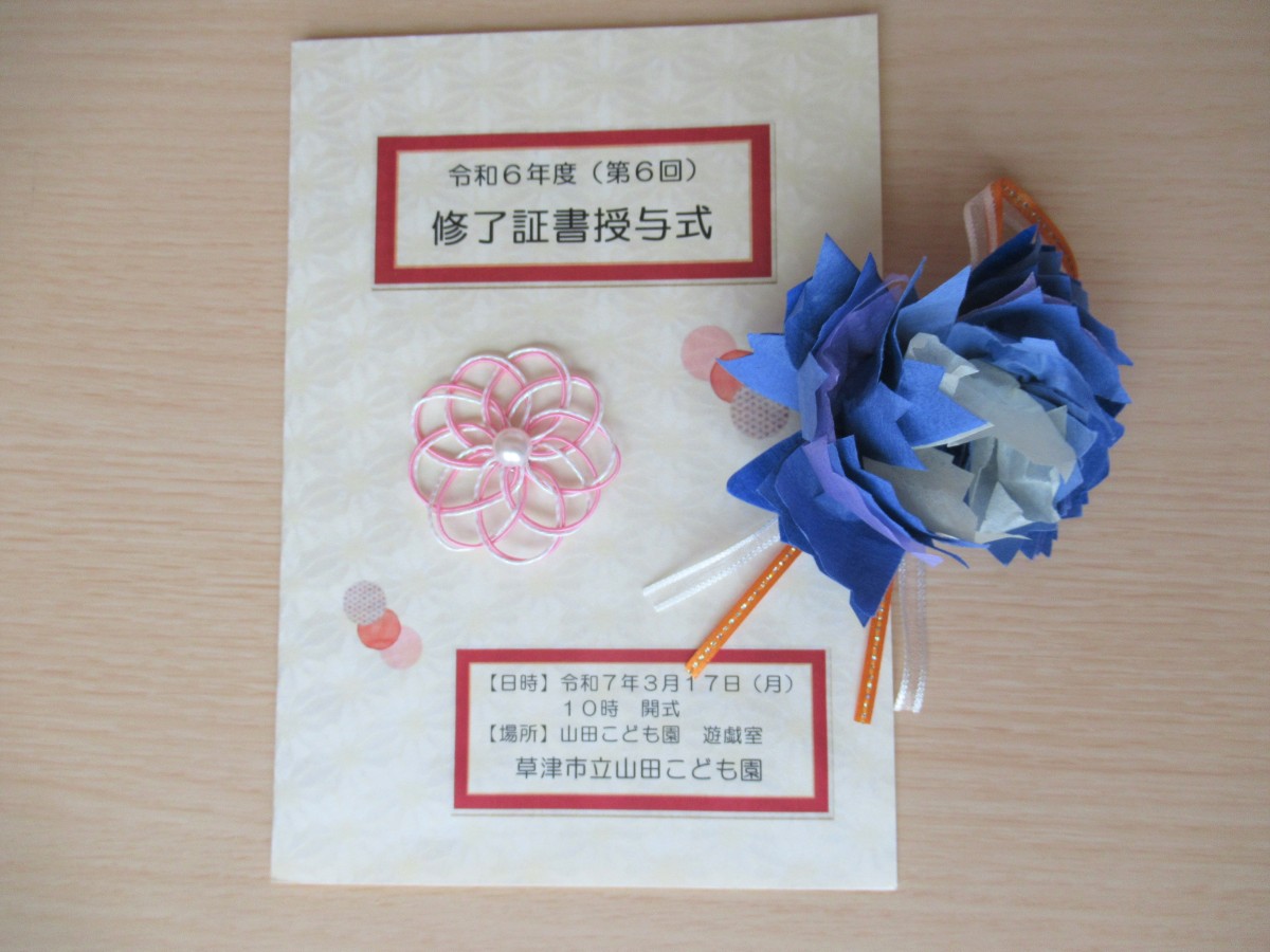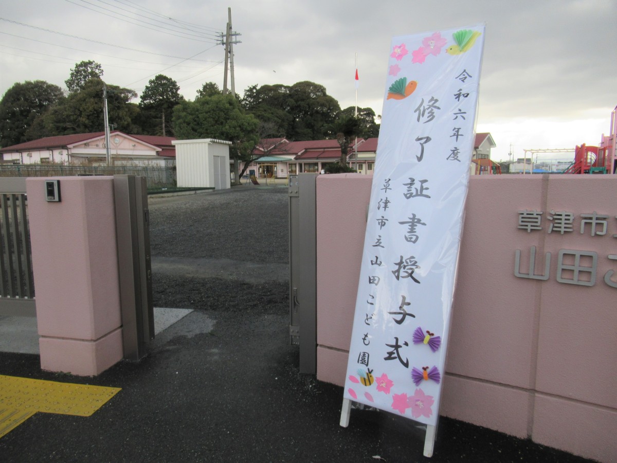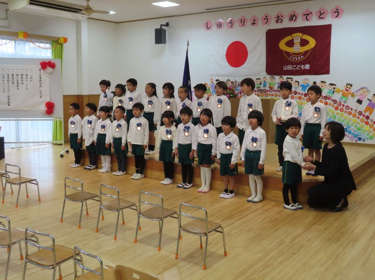 3月17日、山田こども園の令和6年度(第6回)修了証書授与式を行いました。 残念ながら体調不良による欠席者があり、全員揃ってとはいきませんでしたが、子どもたちとの別れを悲しむかのような春雨の春のもと、これから始まる未来に期待を膨らませながら、笑顔と涙で本園を巣立って行った5歳児。コロナ禍の影響を受けつつも、3年間の園生活を十分に楽しみ、笑顔あふれた日々が走馬灯のようによみがえってきます。地域の皆様には、様々な交流や日々の触れ合いの中で、いつも温かかく子どもたちを見守り応援していただいたこと、心から感謝申し上げます。 山田こども園は、園の合言葉『「や」さしい心 「ま」けない強さ 「だ」れもが輝く 山田こども園』のもと、恵まれた自然環境の中で、様々な人との交流を通して、子どもたちに豊かな心を育んでいきます。春からそれぞれの道を進む5歳児をはじめ、新たな出会いを待つ山田こども園の3歳児・4歳児へ、これからも変わらぬご支援をいただけると幸いです。 1年間、山田こども園からの発信を読んでいただき、ありがとうございました!