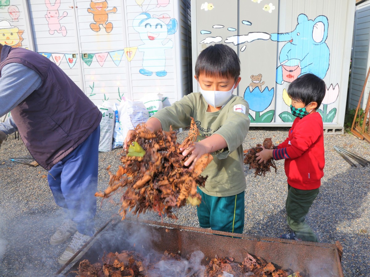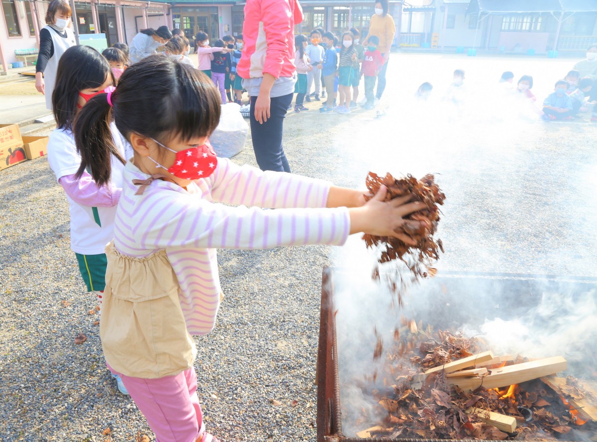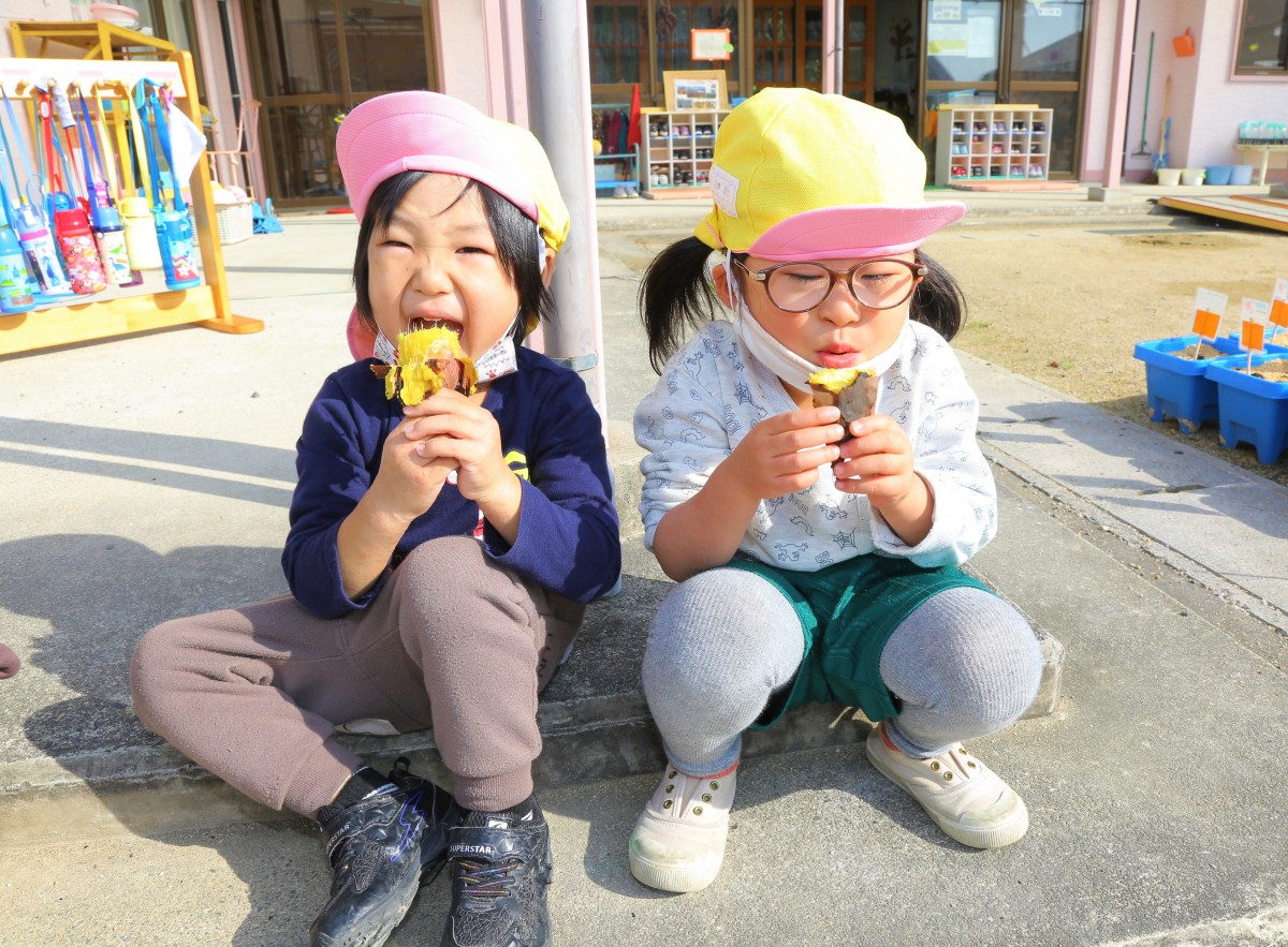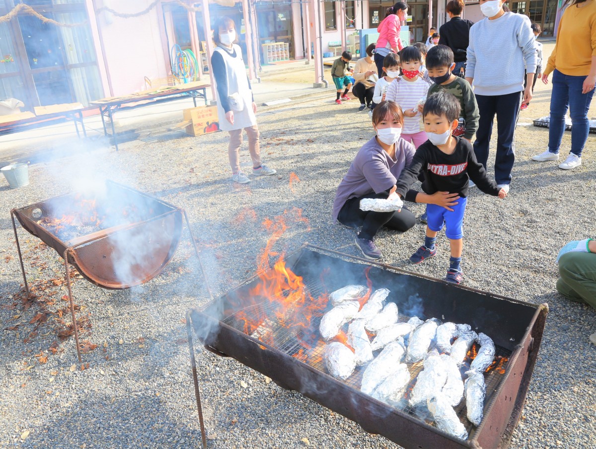 毎年、春に園の畑でサツマイモ苗を植え、秋に収穫をしています。今年も、園小教育後援会の皆さんや中瀬清美さんのご厚意でサツマイモ堀りをさせてもらい、芋掘り体験をしました。そして、収穫した芋を使って焼き芋パーティーをしました。自分たちで落ち葉を拾ったり、お芋を洗ったり、新聞紙やアルミホイルに巻いたりして準備し、わくわくしながらの参加となりました。栽培アドバイザーの佐山貢さん、植松賎夫さんにお世話になり、おいしい焼き芋が出来上がりました。子どもたちは「あまーい」「おいしい」と目をキラキラさせて「おかわり」とたくさん食べることができました。自分たちで収穫したものを味わうって素敵なことだなとつくづく感じました。何よりも子どもたちの笑顔が印象的でした。