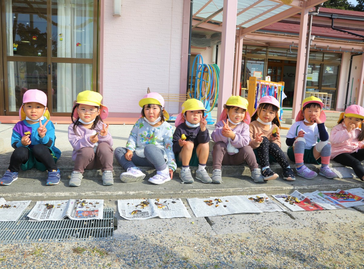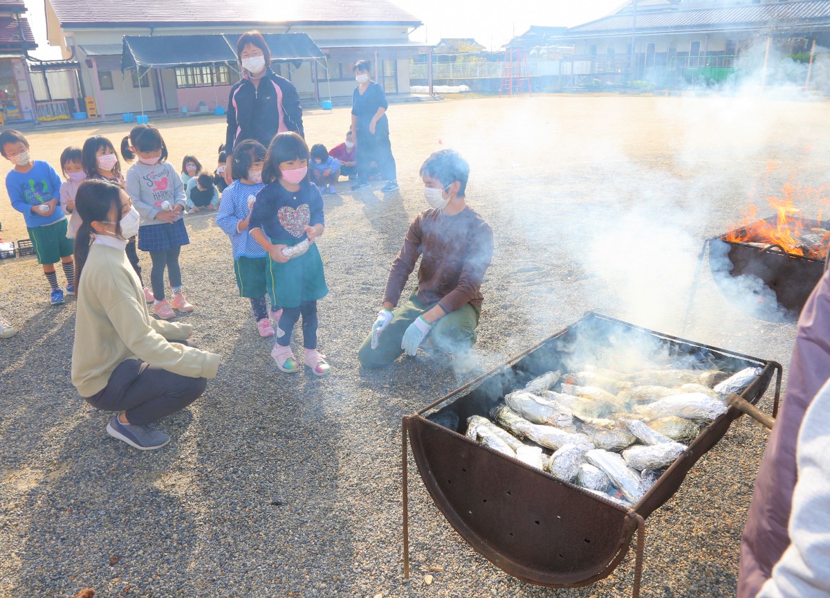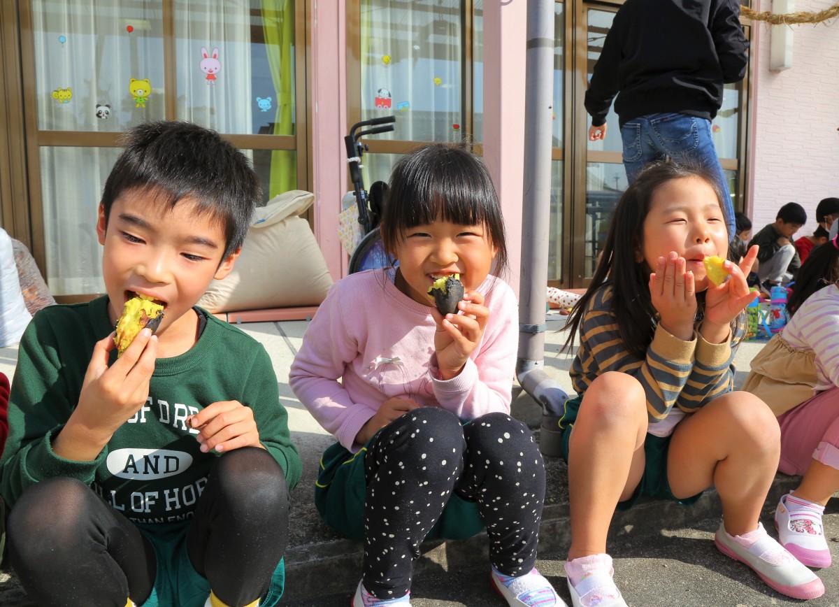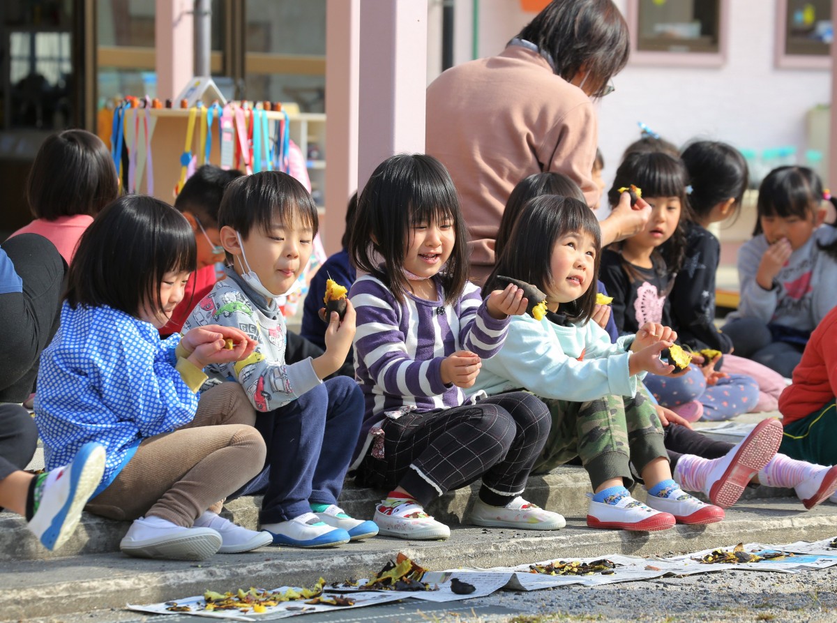 毎年、春に園の畑でサツマイモ苗を植え、秋に収穫をしています。今年も、園小教育後援会の皆さんや中瀬清美さんのご厚意でサツマイモ堀りをさせてもらい、芋掘り体験をしました。そして、収穫した芋を使って焼き芋パーティーをしました。自分たちで落ち葉を拾ったり、お芋を洗ったり、新聞紙やアルミホイルに巻いたりして準備し、わくわくしながらの参加となりました。栽培アドバイザーの佐山貢さん、植松賎夫さんにお世話になり、おいしい焼き芋が出来上がりました。子どもたちは「あまーい」「おいしい」と目をキラキラさせて「おかわり」とたくさん食べることができました。自分たちで収穫したものを味わうって素敵なことだなとつくづく感じました。何よりも子どもたちの笑顔が印象的でした。