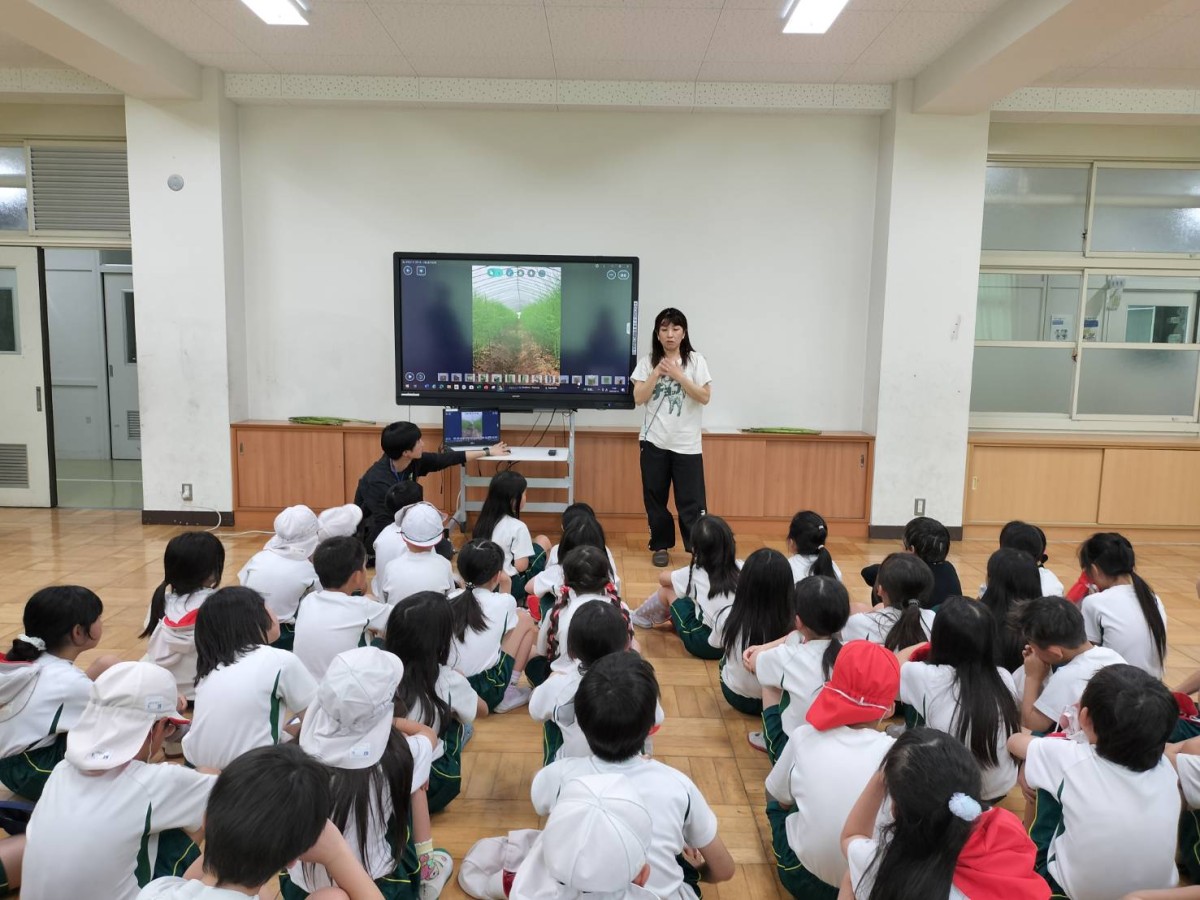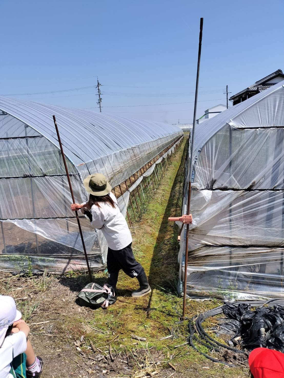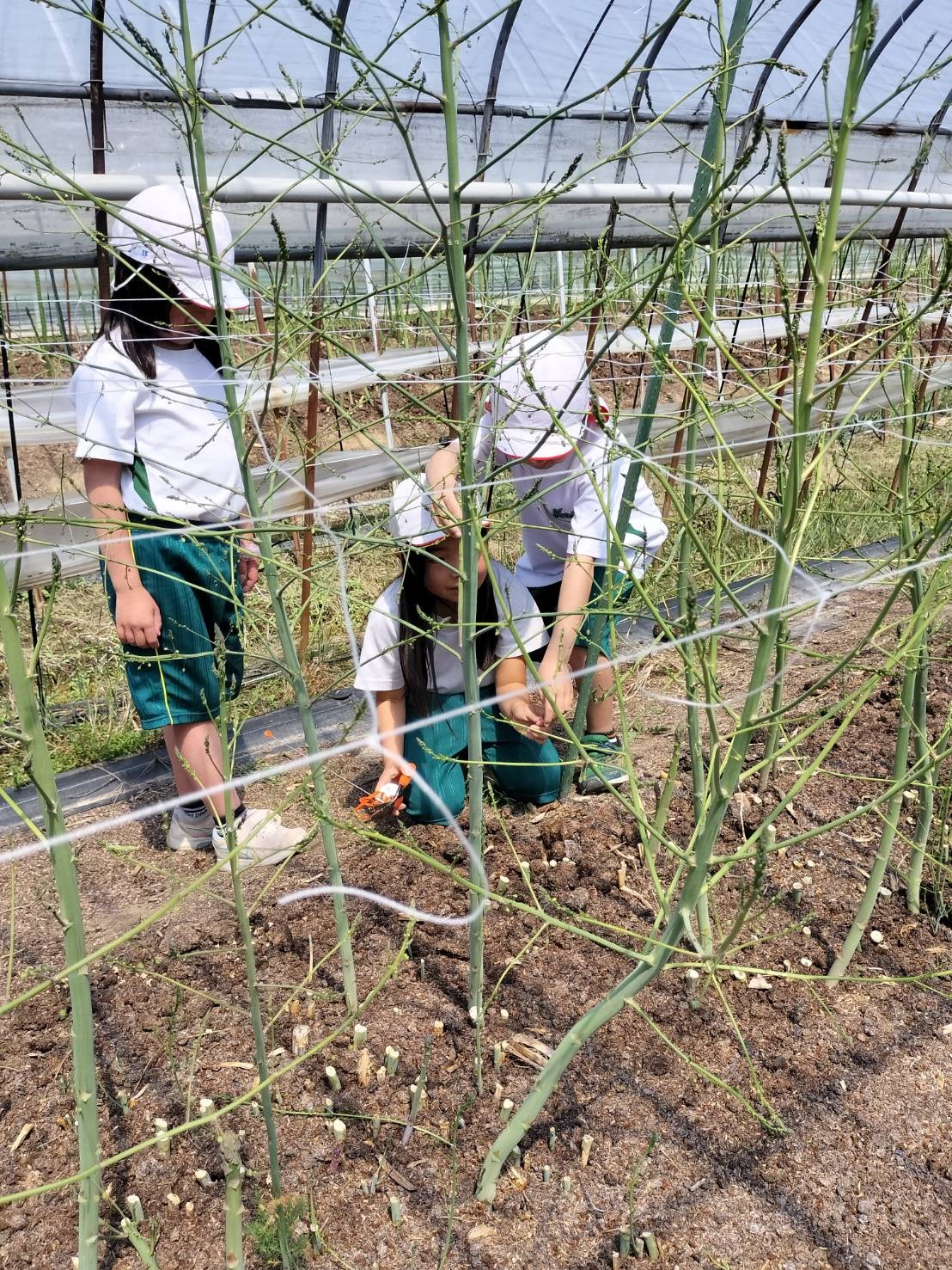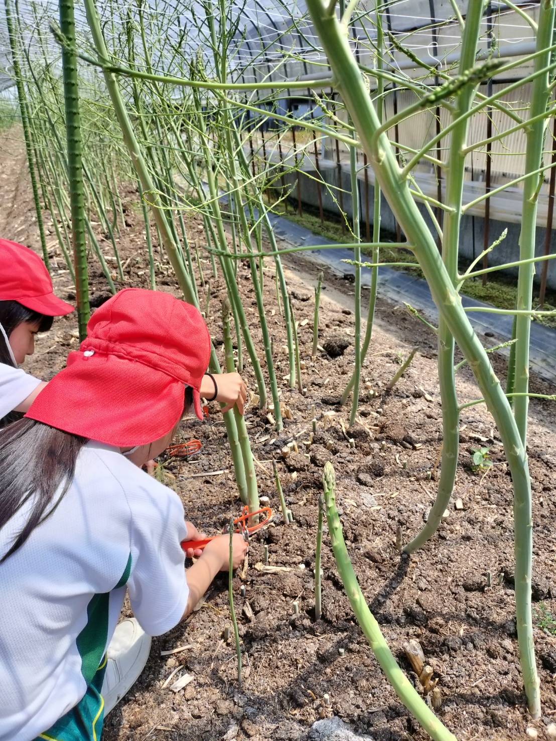 5月13日(火)3年生が「アスパラ名人のお話を聞こう」という学習で、北山田町の木村桂さんから、草津ブランドの【琵琶湖元気アスパラ】について教えていただきました。木村さんから、アスパラは一日に15センチも伸びると聞き、「えーっ!」と驚きの声を上げた子どもたち。スーパーに並ぶ他の産地のアスパラに比べて、太くて長い、見るからにパワー溢れる元気アスパラがどんな風に育てられているのか、実際にビニールハウスを見学させていただきました。5月とはいえ、ビニールハウスの中は暑かったのですが、子どもたちは、その中でスクスク育っているアスパラを見つけ、暑さもなんのその。グループで、艶が良く穂先がキュッとしまった理想の1本を見つけ、切らせてもらい大喜び。切り口を触ったり匂いを嗅いだりして、新鮮なアスパラを感じることができました。使用したハサミは、長さの目安となる棒が付いていて、アスパラを挟むトングも兼ねている便利な物です。ビニールハウスの外側のビニールは、ハンドル操作で巻き上げたり下ろしたりして気温の調節をすることや、琵琶湖から汲み上げた水をスイッチひとつでスプリンクラーになって水やりができることを教えていただき、農家さんの苦労や工夫を知ることができました。その後、学校に帰り、アスパラの1年間の様子を映像で見せていただきました。木村さんは、「元気アスパラが美味しいのは、土に魚粉などの栄養を与えているから。この土地で採れたものは美味しいし体にも良い」と、地産地消についてお話されました。自分達で切り取ったアスパラ20本は教室に持ち帰りましたが、その後、観察したのかな?絵に描いたのかな?おうちの方にも、きっと心弾ませお話したことでしょう。今日のことは深く心に残ったことだと思います。これからも、店頭でアスパラを目にする度、今日の学習を思い出してくれたらいいなと思います。木村さんには、野菜の収穫、出荷でお忙しいこの時期に子どもたちに貴重な体験をさせていただいて、本当に感謝の念が絶えません。ありがとうございました。学校から歩いて行ける距離に学べるところが沢山ある山田小の子どもたちは幸せですね。