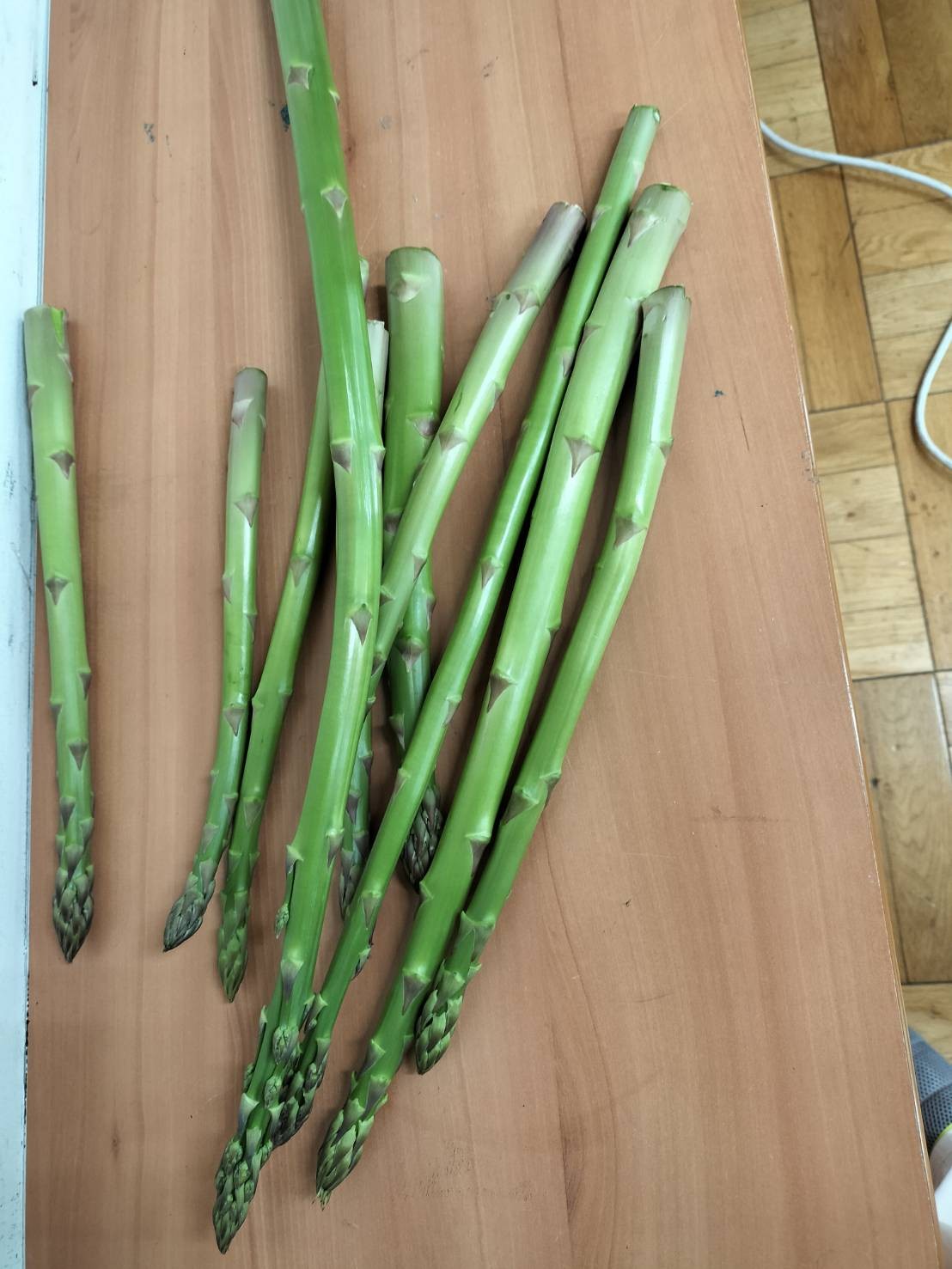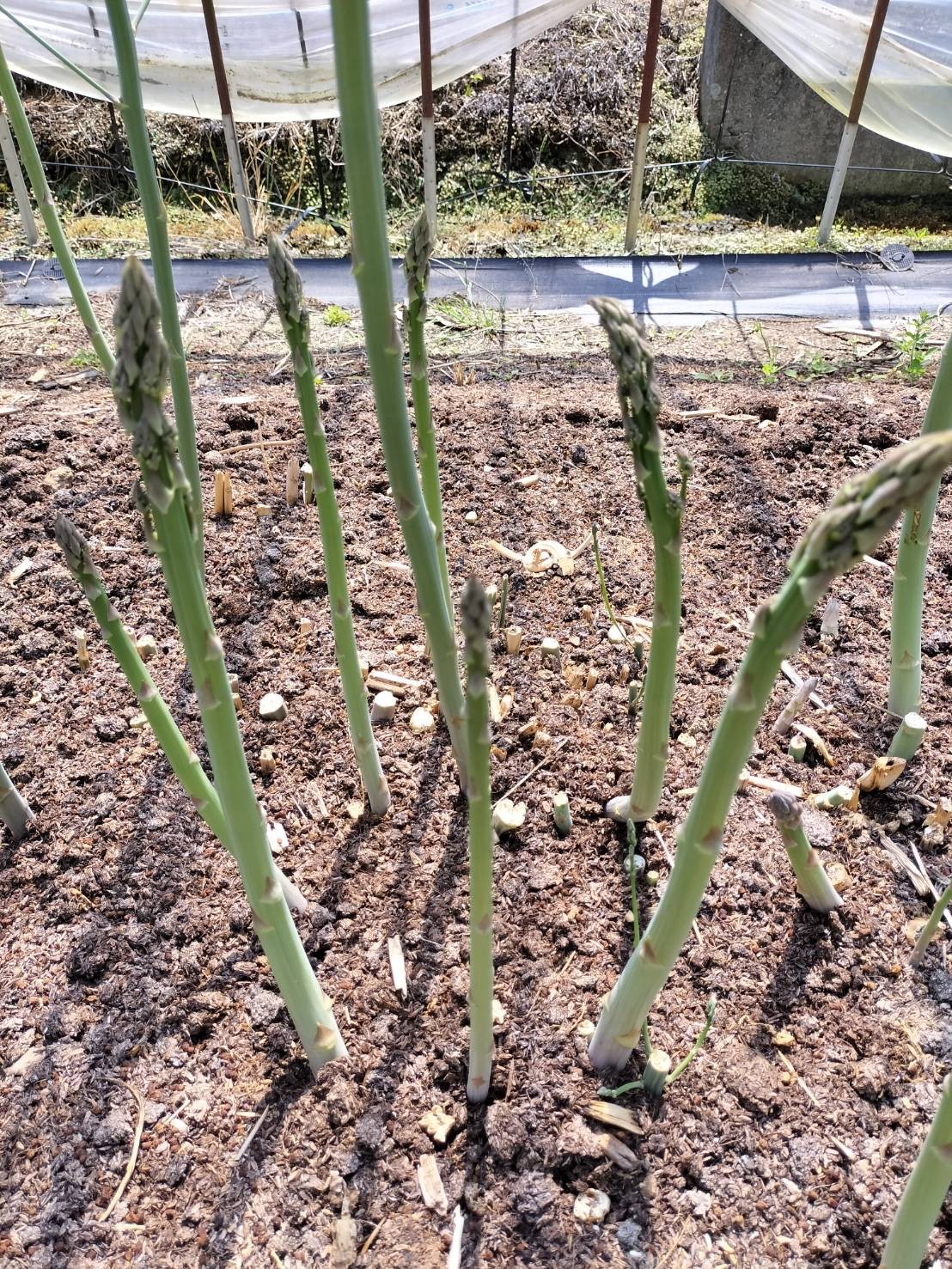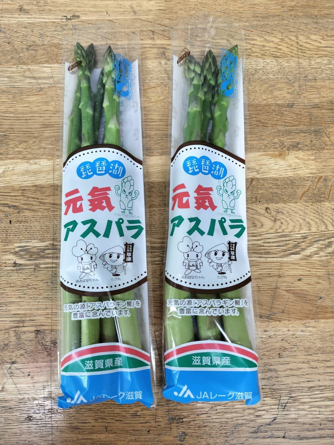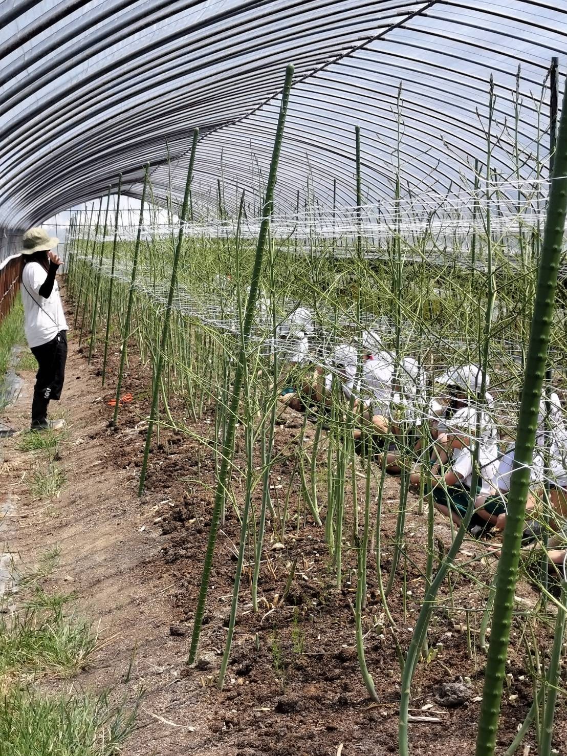 5月13日(火)3年生が「アスパラ名人のお話を聞こう」という学習で、北山田町の木村桂さんから、草津ブランドの【琵琶湖元気アスパラ】について教えていただきました。木村さんから、アスパラは一日に15センチも伸びると聞き、「えーっ!」と驚きの声を上げた子どもたち。スーパーに並ぶ他の産地のアスパラに比べて、太くて長い、見るからにパワー溢れる元気アスパラがどんな風に育てられているのか、実際にビニールハウスを見学させていただきました。5月とはいえ、ビニールハウスの中は暑かったのですが、子どもたちは、その中でスクスク育っているアスパラを見つけ、暑さもなんのその。グループで、艶が良く穂先がキュッとしまった理想の1本を見つけ、切らせてもらい大喜び。切り口を触ったり匂いを嗅いだりして、新鮮なアスパラを感じることができました。使用したハサミは、長さの目安となる棒が付いていて、アスパラを挟むトングも兼ねている便利な物です。ビニールハウスの外側のビニールは、ハンドル操作で巻き上げたり下ろしたりして気温の調節をすることや、琵琶湖から汲み上げた水をスイッチひとつでスプリンクラーになって水やりができることを教えていただき、農家さんの苦労や工夫を知ることができました。その後、学校に帰り、アスパラの1年間の様子を映像で見せていただきました。木村さんは、「元気アスパラが美味しいのは、土に魚粉などの栄養を与えているから。この土地で採れたものは美味しいし体にも良い」と、地産地消についてお話されました。自分達で切り取ったアスパラ20本は教室に持ち帰りましたが、その後、観察したのかな?絵に描いたのかな?おうちの方にも、きっと心弾ませお話したことでしょう。今日のことは深く心に残ったことだと思います。これからも、店頭でアスパラを目にする度、今日の学習を思い出してくれたらいいなと思います。木村さんには、野菜の収穫、出荷でお忙しいこの時期に子どもたちに貴重な体験をさせていただいて、本当に感謝の念が絶えません。ありがとうございました。学校から歩いて行ける距離に学べるところが沢山ある山田小の子どもたちは幸せですね。