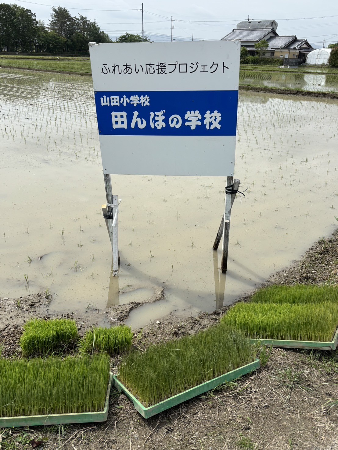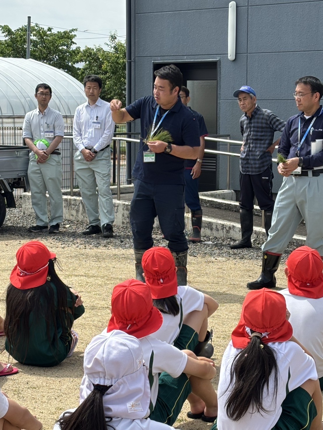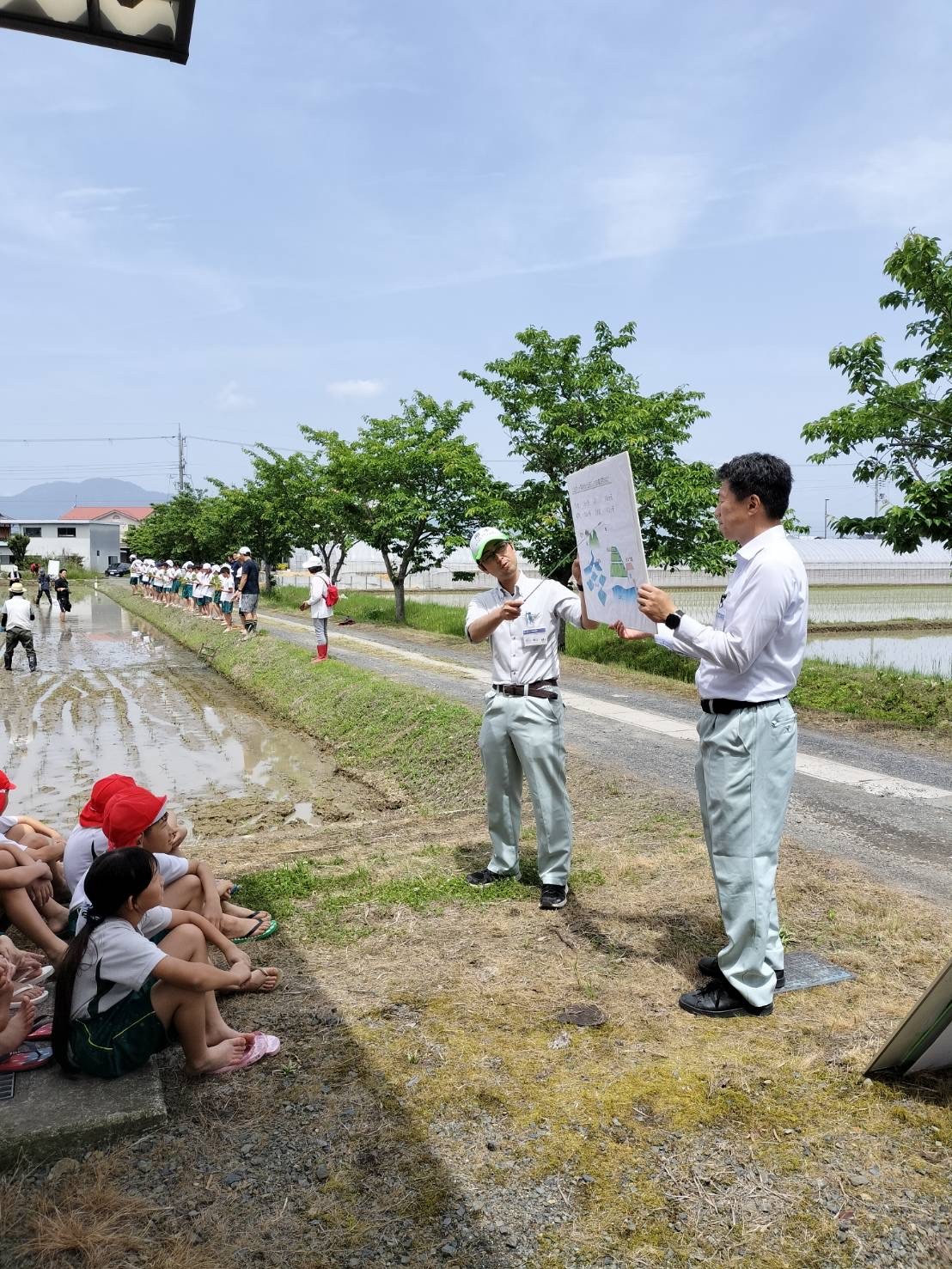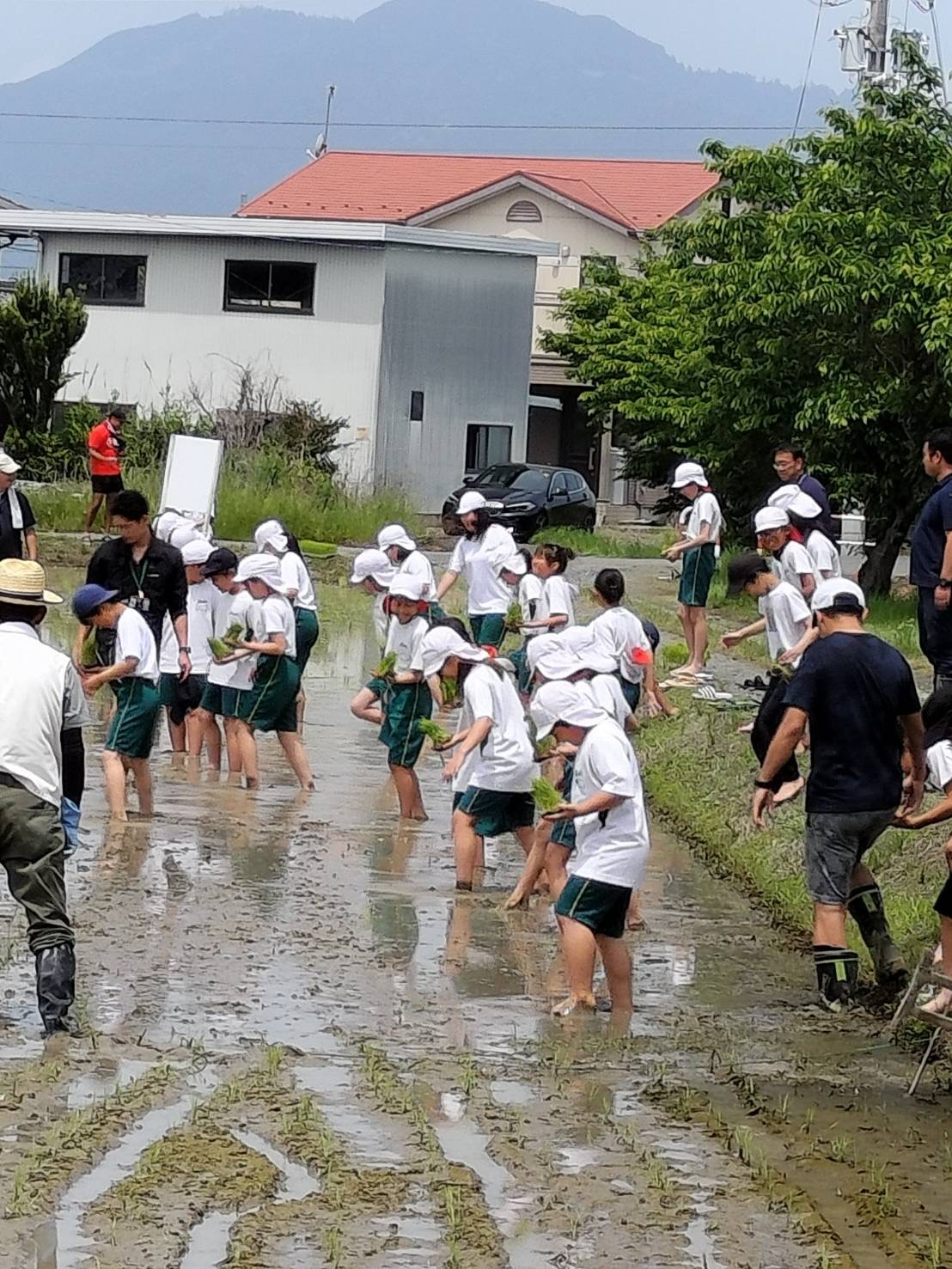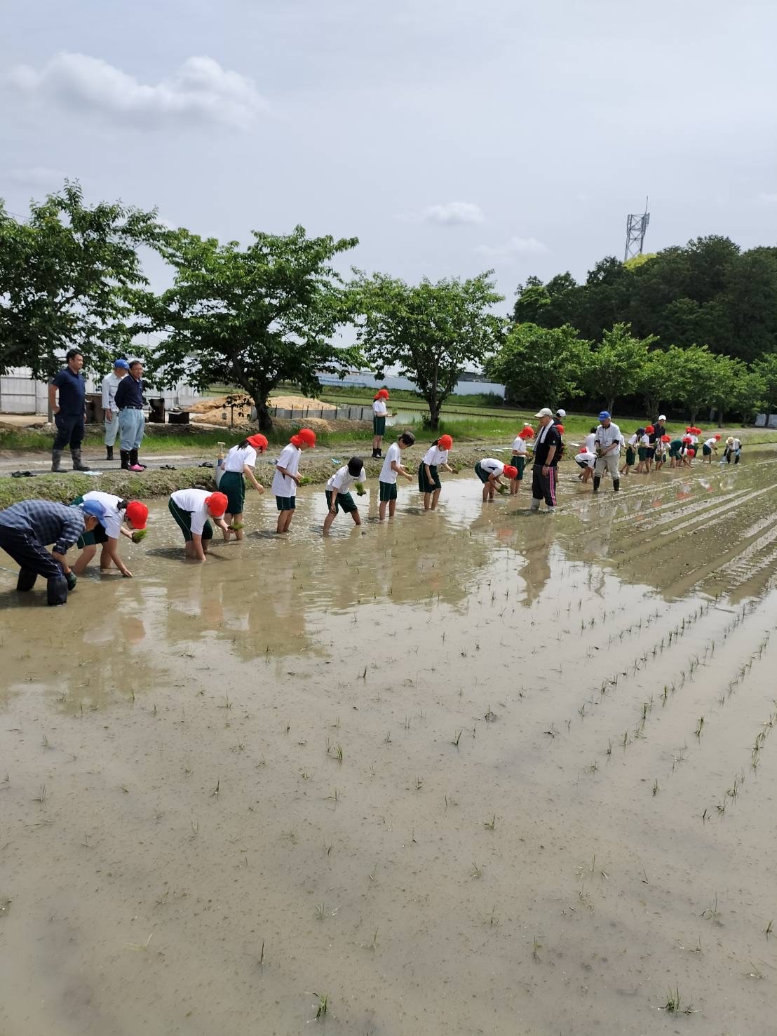 この日植えた品種は【キヌヒカリ】です。9月中旬に予定している稲刈りまでの約4ヵ月間、水の管理や雑草対策など、環境を守る会の方にお世話になります。コメ不足や値段の高騰が問題になっている昨今、子どもたちにとっては、みんなで植えた苗の成長が大きな楽しみになりそうですね。実りの秋まで、天候も気になることでしょう。時々は稲の生育具合を見に田んぼに行く子がいると嬉しいです。