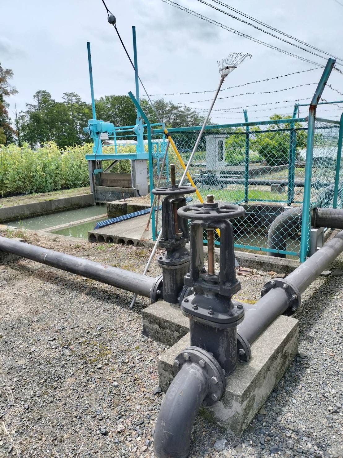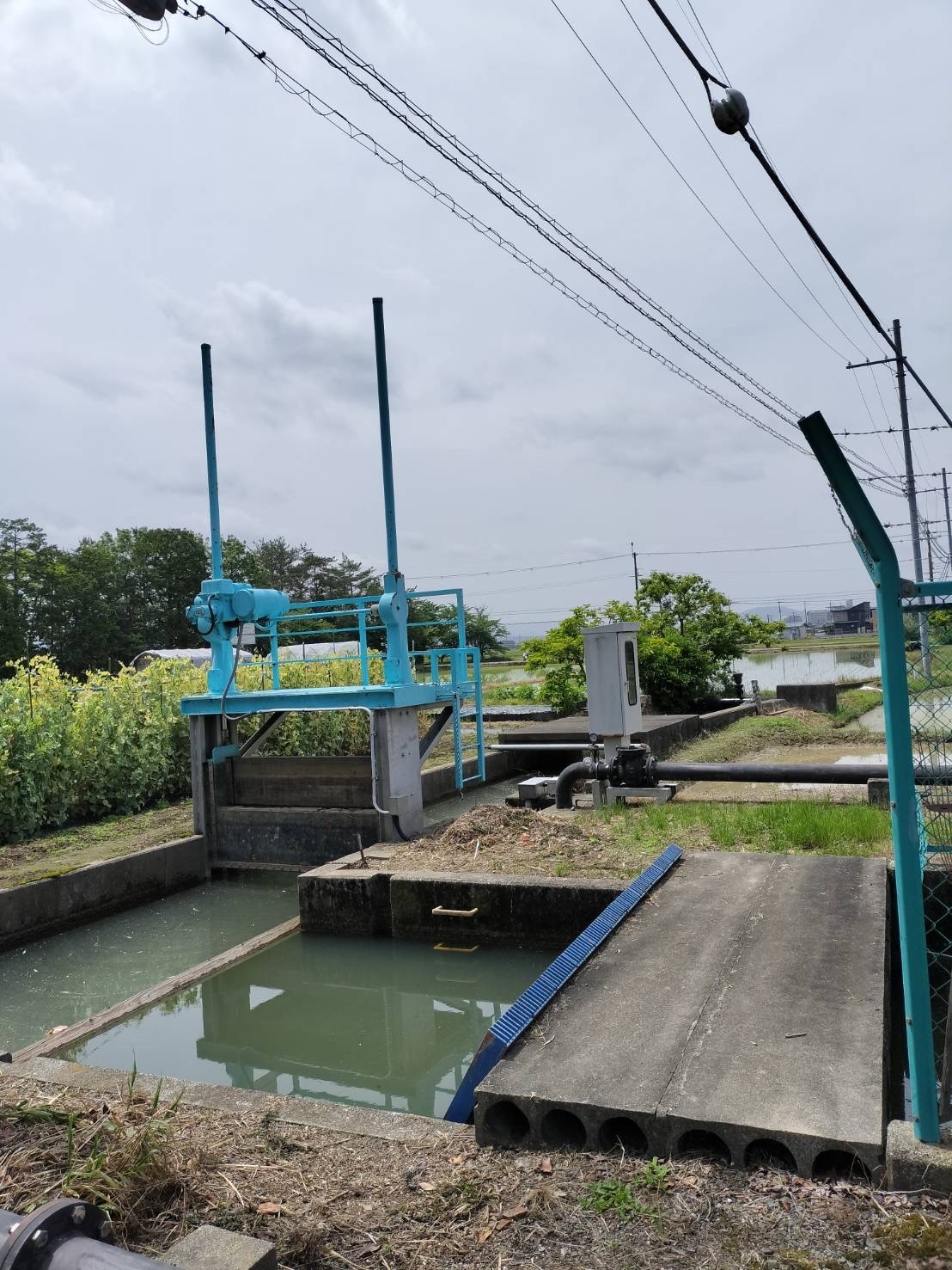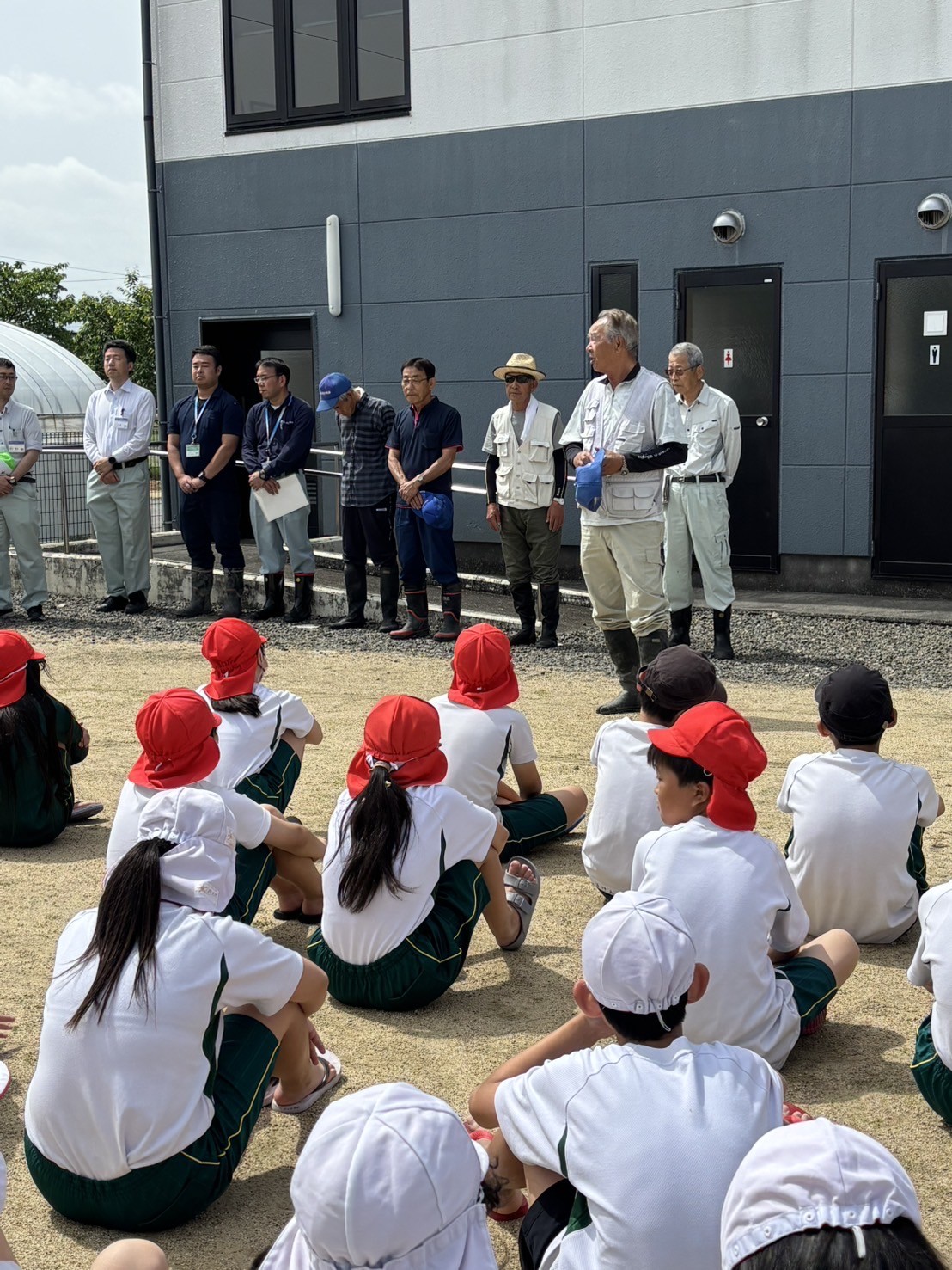 また、田んぼに隣接しているポンプ小屋では『水土里ネット草津用水』の山本さんと熊川さんから、米作りに必要な水についてお話を聞きました。一枚の田んぼには学校のプール10杯分の水が必要なことや、一旦琵琶湖から汲み上げて、それぞれの田んぼに供給していることなどを教えていただきました。ポンプ小屋にある大がかりな設備も見せていただきました。子どもたちは興味津々でお二人に質問攻め、熱心に学ぶ姿が見られました。