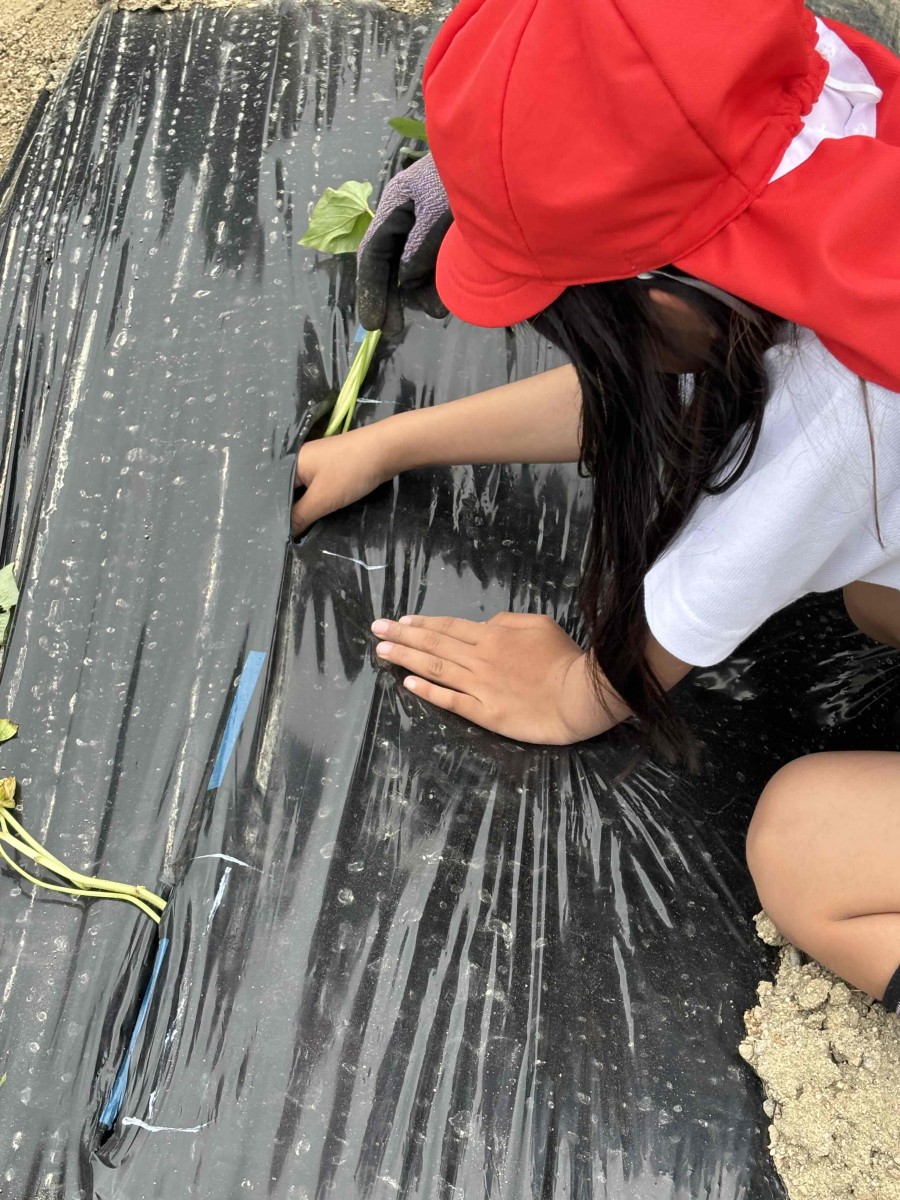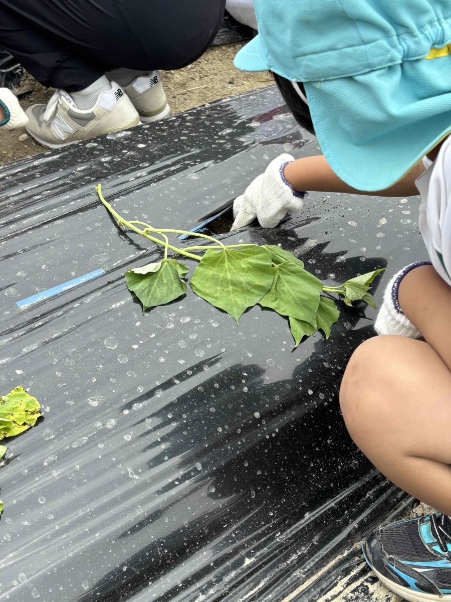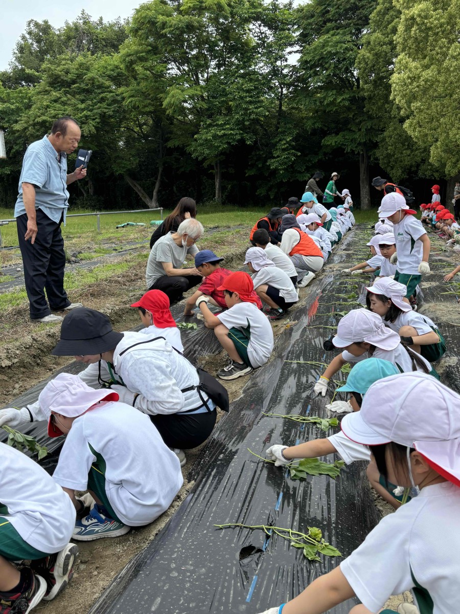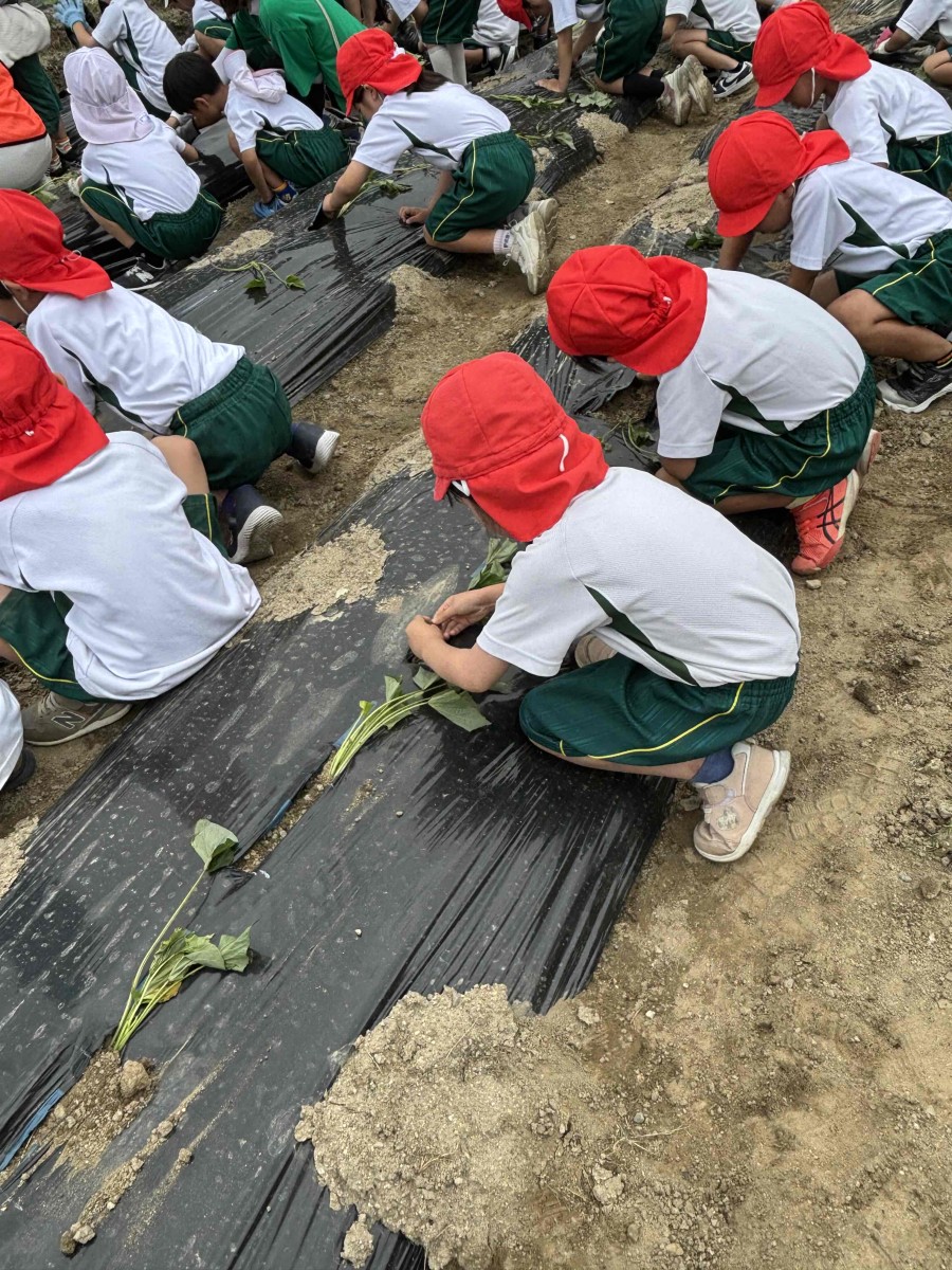 5月21日(水)1年生が山田こども園年長児さん達と一緒にさつまいもを植えました。初めに教育後援会会長の久泉 茂さんからお話しがあり、植え方を教えていただきました。畑には既にさつまいも苗が並べてあり、苗を横向きにして、しっかり土をかぶせました。おいもがたくさんなるよう願いながら子ども達は軍手をした小さな手で一生懸命に土を掘り、植えていきました。この日までに、畑を耕したり、苗の用意をしたり準備にたくさんの方々が関わってくださいました。ありがとうございました。また、入学してまだ間もない小学一年生とやがては同じ山田小学校で一緒する年長児さんとがこの活動を通して交流できた大切な時間となりました。おいもの収穫が楽しみです。