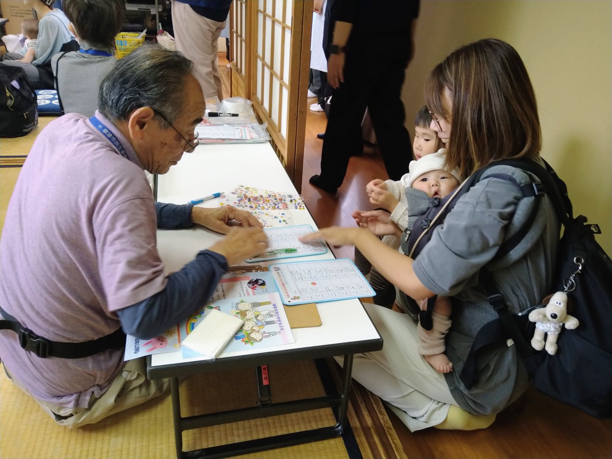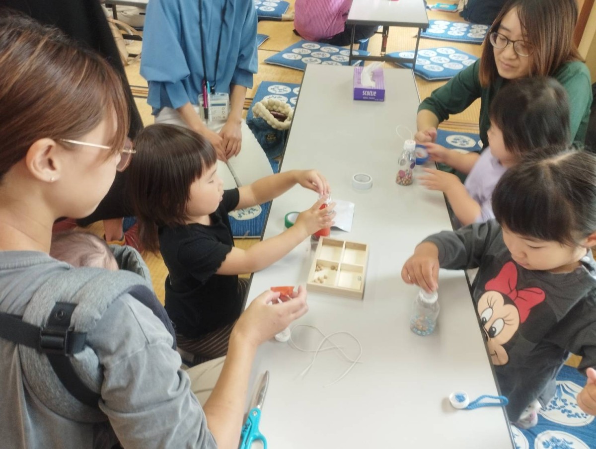 一方、ガラガラおもちゃづくりは、透明の乳酸飲料容器に豆・カラフルビーズを入れシールを貼って振るとミニマラカスの完成!赤ちゃんの手にぴったり!
