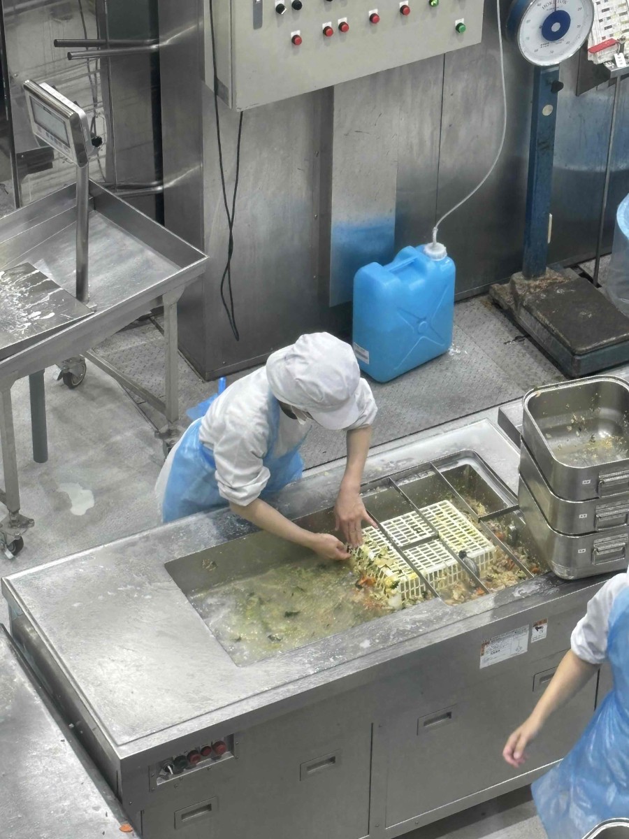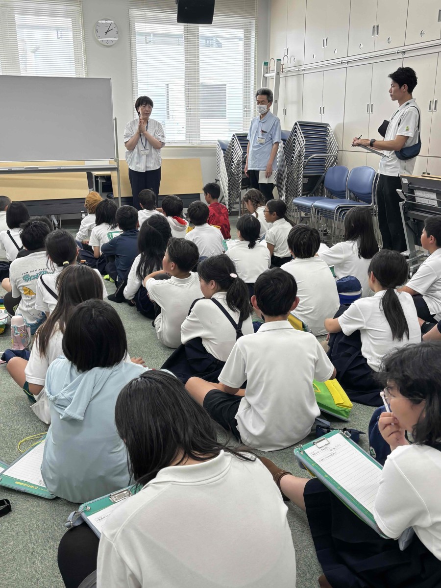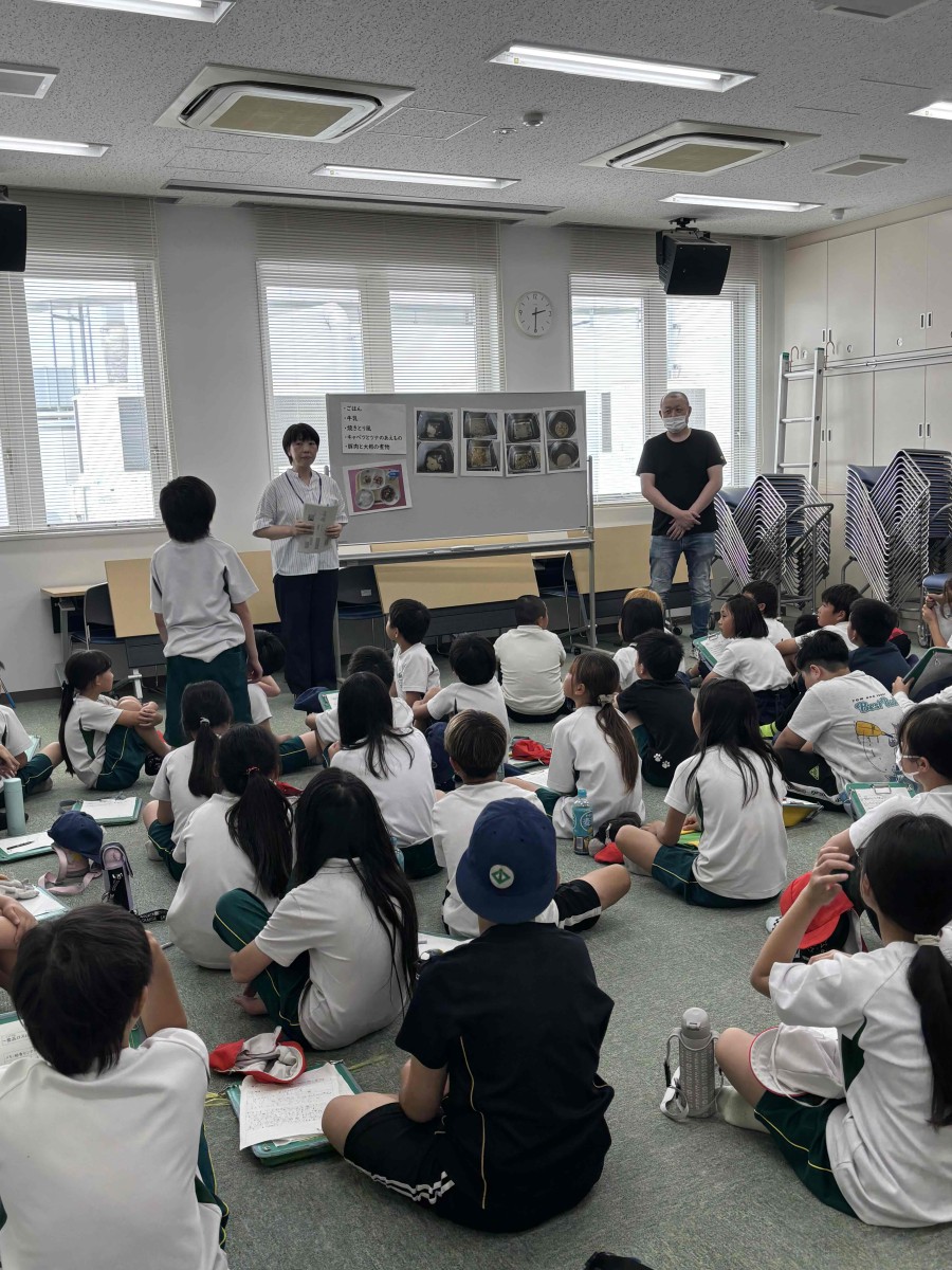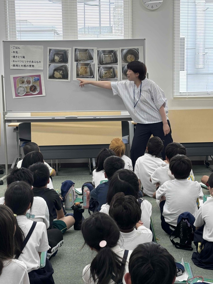 6月6日午後、5年生が給食センターを訪れました。センターの藤田さんからお話があり、自分達の給食後の食缶の写真を見せてもらいました。1組も2組もこの日の食べ残しは少なかったようですがゼロではありませんでした。そして、草津市内から食缶が運ばれてきて処理される様子を2階の窓から見学しました。食べ残しが入った食缶がひっくり返され、流れて行くのが見えました。食べ残しのご飯は焼却ゴミとして処理され、他のおかずなどは加工され肥料になるそうです。市内全小学校への給食は約9000食分作られていて、1日500Kgもの食べ残しや野菜のヘタなどの切りくずがあるそうです。自分ひとりでは少し残しただけだと思っていても、こうやって集まってくるのを見たりお話を聞いたりすると食べ残しの多さに驚いてしまいます。質問タイムでは給食を作っておられる調理師の薄井さんがわかりやすく答えてくださいました。質問の中で「この食べ残しを食べ物がない子たちにあげる方法はないのですか?」という子どもの声が印象に残りました。最後には薄井さんの給食作りに関わる思いや願いなどを聞かせてもらいました。