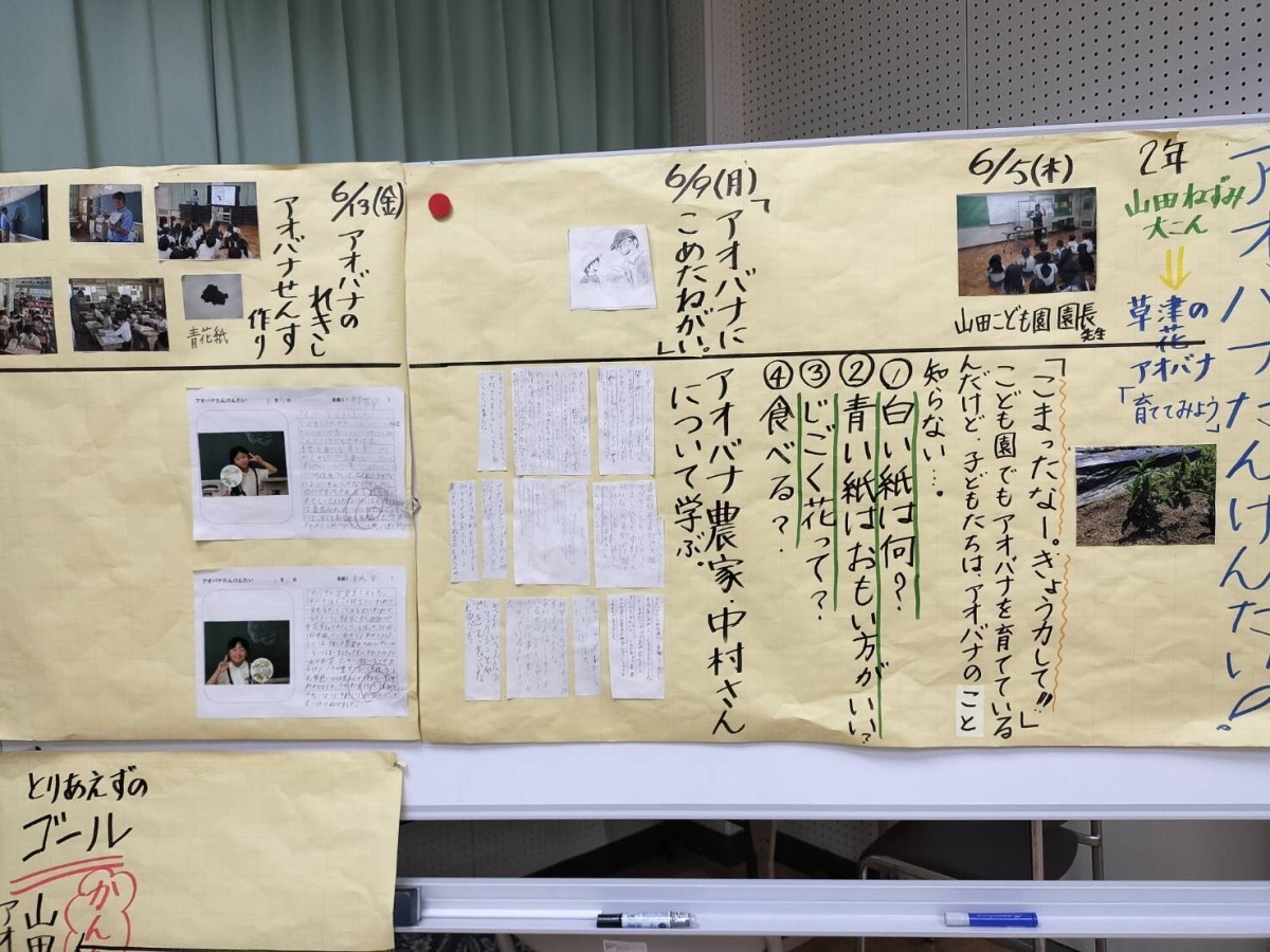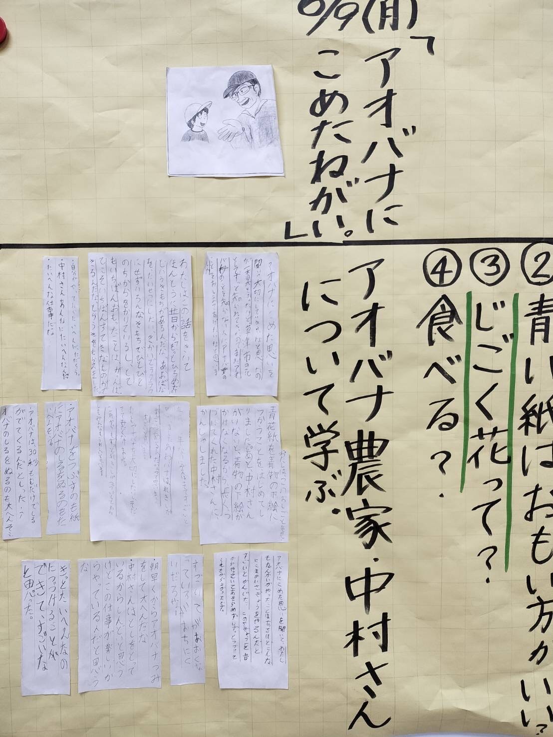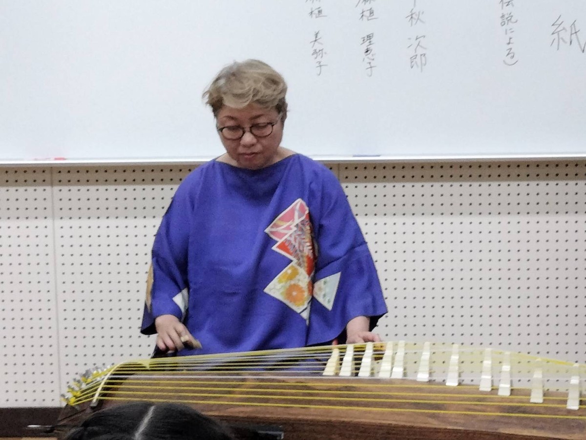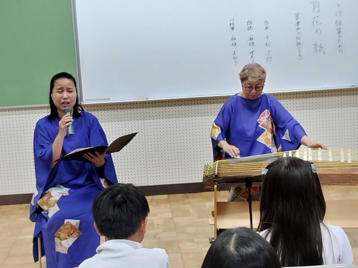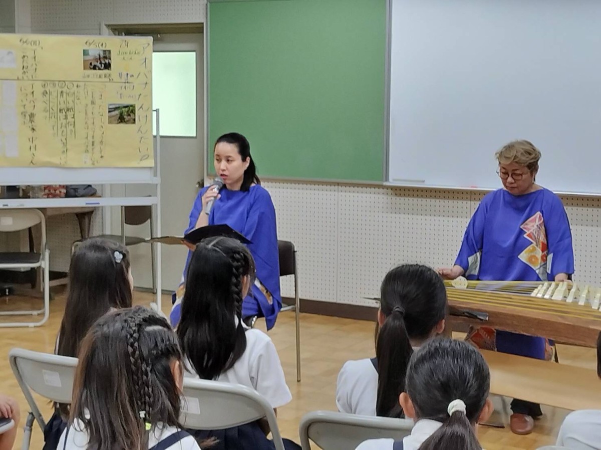 3年生の子ども達も、実際に青花を育て、暑さの中で花を摘む体験をしています。そして、『山田こども園の子どもたちに青花のことを教える絵本や紙芝居を作る』というゴールに向かって学習していることもあり、熱心に聞いていました。初めて目にする十七絃筝にも興味津々の様子でした。4年生になったら筝の学習があると聞き、その時が待ち遠しいという感じの子ども達でした。来年、実際にお筝に触れたら、また新鮮な感動が得られることでしょう。楽しみですね。