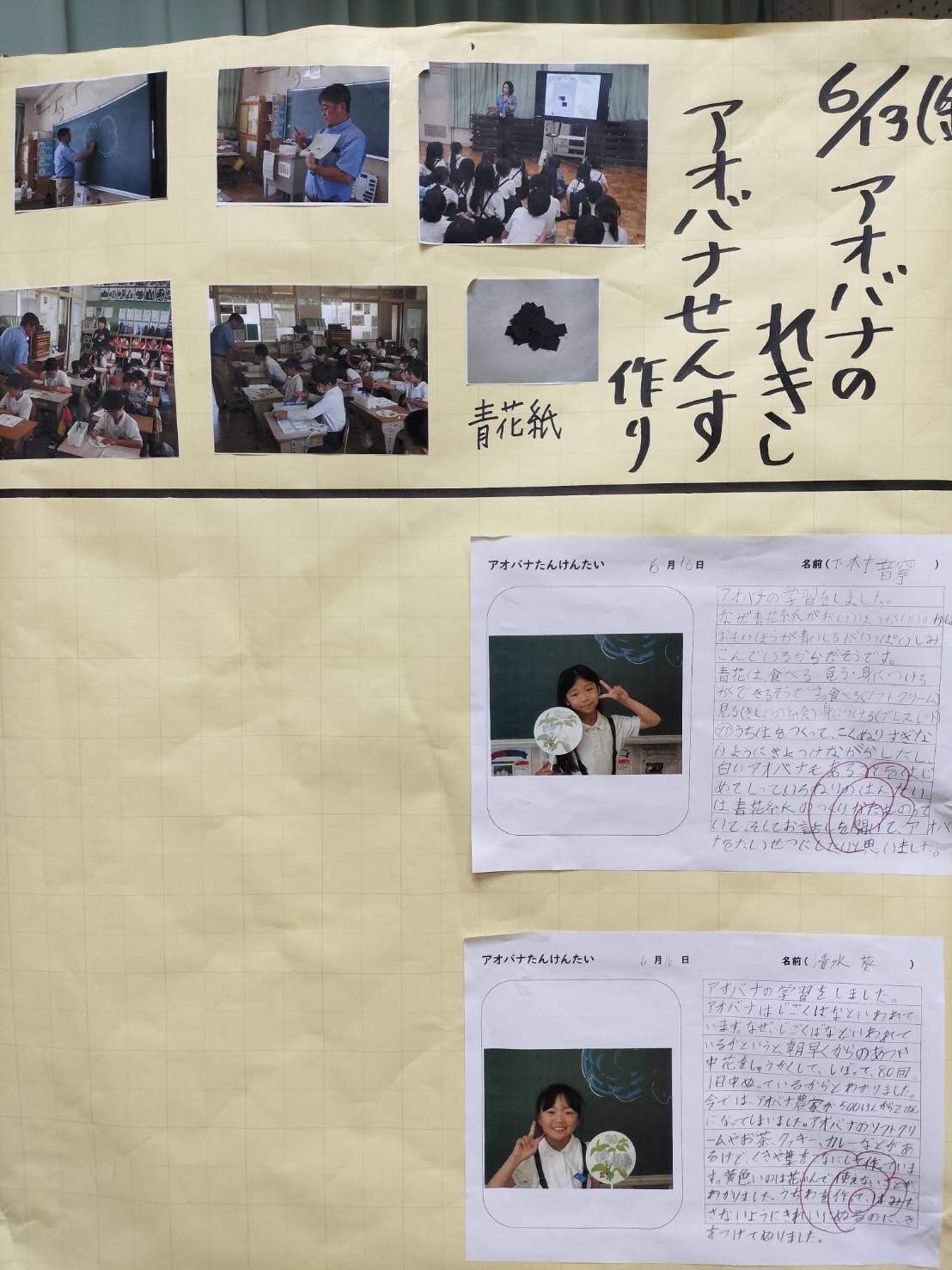 9月4日(木)3年生が『青花探検隊』の学習で、筝演奏家の麻植美弥子さんと理恵子さんを講師にお迎えして、木川町にまつわる民話【青花の紙】のお話を聞きました。朗読と十七絃筝のための【青花の紙】というもので、筝の音色をバックに、キヨという娘を主人公にした民話の朗読です。母親と貧しい暮らしをしているキヨは、ある夜、夢に出てきた観音様のお告げで米に恵まれますが、魔が差して欲深くたくさん取ったので、米が貰えなくなりました。キヨは欲深い自分を悔い改め善行に努めますが、心は晴れないままでした。ある夜、また観音様が夢に現れ、欲を出したので白い米を黒い粒に変えたと告げられます。お告げどおりに黒い粒を畑に蒔いて育てると青い花が咲きました。その花を摘み、絞った汁を和紙に染み込ませて乾かしました。その和紙を京の友禅問屋が下絵描きに使うからと高く買ってくれました。そのお金で薬を買うことが出来、母親の病気も治りました。その話を聞いた村の人々も青花を育てるようになり、木川では青花の紙が盛んに作られるようになった、というお話です。