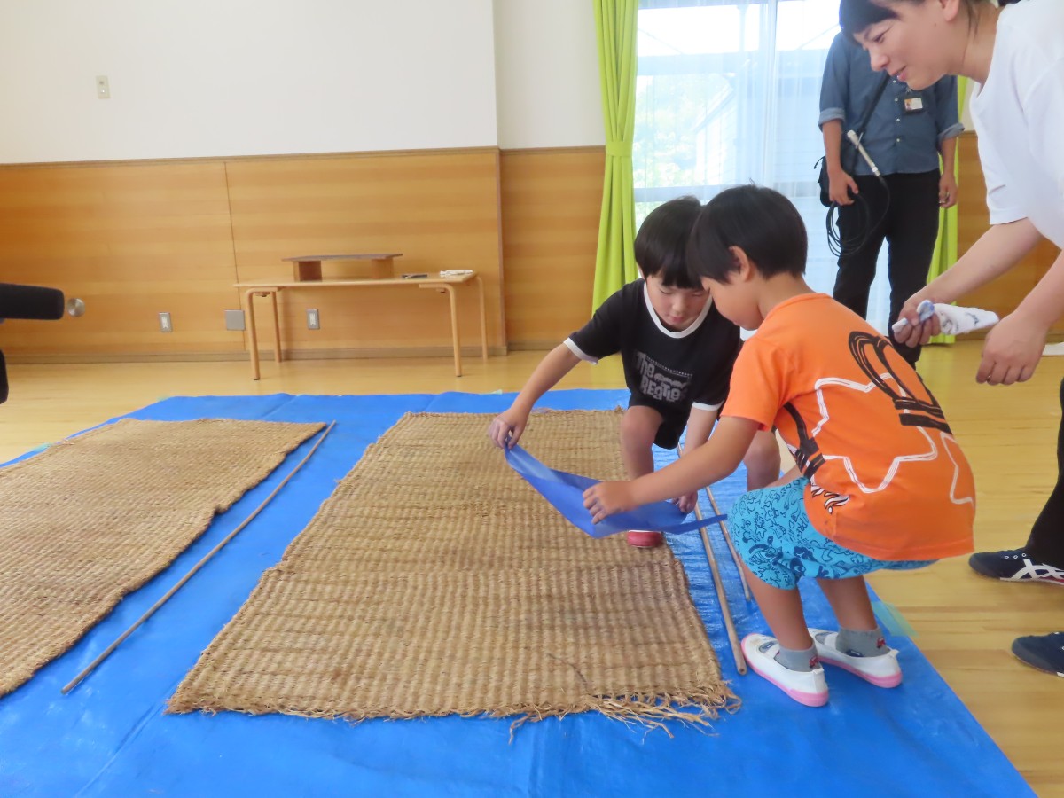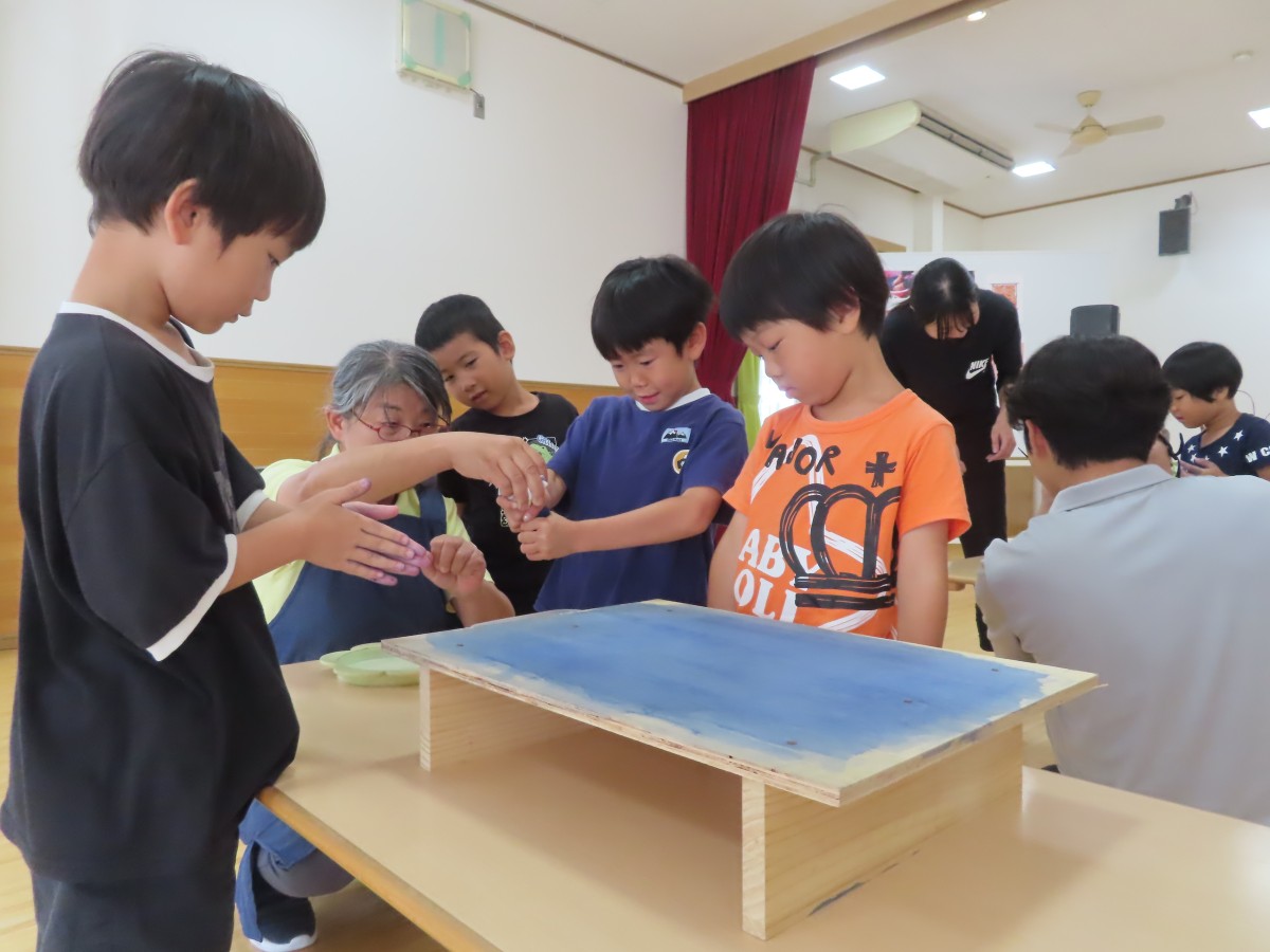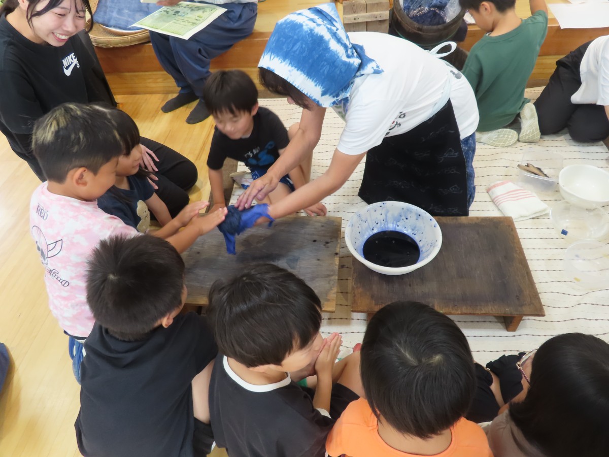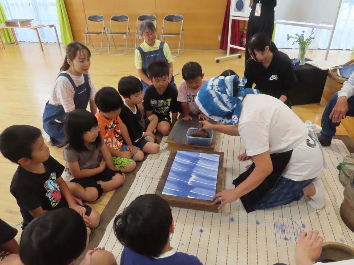 山田こども園で38年にわたり行っている、伝統の『アオバナ紙』の染め体験を今年も8月29日(金)に行いました。