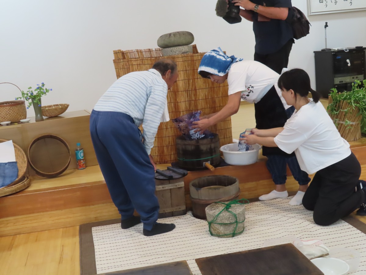 当日は、佐山貢様(アオバナのおじいちゃん)杉江由紀子様(アオバナのおばあちゃん)にご協力いただき、大切に集めたアオバナを使い、昔ながらの道具を使った技法の実演を見たり、実際に自分で絞ったアオバナの汁を和紙に塗り重ねたりして、山田の伝統文化を体験しました。活動様子はNHK・BBC・ZTVからも取材をうけました!
