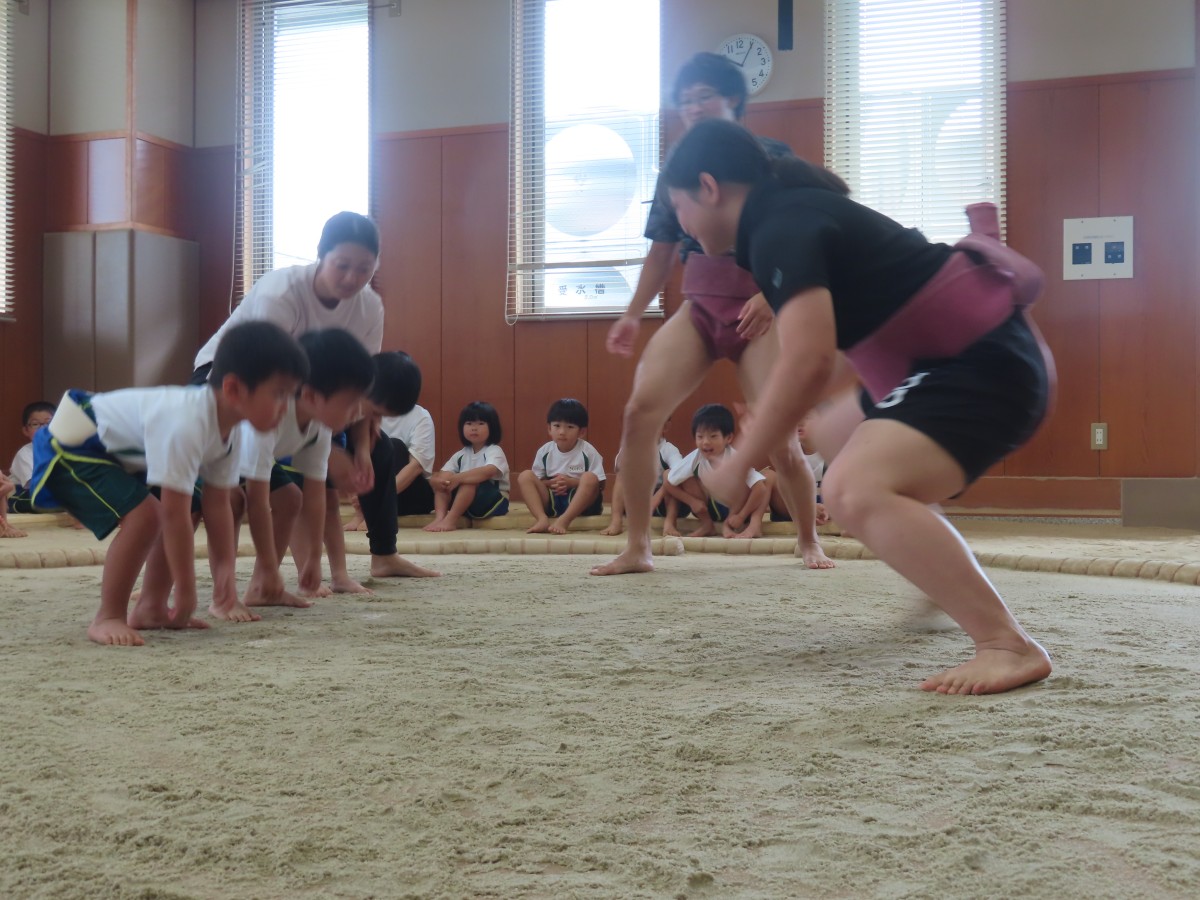 「しなやかな心と体をはぐくむ」ことをねらいとして、年間6回ほど国技である相撲を体験しています。日頃は元力士の横江英樹さんにご指導いただいていますが、今回は立命館大学相撲部のみなさんを講師にお迎えしました。相撲独特の動きを通して体幹や足腰の筋力を鍛えたり、相手と向き合う礼儀作法を身につけたりしながら、友達への思いやりの気持ちや周りで見守ってくださる方への感謝の気持ちを育んでいます。
