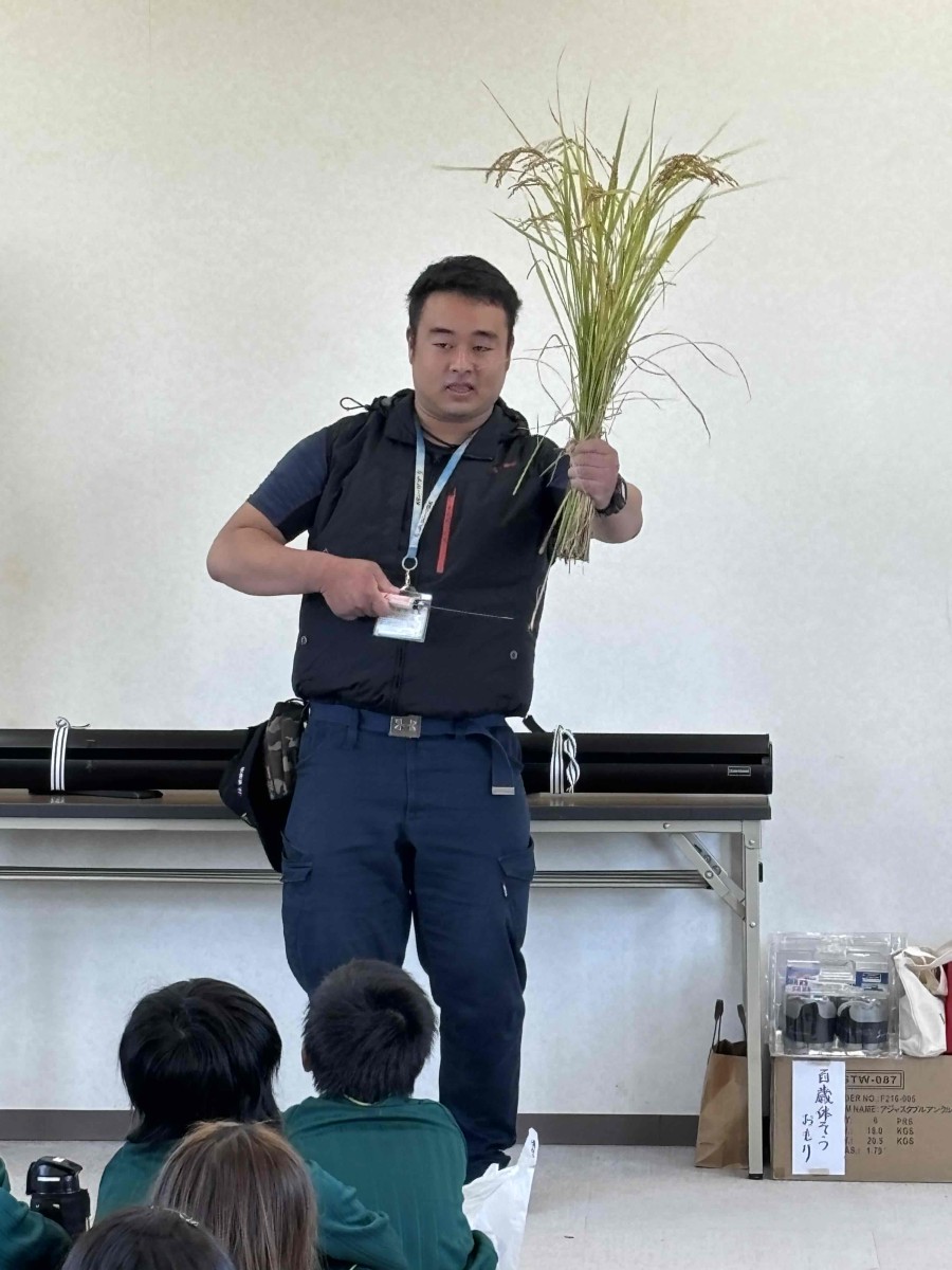 田んぼでは、5月に植えた苗が美しく立派に成長し、実を付けていました。ここまで育てていただいたことに感謝しながらの稲刈りです。全員が1列に並び、ペアを組んだ友達と交代しながら刈り取って行きました。あまりの暑さに、途中でお茶休憩をしながらも、どんどんと刈り進んでいきました。ひと通り刈り取った後、残った部分はコンバインで刈り取り脱穀する様子を見せていただきました。途中で、担任の先生がコンバインでの刈り取りに挑戦するという〝サプライズ〟もあり、子どもたちにとっても記憶に残る稲刈りになったのではないかと思います。