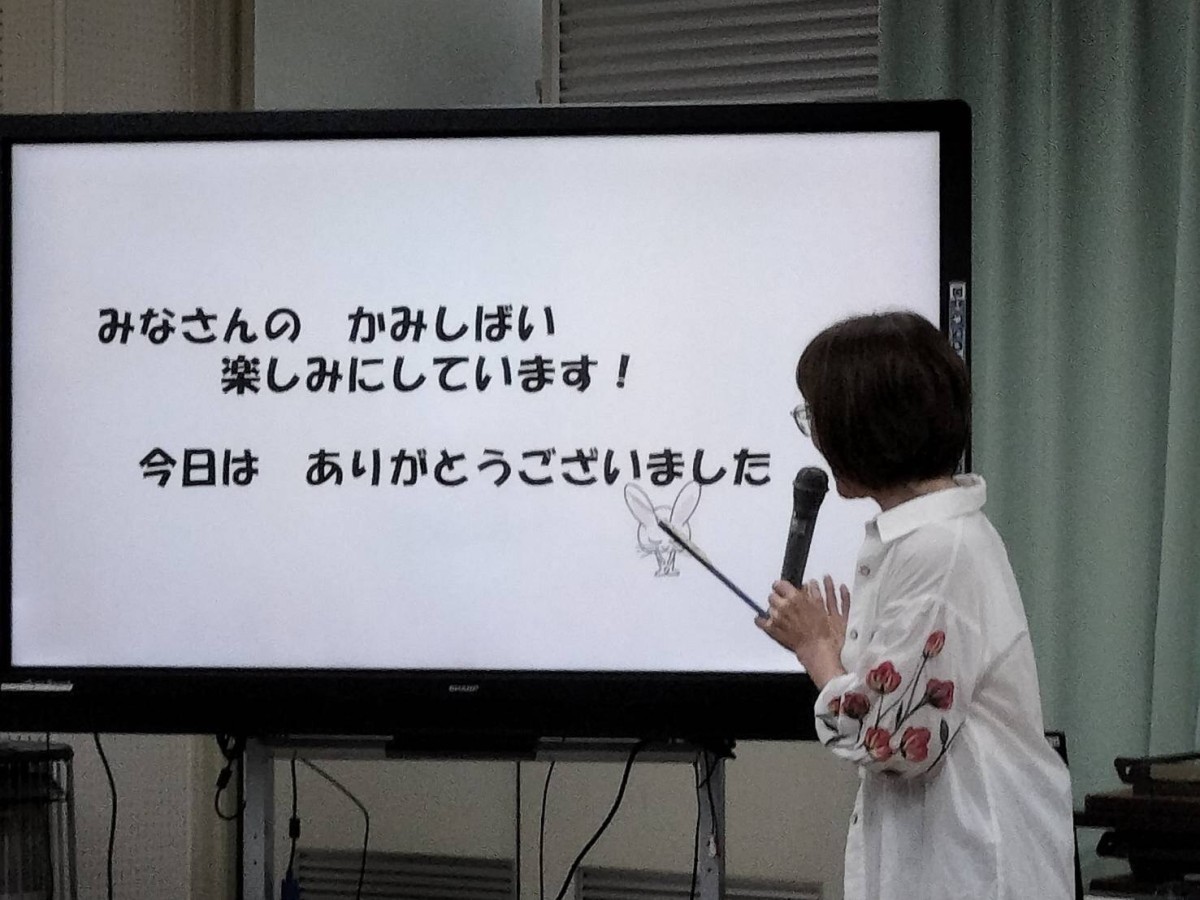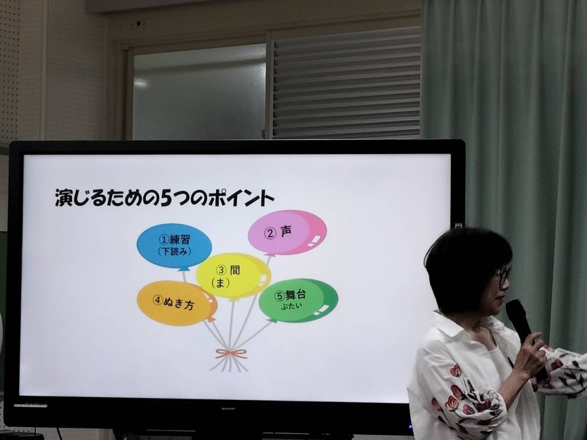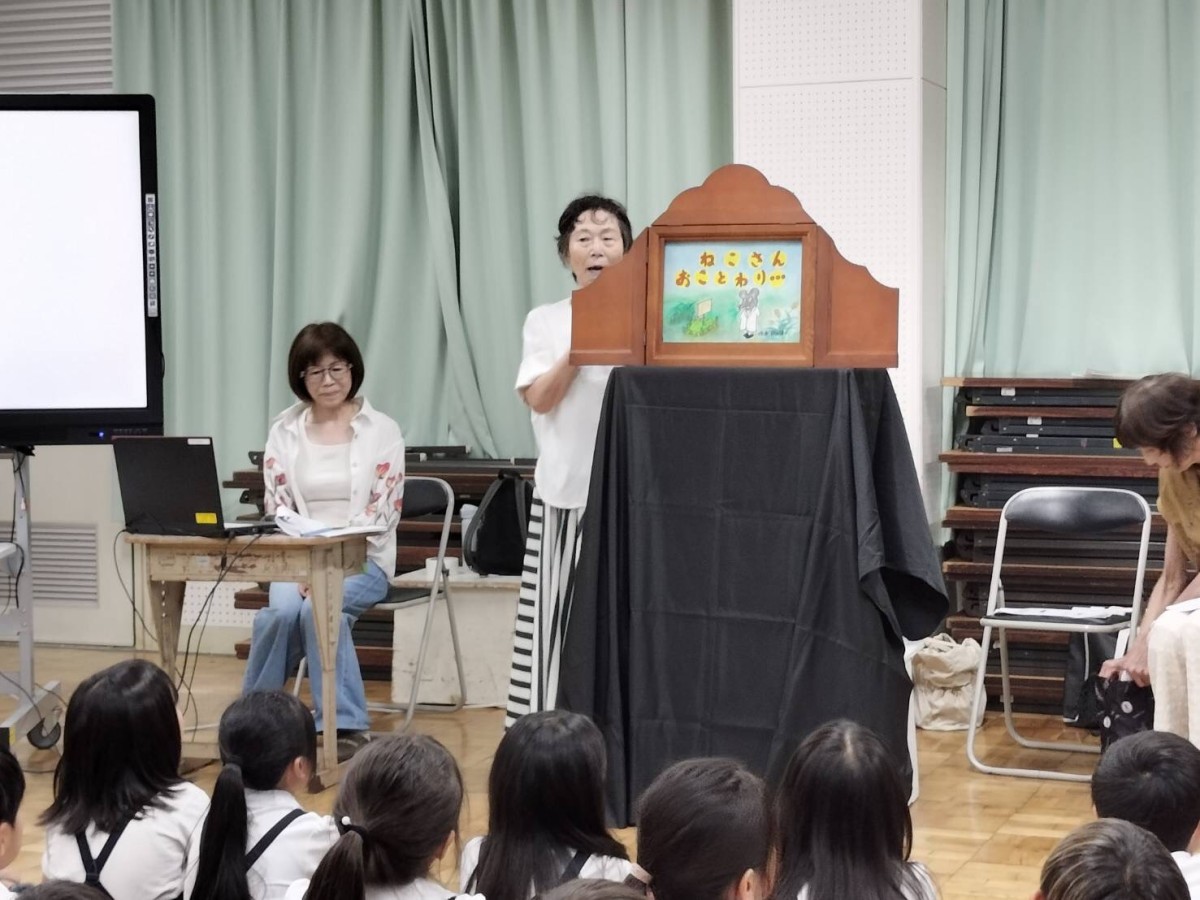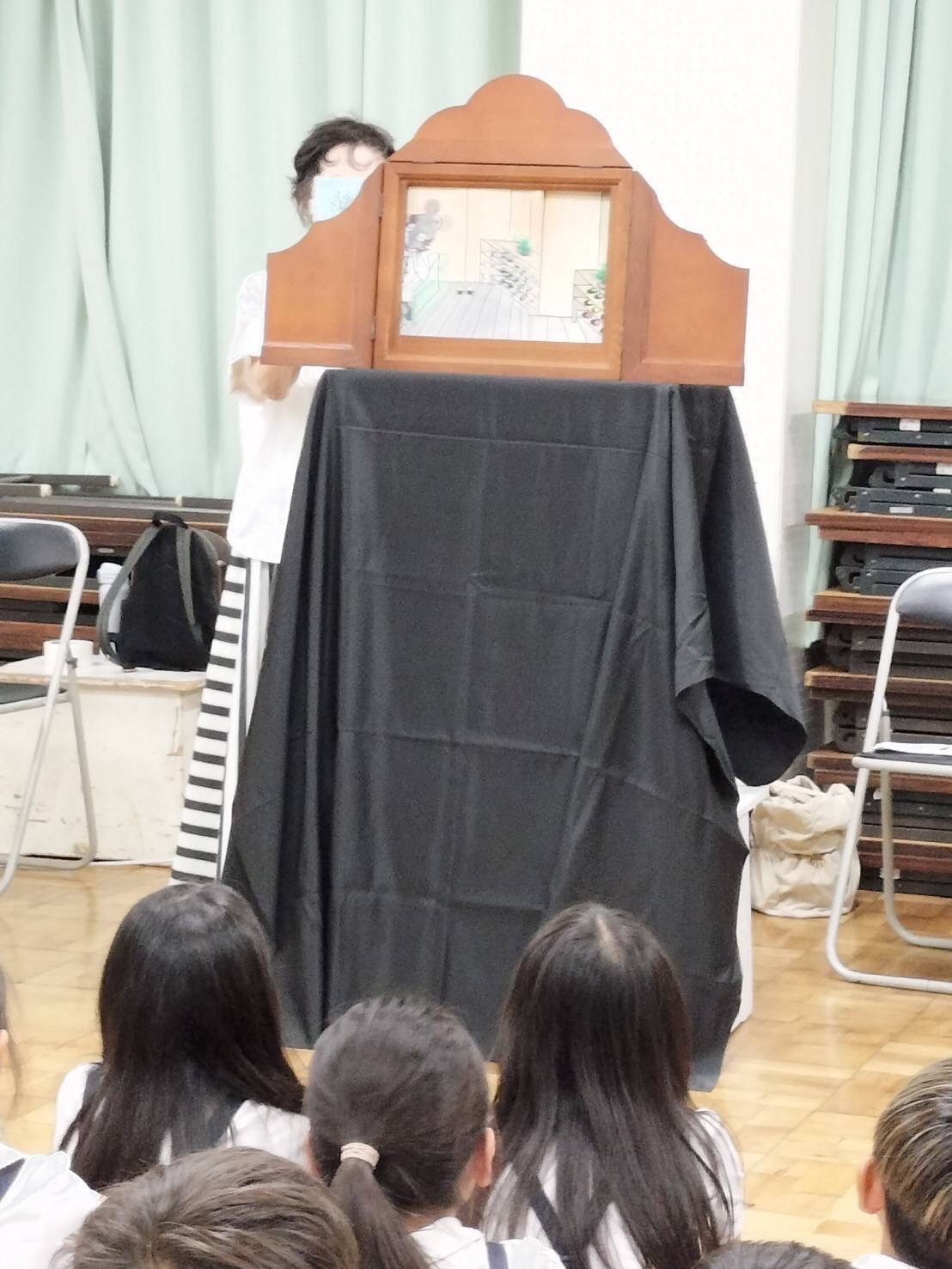3年生は、〈アオバナ探検隊〉と称して青花について学習しています。そこで学んだことを紙芝居にして『山田こども園の子らに青花のことを教えてあげる』という目的を持って、今までにうちわに色を付けたり、青花の民話を聞くなどして学習してきました。9月18日(木)に《手作り紙芝居グループ ぴょんた》の皆様を講師にお迎えして、紙芝居作りについて学びました。まず、【ねこさん おことわり~】という紙芝居の実演をしていただきました。それから、紙芝居作製の手順を細かい点まで説明しながら教えてくださいました。①テーマを考える ②お話を作る ③あらすじを決める ④脚本 ⑤絵を描く ⑥台本を書く ⑦最後の仕上げに「おわり」を書く、続いて演じ方の5つのポイントについて教えていただきました。①練習(下読み) ②声 ③間(ま) ④抜き方 ⑤舞台 というように、それぞれのポイントを紙芝居で実演しながらわかりやすく説明してくださいました。集中して聴いていた子ども達。「細かい所まで教えて貰って、頭がパンパンになりました」とか「走る方向と紙を抜く方向が同じで勉強になりました」「(始まりの)拍子木にビックリしました」と、熱心に聴いていた様子で感想を述べていました。この日学んだことをもとに、グループで紙芝居を作る計画ですが、果たしてどんな紙芝居が出来上がりますやら。とっても楽しみです。作製後は11月に山田こども園を訪問して園児達と交流する予定をしています。これからの子ども達の創意溢れる紙芝居作りを応援したいものです。