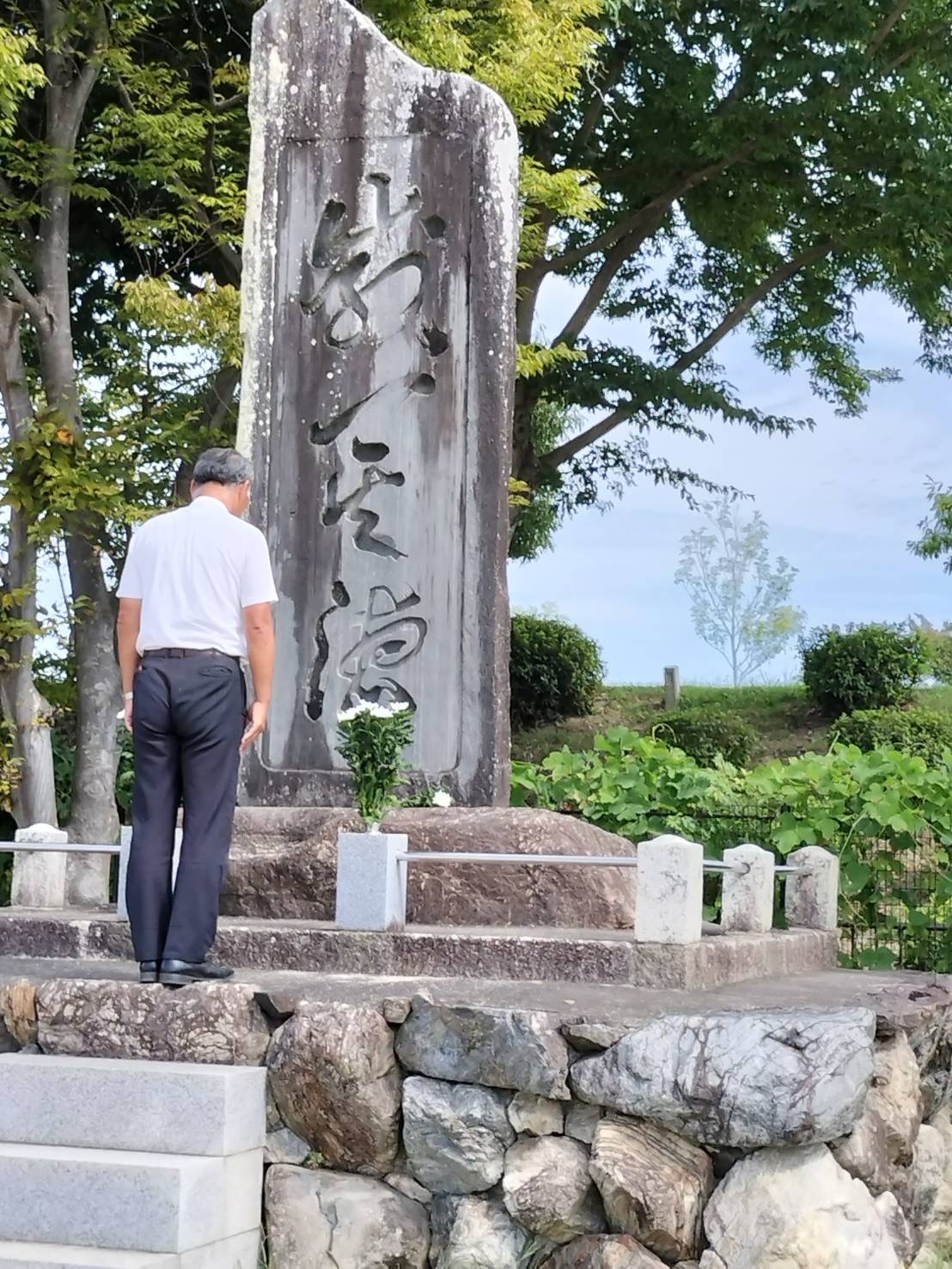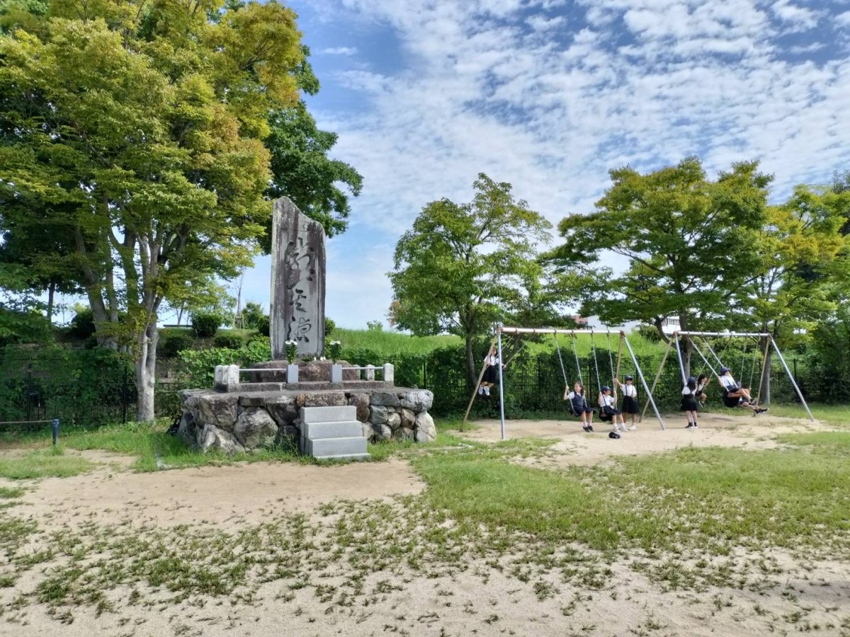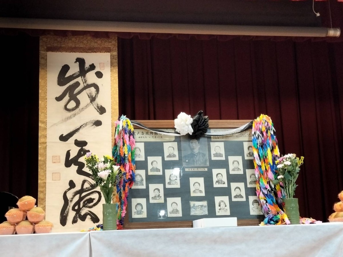 ない事です。今ではもう、体験を語ってくださる方も無く、伝え聞いた惨状を後の世代に伝えていくしかありません。子ども達にとっては、怖い話、悲しい歌です。でも、思いがけない災害の起こる現在、防災に心がけることや自他の生命を大切にすることを考えるきっかけのひとつにするために必要な行事であると思います。慰霊式終了後、グランドにある慰霊碑に校長先生と来賓の方々が献花されました。慰霊碑の隣では、女の子達が元気にブランコに興じていました。この子らがずっと笑顔て居られる日々が続くことを祈らずにはいられません。