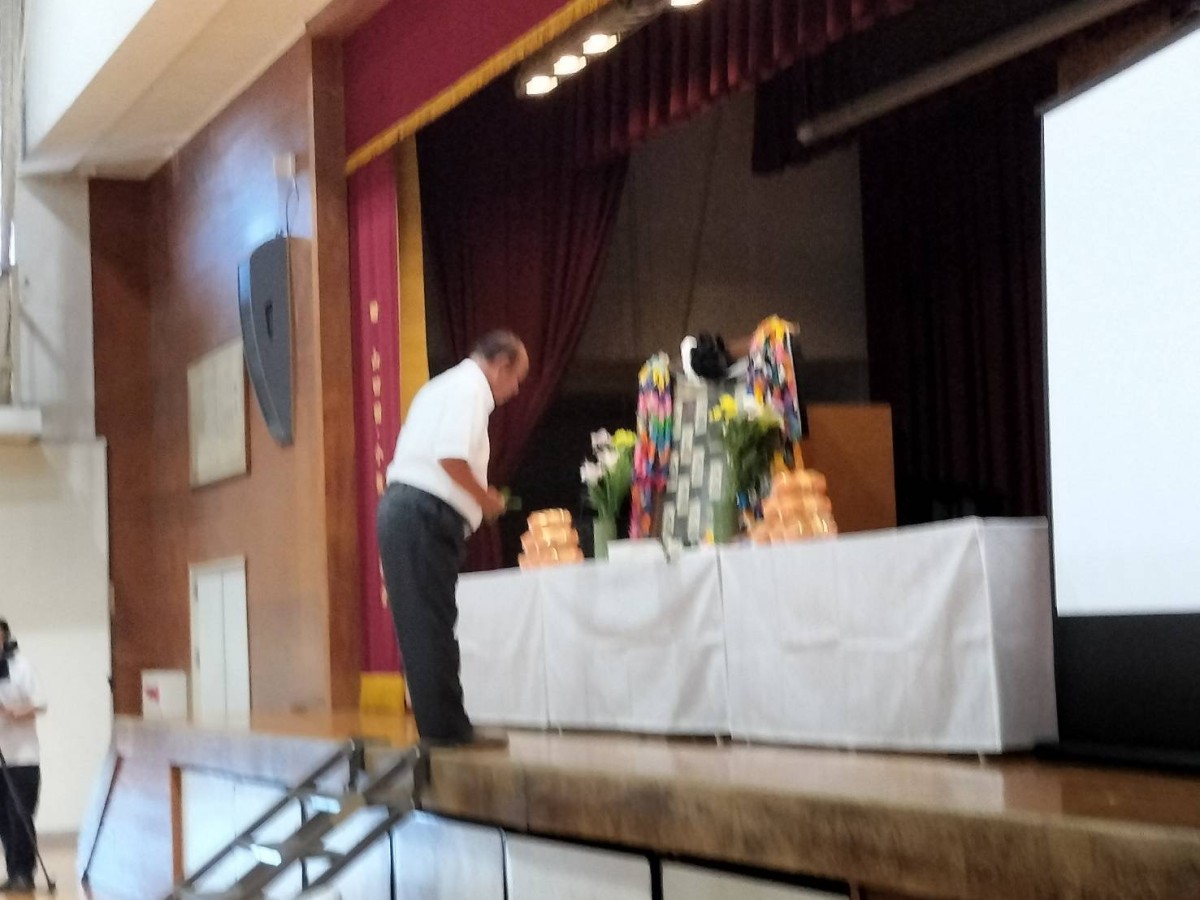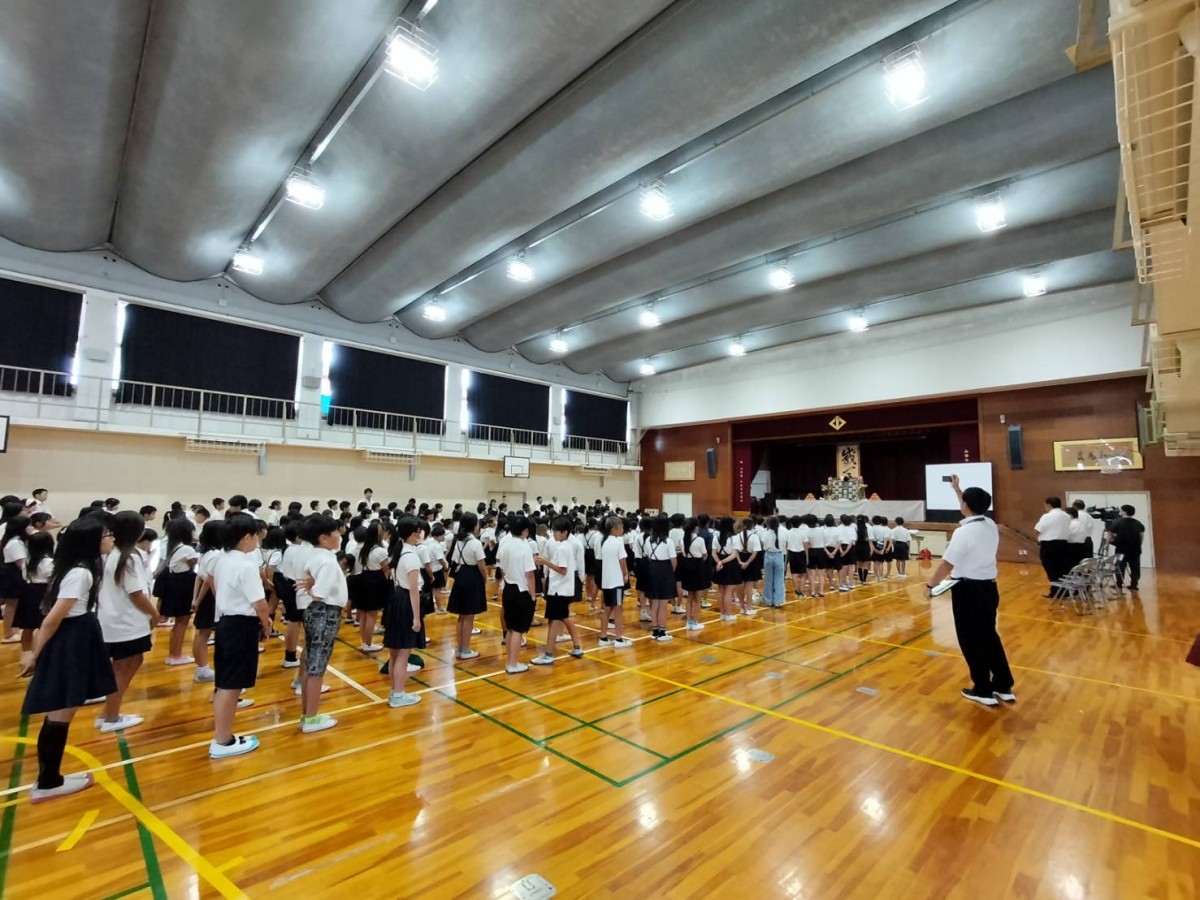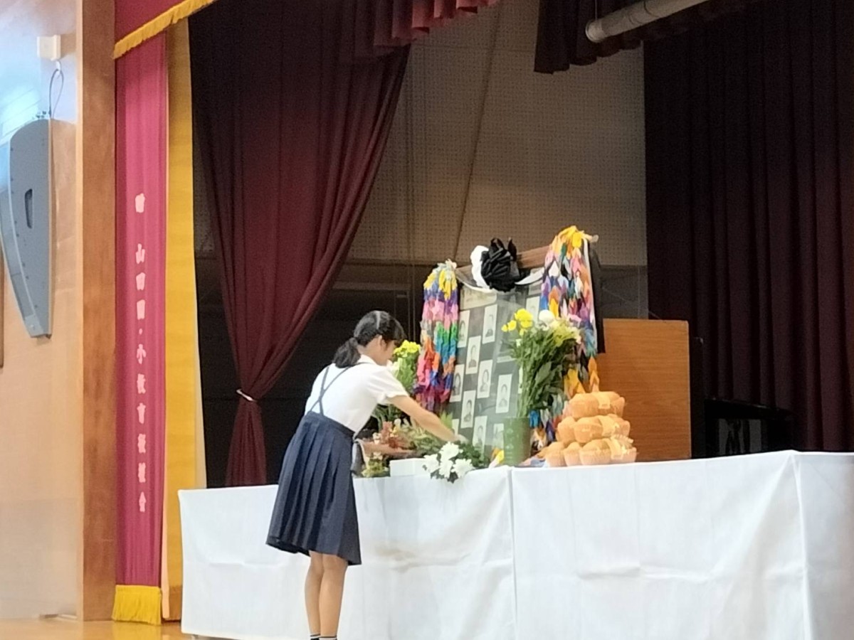 9月19日(金)、室戸台風殉難慰霊式が催されました。今年は冷房の効いた涼しい体育館で、地域代表の来賓の方々をお迎えして、厳かに粛々と進められました。全員で黙祷を捧げた後、校長先生を始めとして来賓の方々、各学年代表児童の献花をしました。1934年、情報を得る手段があまりなかった時代に、校舎が倒壊し、教員と児童合わせて18名が犠牲になったという痛ましい出来事の話を聞きました。90年経った今も忘れてはなら