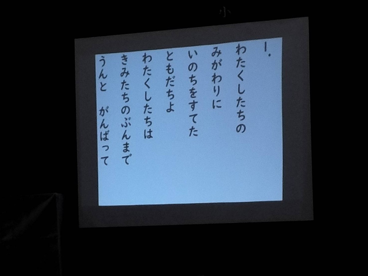 ♪わたくし達の身代わりに命を捨てた友達よ わたくし達は君達の分までうんと頑張って~♪これは山田小学校で代々歌い継がれてきた【学友の霊に捧げる歌】です。もの悲しいメロディーの歌ですが、山田小の卒業生は誰でも口ずさめるのではないでしょうか