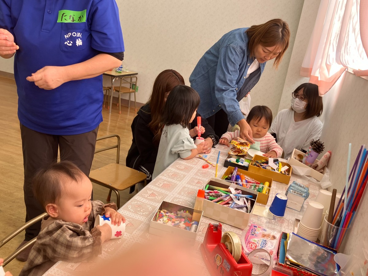 今回のメインは”手作りおもちゃ”「ピョーンと飛び出すロケット」「紙皿で作ったコマ」「松ぼっくりや 落ち葉を使った3人姉妹の置物」も完成。これは大変な大作で、親子で力を合わせて作り上げた際には、歓声が上がりました。