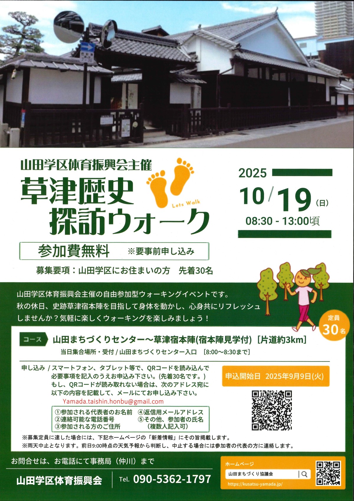 山田学区体育振興会主催の自由参加型ウオーキングイベントです。秋の休日、史跡草津宿本陣を目指して身体を動かし、心身共にリフレッシュしませんか?気軽に楽しくウオーキングを楽しみましょう!